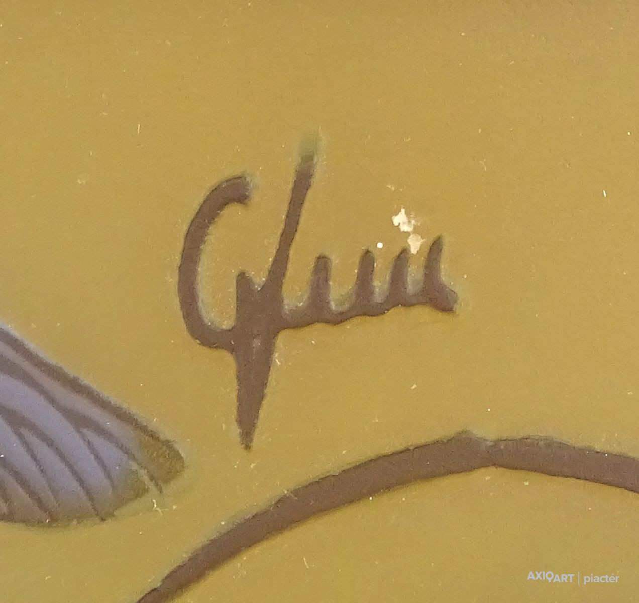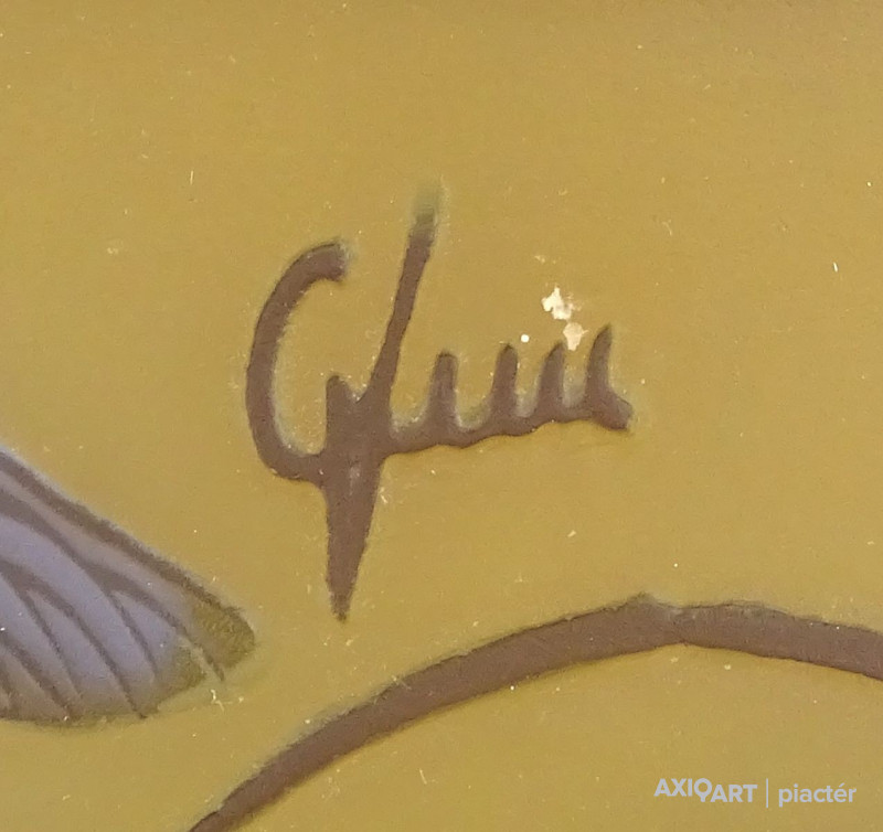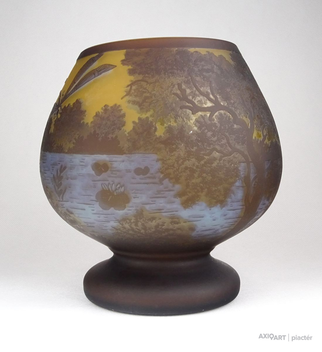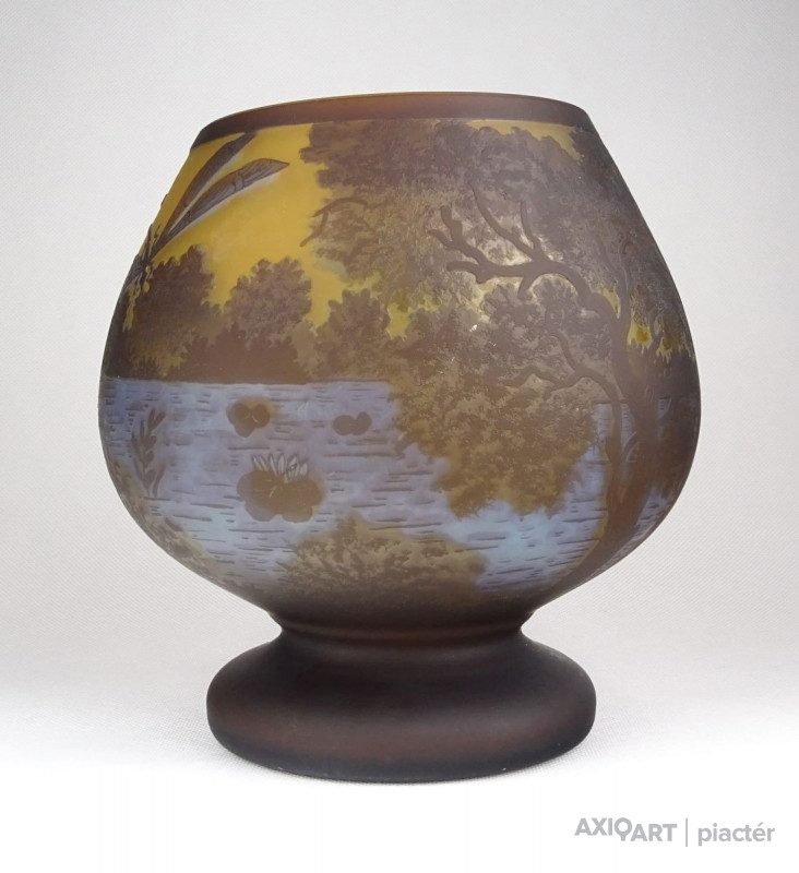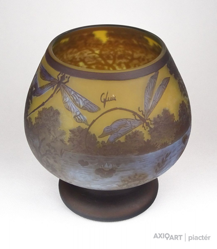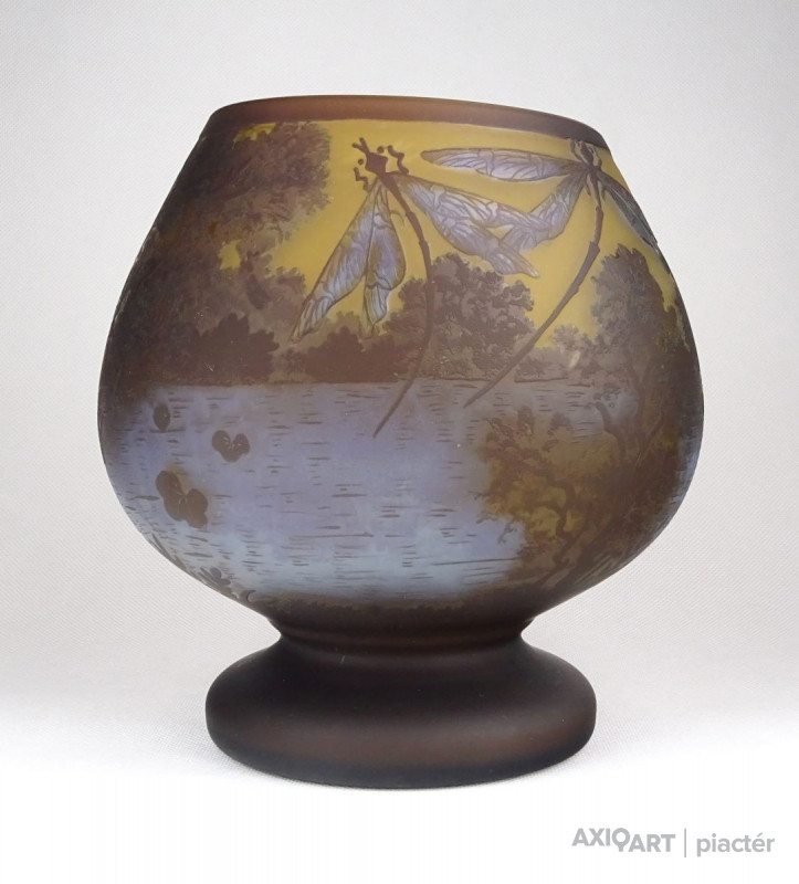 Antik, szép állapotú, többrétegű jelzett Art Nouveau üveg váza, díszváza. A váza szitakötőkkel díszített. Oldalán jelzés, lásd fotó. A vázatest oldalán furat található, lámpává alakítható.