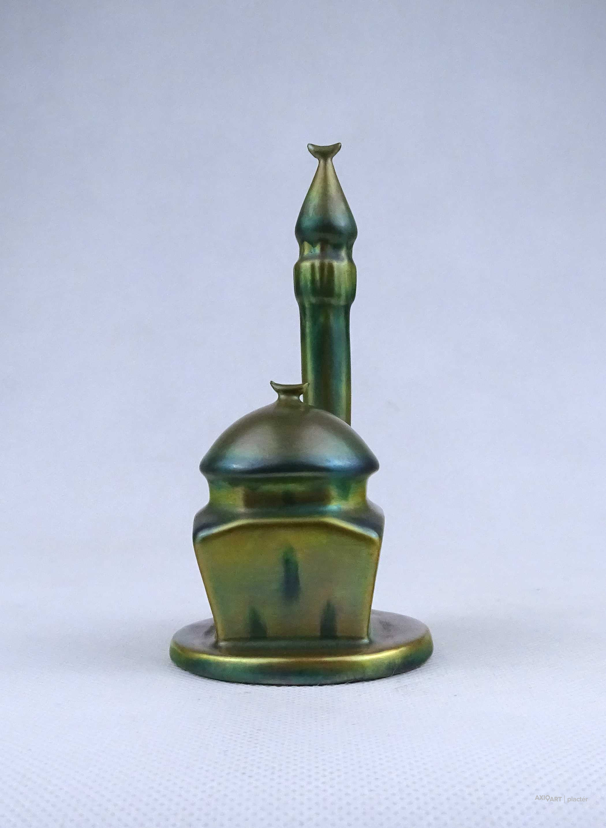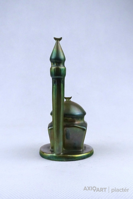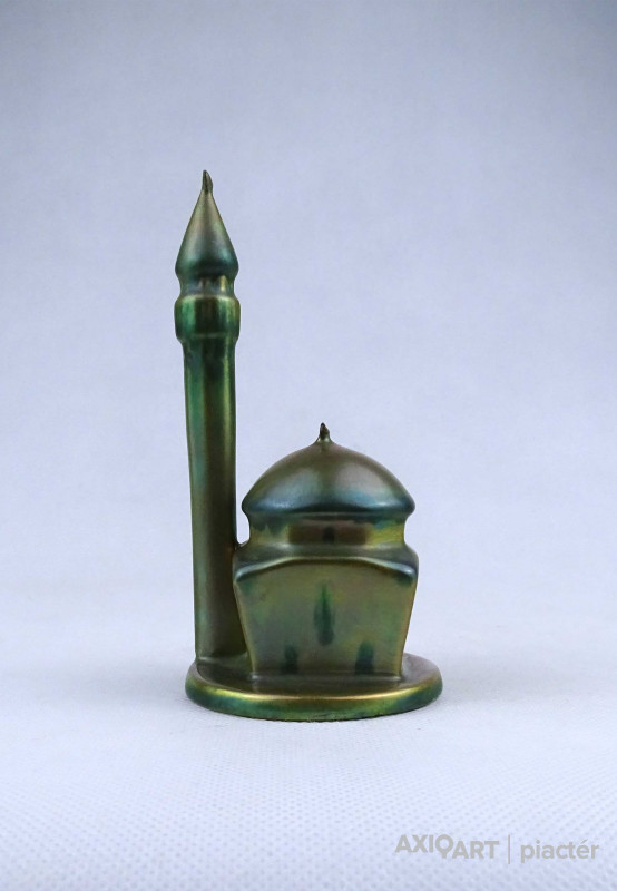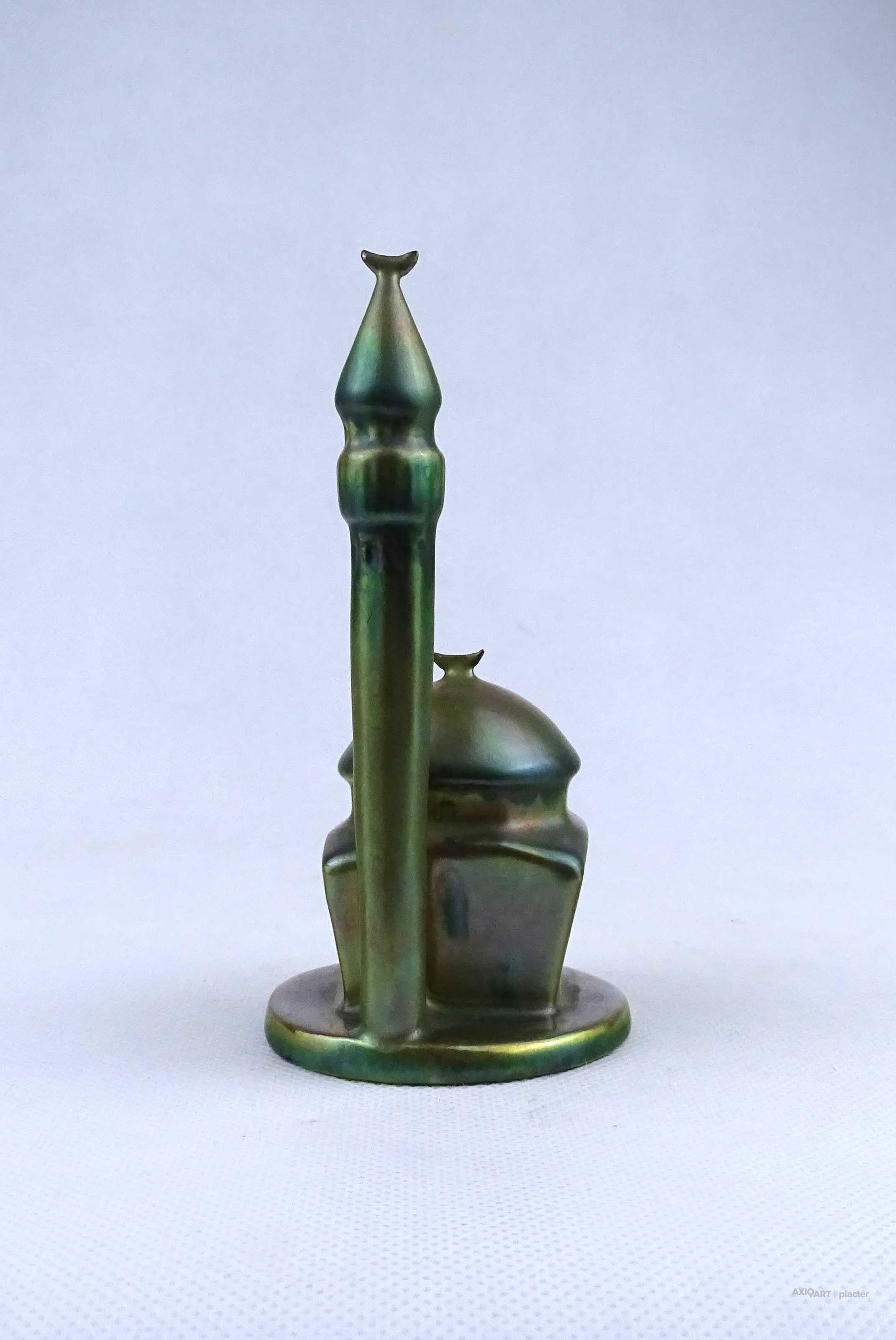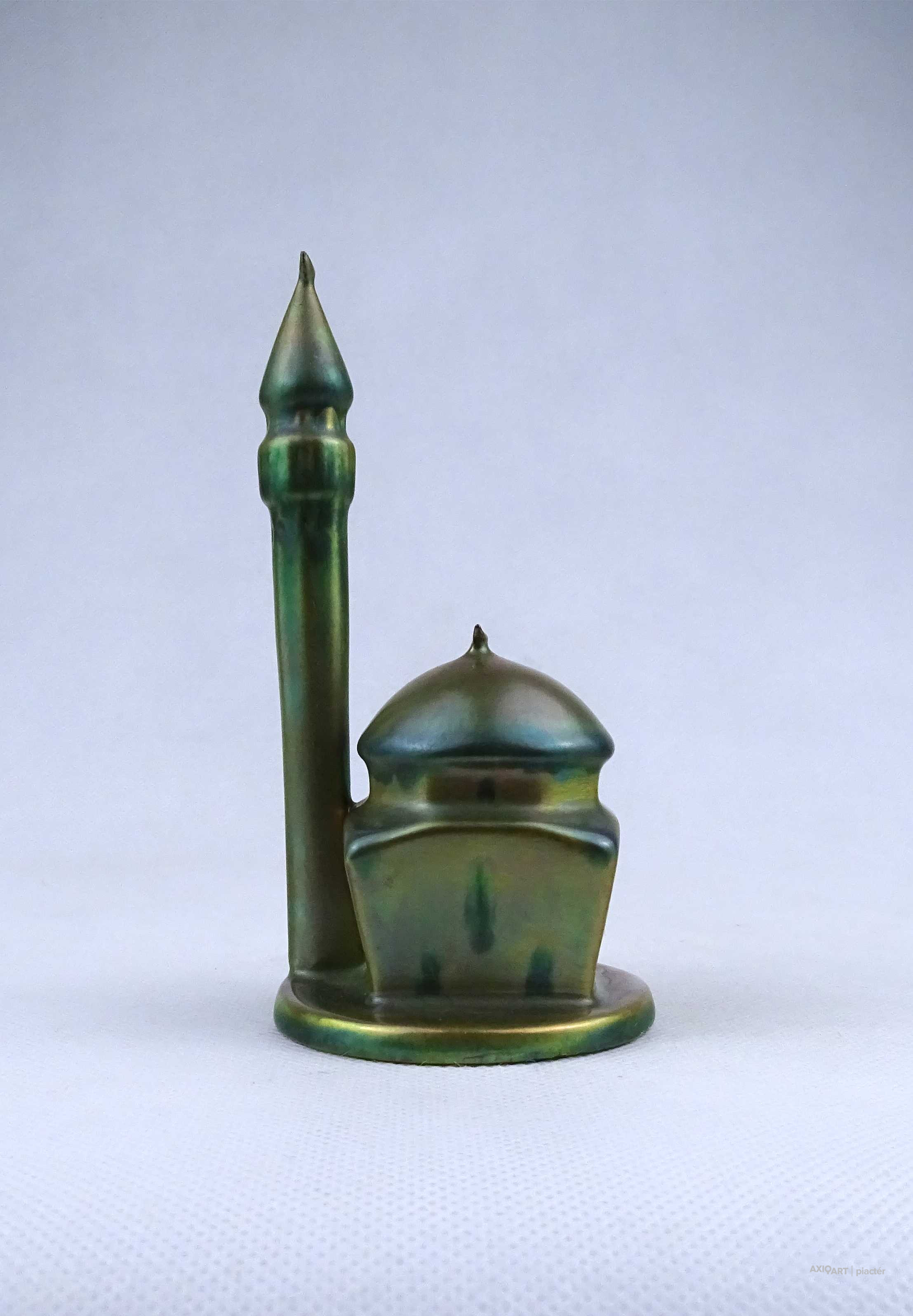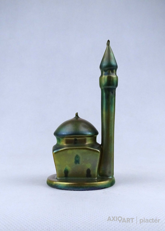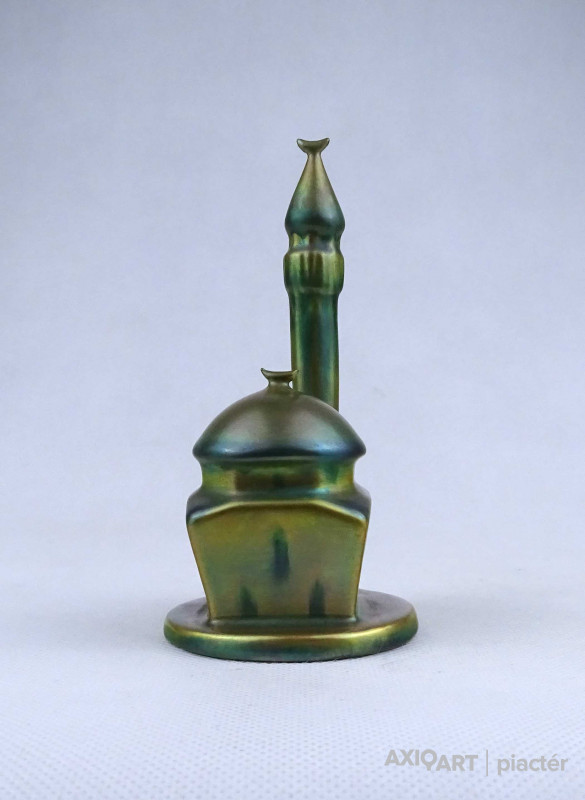 Hibátlan állapotú, jelzett zöld eozin mázas Zsolnay porcelán dzsámi minarettel.
