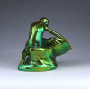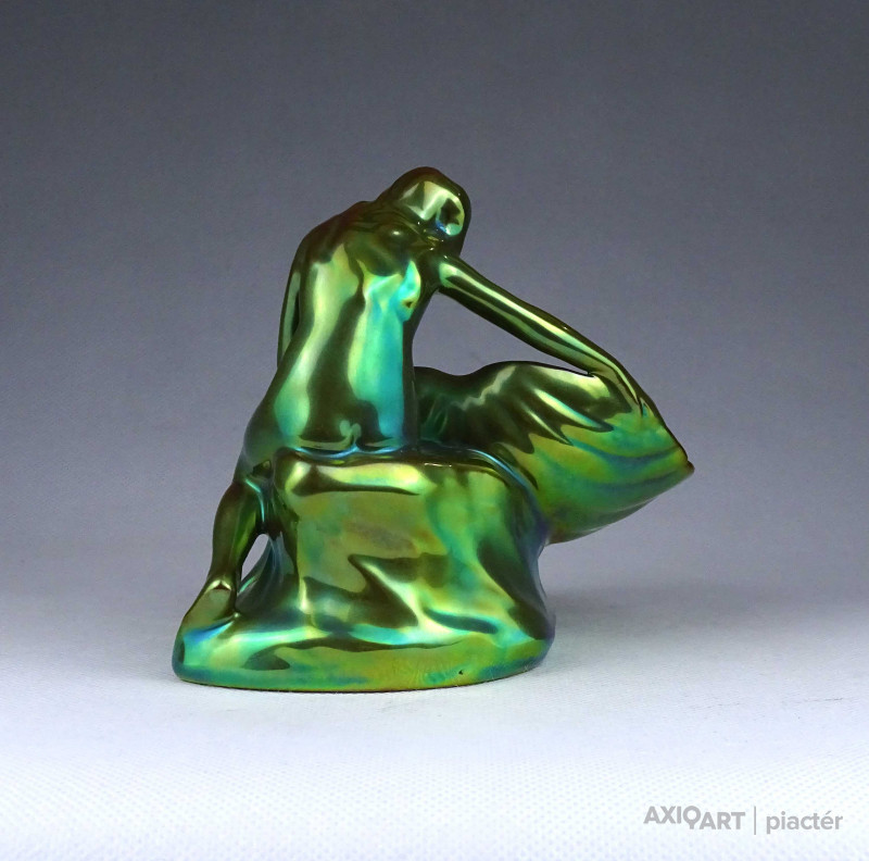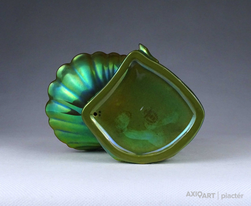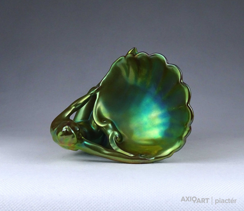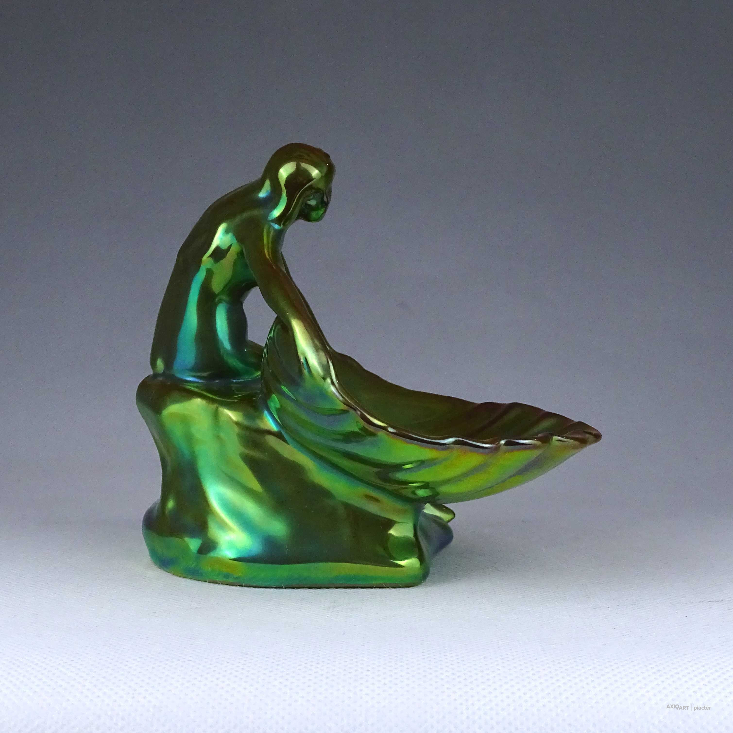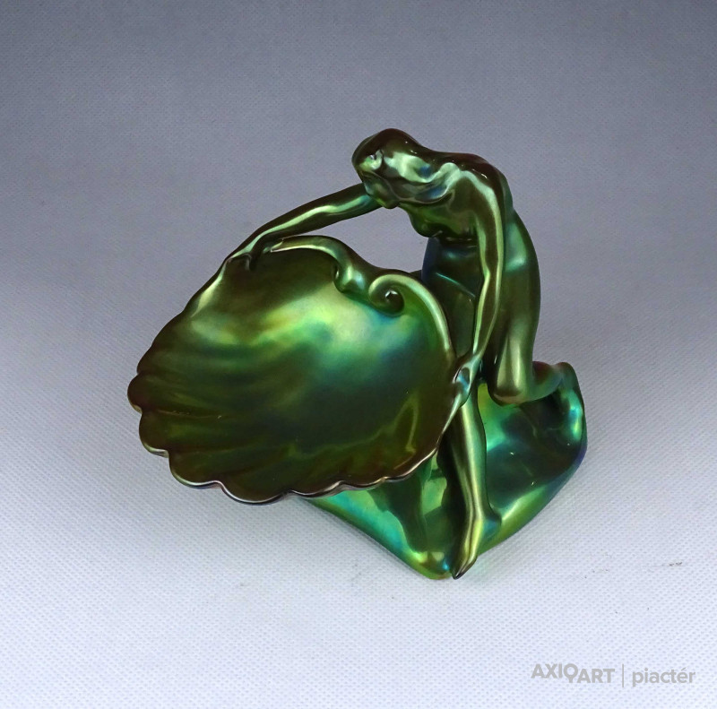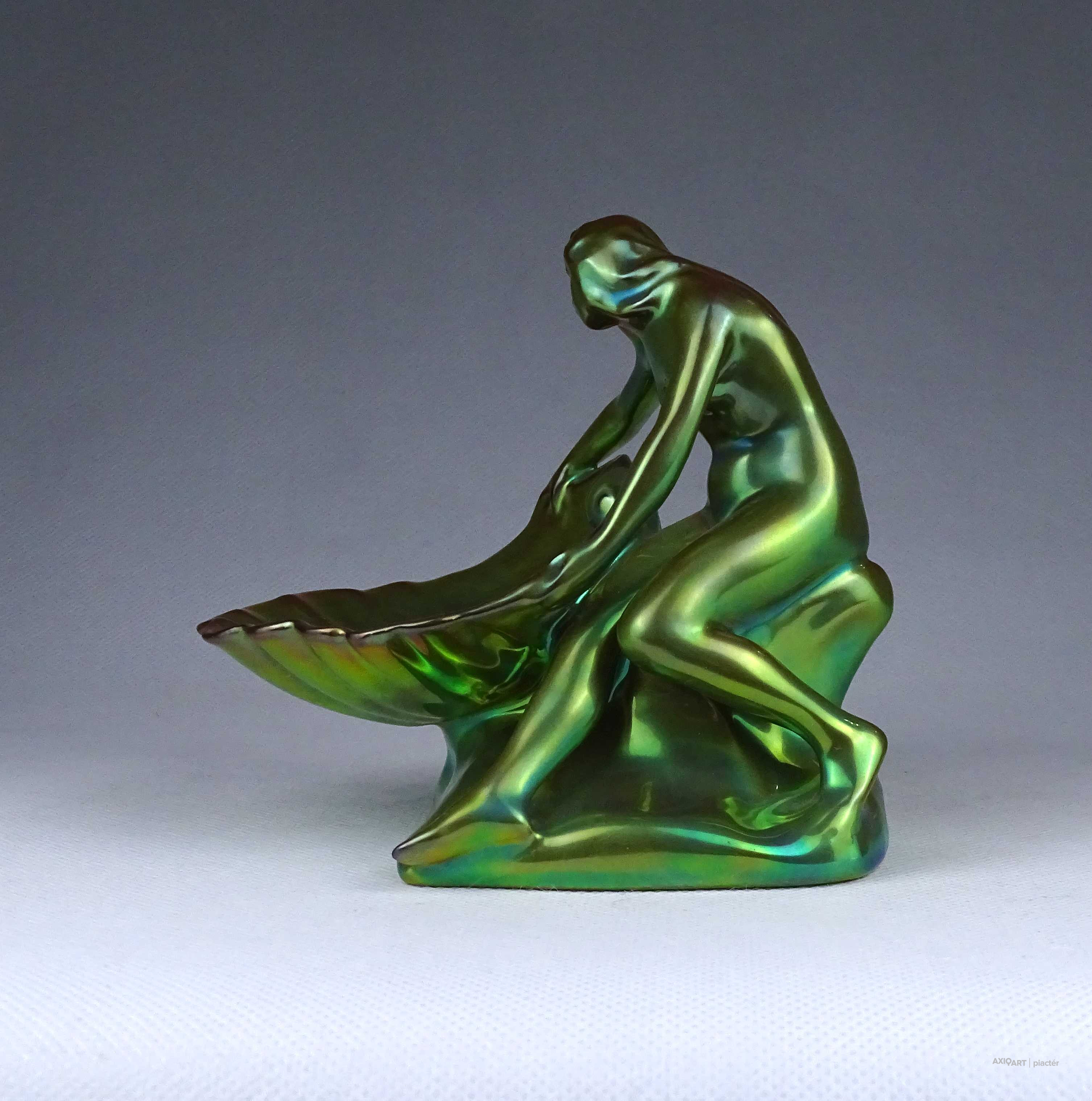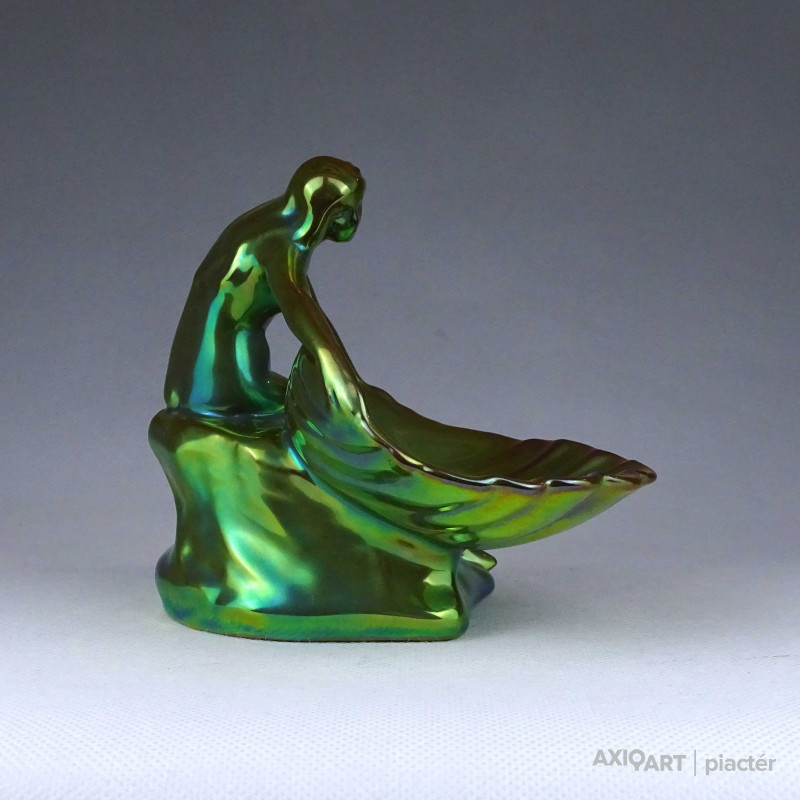 Régi, hibátlan állapotú, zöld eozin mázas, jubileumi jelzéses Zsolnay porcelán, figurális tál, kagylót tartó női akt névjegykártya tartó, íróasztali kellék.