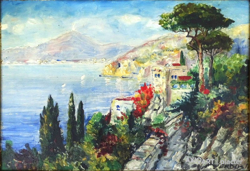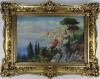 Régi, mediterrán tengerparti tájat ábrázoló olaj karton festmény, hibátlan állapotú, aranyozott blondel keretben. Akasztási lehetőséggel rendelkezik.