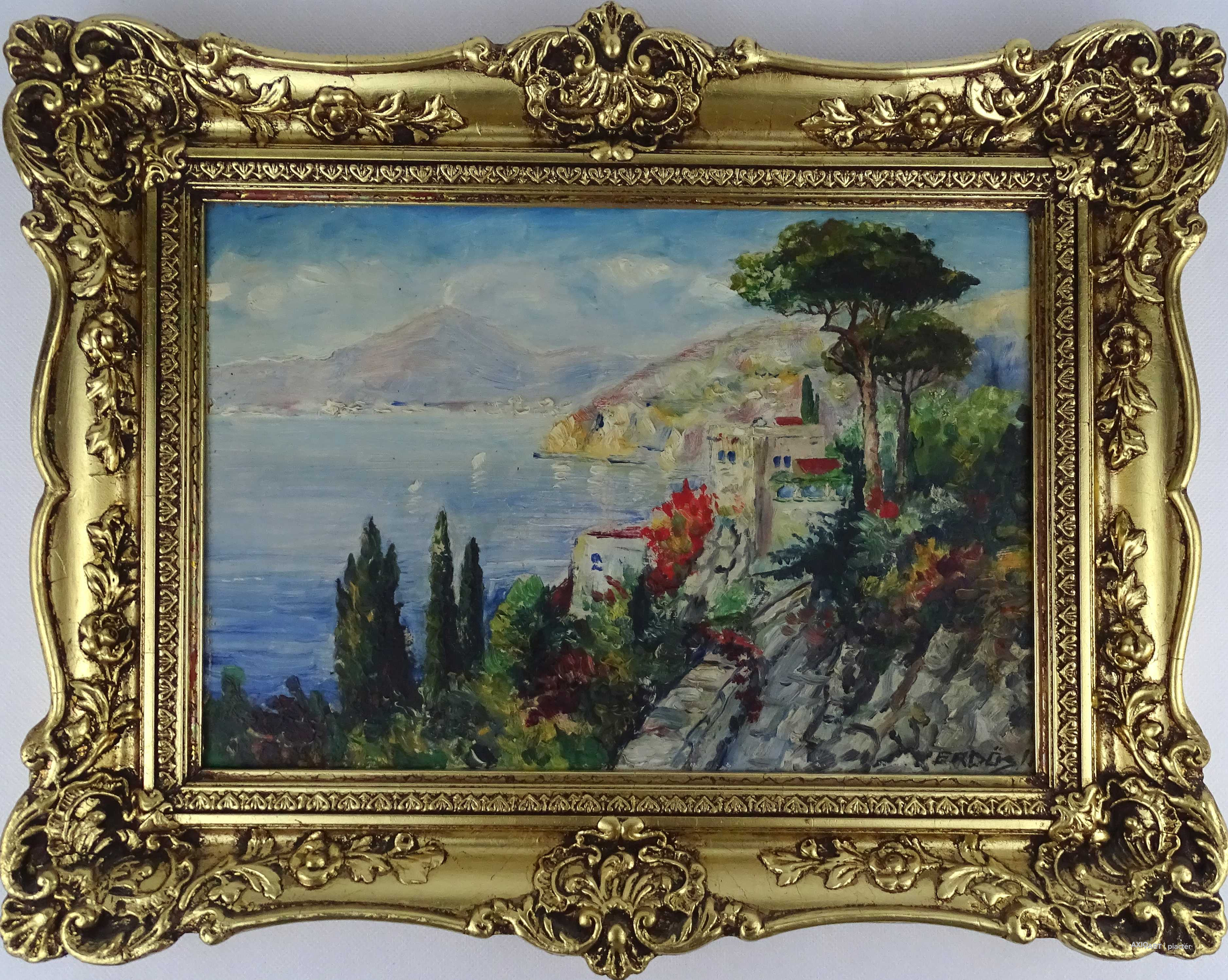 [1Z924/033] Régi, mediterrán tengerparti tájat ábrázoló olaj karton festmény, hibátlan állapotú, aranyozott blondel keretben. Akasztási lehetőséggel rendelkezik. Jelezve jobbra lent: ERDŐSI Magasság: 35 cm Szélesség: 44 cm Súly: 1.155 kg