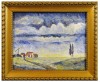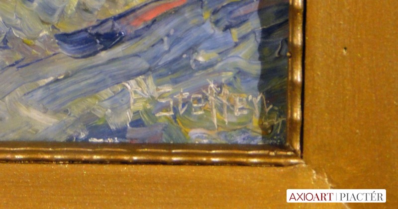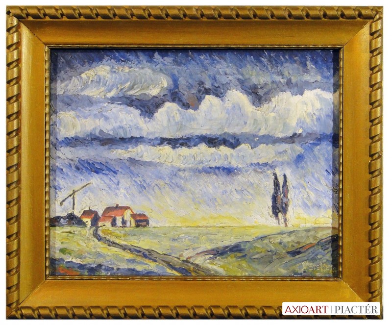 [3209/056] Olaj vászon festmény, szép állapotú keretben, azonnal falra akasztható. Jelzett alföldi táj. Karcolt jelzéssel jobbra lent: ERICH STETTEN 44. Szélesség: 29.5 cm Hosszúság: 37.5 cm