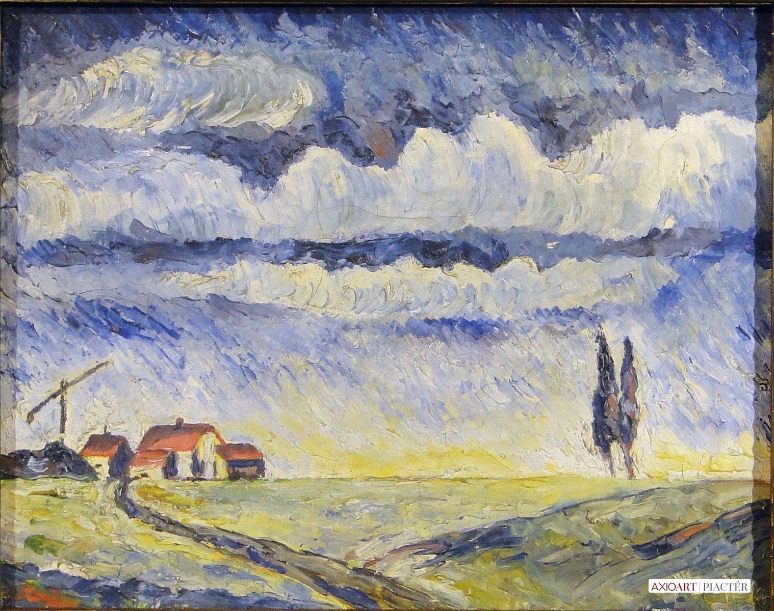 [FK2668/Bp301/4] A kép mérete: 50,5 x 80,5 cm keret nélkül. Készült: Olaj, Vászon A kép Moldován István (Kolozsvár, 1911) alkotása. Jelezve Jobbra lent "Moldován István" A festmény jó állapotban van. Keret: Ép A festmény hátoldalán a Képcsarnokvállalat raglapja láltható. Magyar festők és grafikusok életrajzi lexikona I-II. Festő. Tanulmányait Kolozsvárott, a Szépművészeti Főiskolán kezdte 1930-ban. A következő esztendőben a nagybányai Szépművészeti Iskolában Thorma János és Krizsán János korrektúráján képezte magát. 1931-ben a budapesti Képzőművészeti Főiskola hallgatója lett. Réti István, később Szőnyi István volt a mestere. Már mint főiskolás sok díjat és kitüntetést nyert. 1948-ban megkapta a római ösztöndíjat, de lemondva róla, Erdélybe ment. 1948-1950 között Erdélyben élt, és népművészetben gazdag vidékein festett. 1943-ban Kolozsvárott, 1946-ban Gyöngyösön, 1955-ben, 1959-ben és 1962-ben a Kulturális Kapcsolatok Intézetében, illetve a Csók Galériában rendezett egyéni bemutatókat. Ezen kívül több Európai országban, az USA-ban, Kanadában és Indiában is bemutatta munkáit. Eleinte sajátos atmoszférájú, lírai tájképeket, eleven színvilágú képmásokat festett, később mondernebb, erőteljesebben szerkesztett művekkel jelentkezett. A Pécsi Tanárképző Főiskola számára mozaikot készített. Erdély szerelmese volt. A székely népművészet gazdag formavilágának hatása döntő jelentőségűvé vált sokoldalú művészetében. Műv. díjak: a Szinyei Társaság elismerő oklevele, a Főváros festészeti-díja, "Kolozsvár a képzőművészetben" II. díj, állami ösztöndíj, római ösztöndíj, a Képzőművészek Szövetsége Észak-Magyarországi festészeti díja, SZOT festészeti díj. Több murális művet (mozaik) alkotott. A Magyar Nemzeti Galéria több alkotását őrzi. (M. L.: Műv. 1967/6, RI-NM) Magyar festők és grafikusok életrajzi lexikona I-II. Műgyűjtők és kereskedők kézikönyve Festő. Tanulmányait a kolozsvári Szépművészeti Főiskolán kezdte 1930-ban. A nagybányai szabadiskolában is megfordult. Itt Thorma János és Krizsán János korrektúráján képezte magát. 1931-ben Budapesten a Képzőművészeti Főiskola hallgatója lett. Réti István, később Szőnyi István volt a mestere. Már mint főiskolás sok díjat nyert. 1948-ban megkapta a római ösztöndíjat, de lemondva róla, Erdélybe ment. 1948-1950 k. Erdélyben élt, és népművészetben gazdag vidékein festett. 1943-ban Kolozsváron, 1946-ban Gyöngyösön, 1955-ben, 1959-ben és 1962-ben a Kulturális Kapcsolatok Intézetében, illetve a Csók Galériában rendezett önálló kiállítást. Ezen kívül több Európai országban, az USA-ban, Kanadában és Indiában is bemutatta műveit. Eleinte sajátos atmoszférájú, lírai tájképeket, eleven színvilágú képmásokat festett, később mondernebb, erőteljesebben szerkesztett művekkel jelentkezett. A Pécsi Tanárképző Főiskola számára mozaikot készített. Erdély szerelmese volt. A székely népművészet gazdag formavilágának hatása döntő jelentőségűvé vált sokoldalú művészetében. 1942-ben megkapta a Szinyei Társaság elismerését, és a Főváros festészeti-díjat,1943-ban elnyerte a "Kolozsvár a képzőművészetben" c. díjat. 1947-ben állami ösztöndíjat,1948-ban a római ösztöndíjat, 1972-ben a Képzőművészek Szövetsége Észak-Magyarországi festészeti díját kapta meg. A MNG több művét őrzi. (M. L.: Műv.-1976/6) Magyar festők és grafikusok adattára Tanulmányait Kolozsvárott a Képzőművészeti Főiskolán, majd Nagybányán Thorma János és Krizsán János irányítása mellett kezdte, 1931-től Budapesten megszakításokkal a Képzőművészeti Főiskolán Réti István és Szőnyi István növendékeként fejezte be. 1949-ben és 1950-ben ösztöndíjjal dolgozott Erdélyben, majd hosszú tanulmányutakra indult Nyugat-Európába, az Egyesült Államokba, s a Szovjetunióba. Először Kolozsvárott lépett a nyilvánosság elé 1943-ban, majd 1946-ban Egerben és Gyöngyösön, 1947-ben Miskolcon, 1948-ban Hatvanban, 1955, 1961 és 1981-ben a Csók Galériában, 1959-ben a KKI-ben, 1960-ban Nagykanizsán, 1963-ban Kiskunfélegyházán, 1966-ban Debrecenben, 1969 és 1975-ben Békéscsabán, 1971-ben a Mednyánszky Teremben, 1973-ban Gyöngyösön és Debrecenben, 1977-ben Egerben, 1979-ben Veszprémben, 1983-ban Miskolcon, 1984-ben Csepelen, 1986-ban a Vigadó Galériában rendezett önálló kiállítást. Külföldi kiállításai: Moszkva, Varsó, India, Szófia, Párizs, Bukarest, Belgrád, New York, Montreál és Toronto. Eddig közel kétezer színes táblaképet festett, de szívesen foglalkozik mozaikkészítéssel is. 1964-ben a Pécsi Pedagógiai Főiskola, 1968-ban a Salgótarjáni Kórház, 1969-ben a názáreti templom és 1970-ben a Videoton Vállalat díszterme részére mozaikot készített. - Erdély szerelmese. A székely népművészet gazdag formavilágának hatása döntő jelentőségűvé vált festészetében. Olyan formanyelvet alakított ki magának, amely színvilágában és summázó formaalakításában sajátos erdélyi zamat érződik, ugyanakkor korszerűen modern is konstruktivista stílusa. Munkásságát 1942-ben a Szinyei Társaság elismerésével és a Fővárosi festészeti-díjjal, 1943-ben Római-ösztöndíjjal, 1947-ben Állam ösztöndíjjal (Románai), 1963-ben a SZOT festészeti-díjával, 1972-ben a Képzőművészek Szövetsége Észak-Magyarországi festészeti-díjával tüntették ki. - Irod.: Bíró Béla: Kolozsváry Moldován István. Erdélyi Helikon, 1943.; Felvinczi Takács Zoltán: Kolozsváry Moldován István. Kolozsvár, 1943.; Dutka Mária: Magyar Nemzet, 1961.; Maksay László: Moldován István. Művészet, 1965.; D. Fehér Zsuzsa. Moldován István, Bp. 1971.; Theisler G