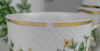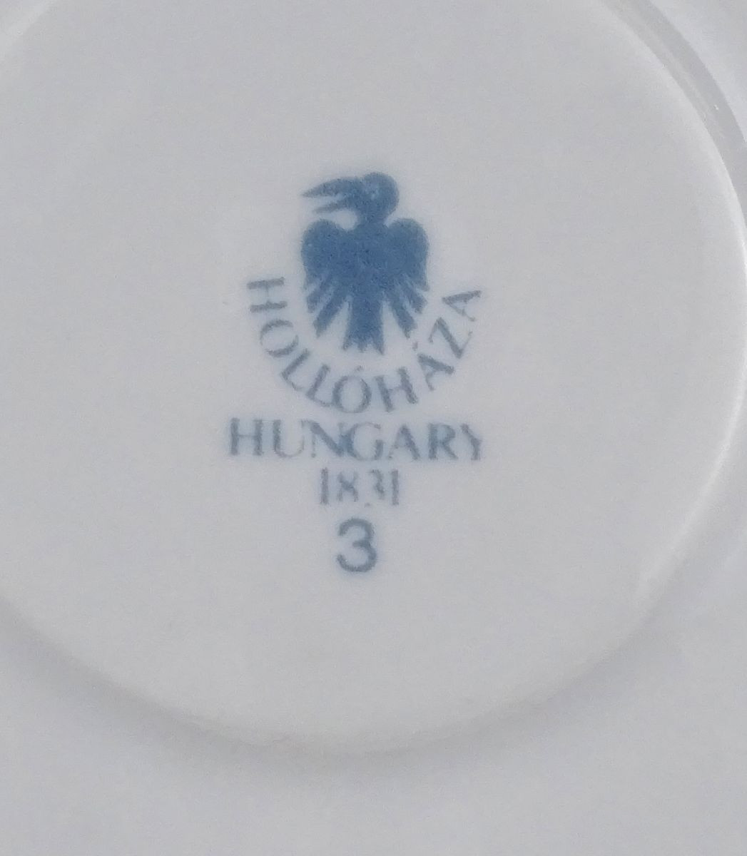 [1R638/X131] Szép állapotú gazdagon aranyozott hat személyes Hollóházi porcelán kávéskészlet. A készlet darabjai: - 1 darab kávéskanna (21.3 x 11 x 15 cm) Rózsáján és talpának peremén kisebb esztétikai hiba található. - 1 darab tejszínes kiöntő (8.8 x 6 x 9.5 cm) - 1 darab cukortartó bonbonier (10.7 x 8 cm) - 6 darab kávéscsésze (6.3 x 6.3 x 8.5 cm) Egyik csészén kisebb hiba található, lásd fotó. - 6 darab alátét tányér (13 cm) Alján kék színű márkajelzés: HOLLÓHÁZA HUNGARY 1831 Súly: 1.895 kg
