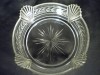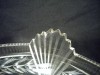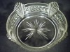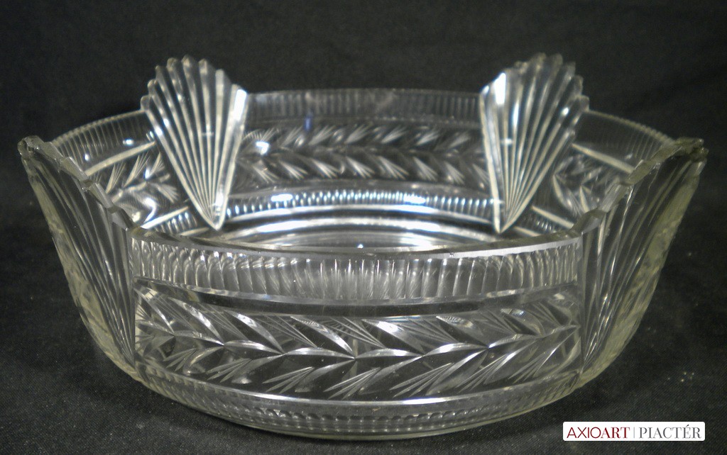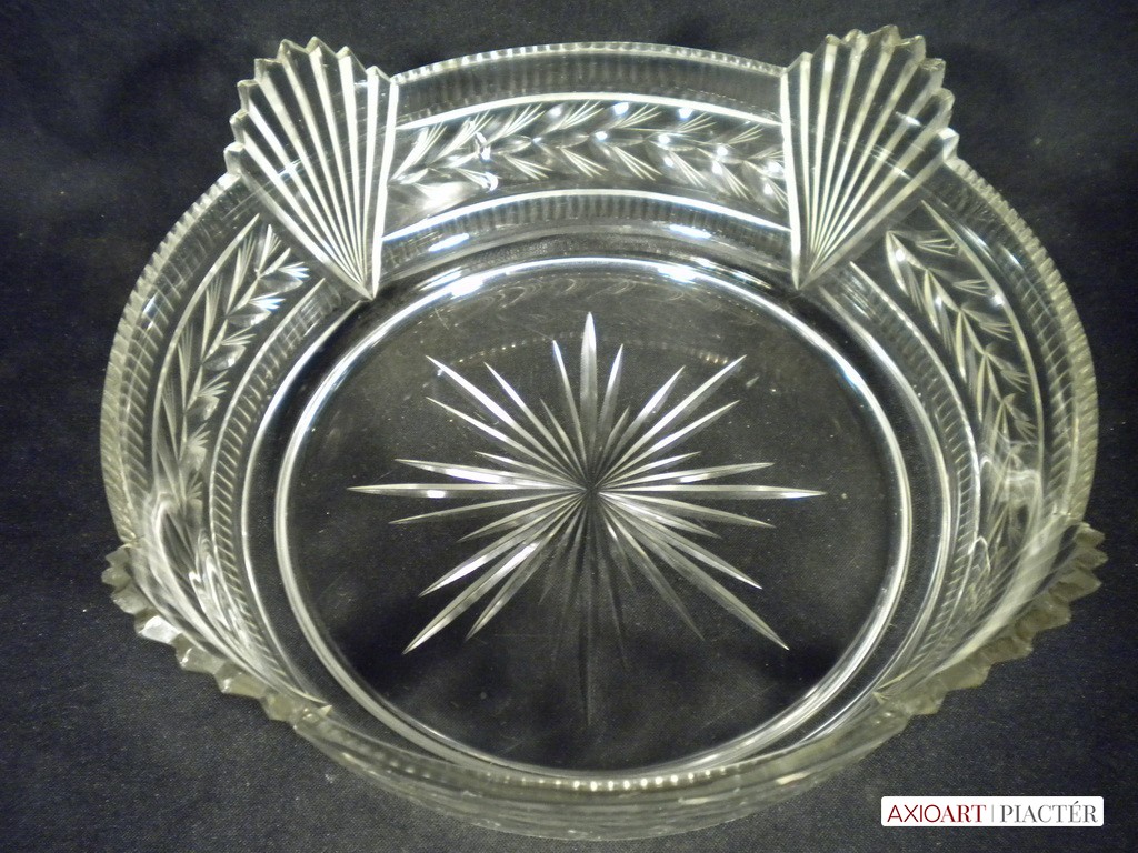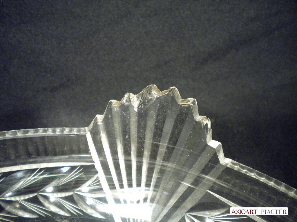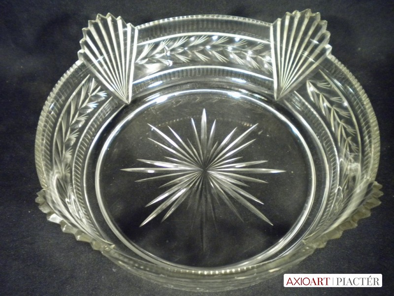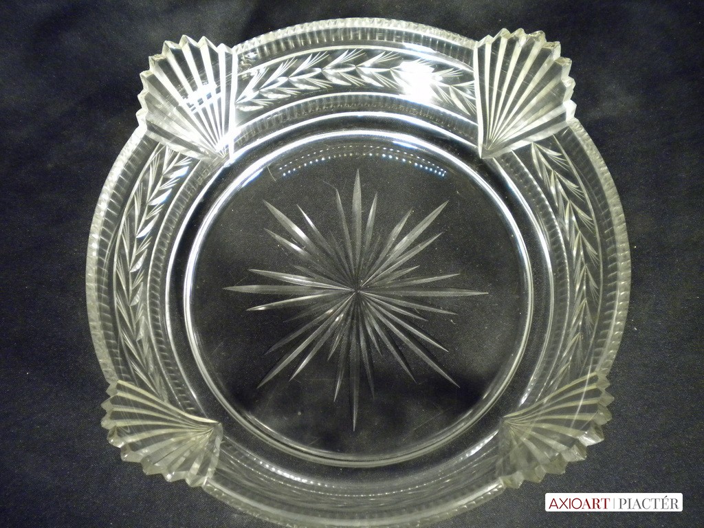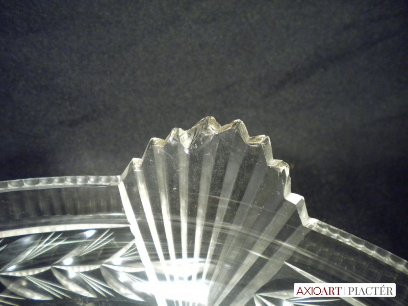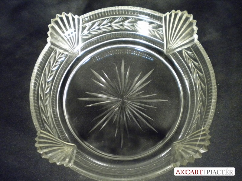 [V099/X041] Csiszolt üvegbetét, a négy pávatoll díszénél kisebb lepattanások vannak. Szélesség: 23.8 cm Méret: A betétbe való átmérő 18 cm, külső pereménél 23,8 cm.