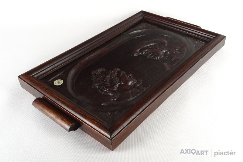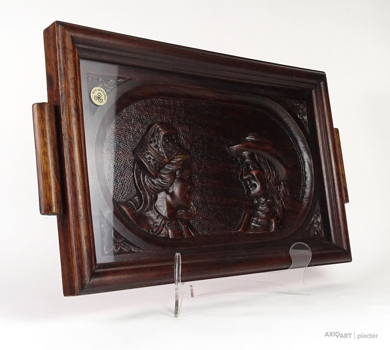 Erős, masszív faragott fa tálca üveg lappal. Az üveglap alatt egy részletgazdag férfi és női faragott fej, házaspár látható.