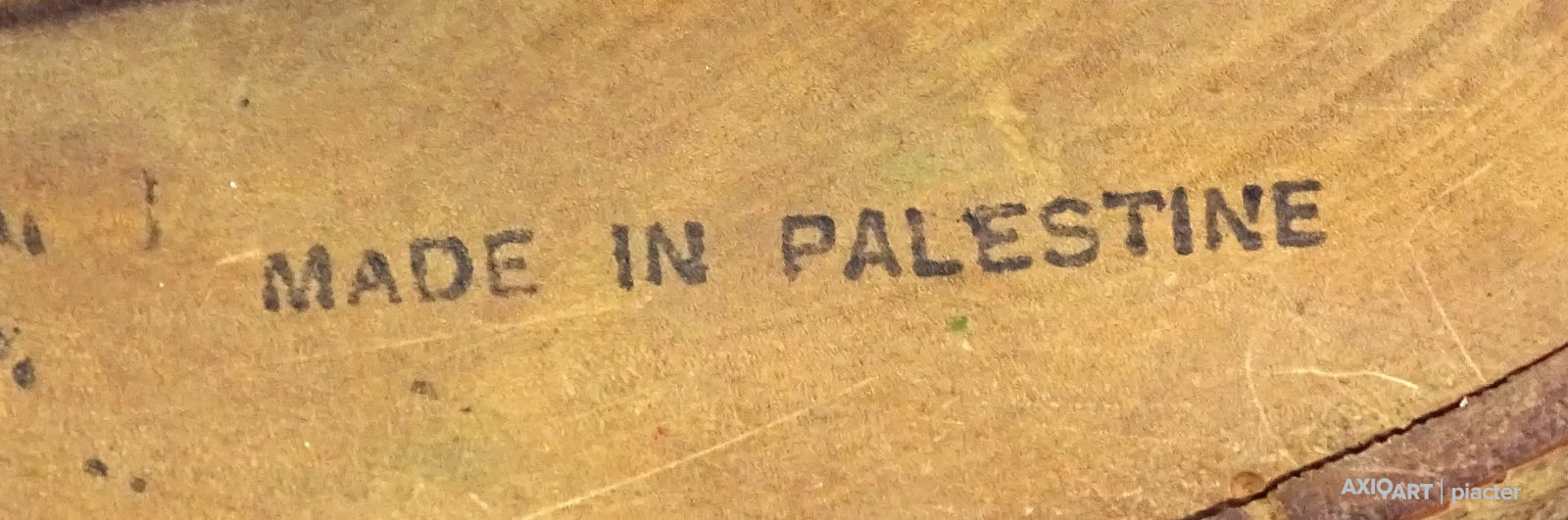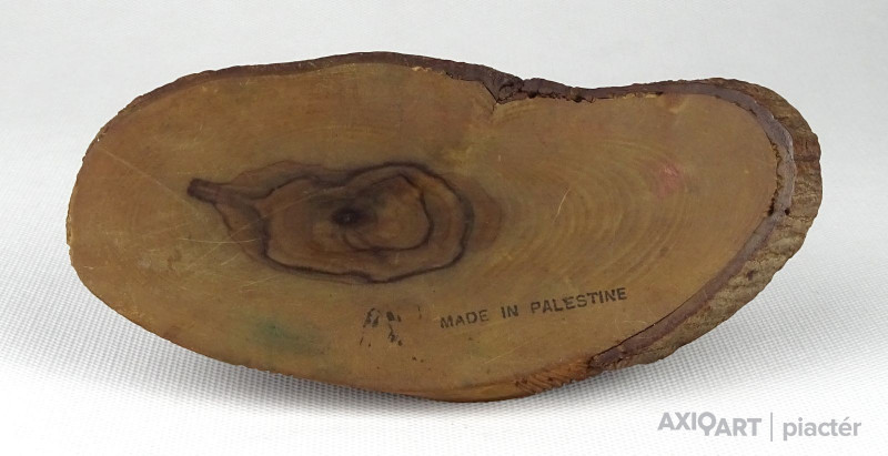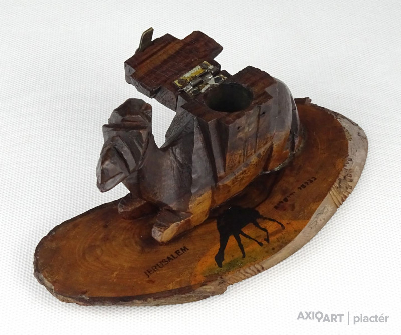 [1Q754/X075] Régi faragott ülő, fekvő fa teve, dromedár talapzaton. Kalamáris, tintatartó, a teve púpja felnyitható. A talapzaton festett teve alak mellette felirat: JERUSALEM Alján jelzés, felirat: MADE IN PALESTINE Magasság: 7.5 cm Szélesség: 7.5 cm Hosszúság: 16.5 cm Súly: 0.17 kg
