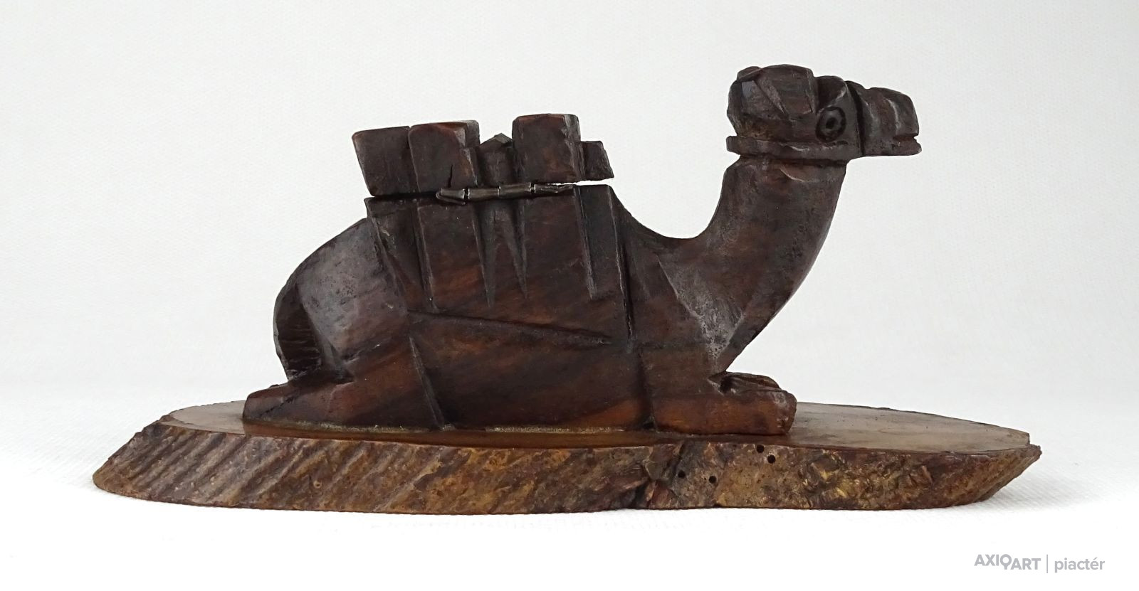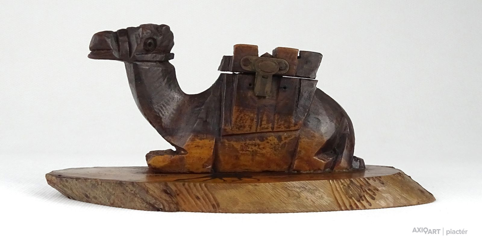 Régi faragott ülő, fekvő fa teve, dromedár talapzaton. Kalamáris, tintatartó, a teve púpja felnyitható.