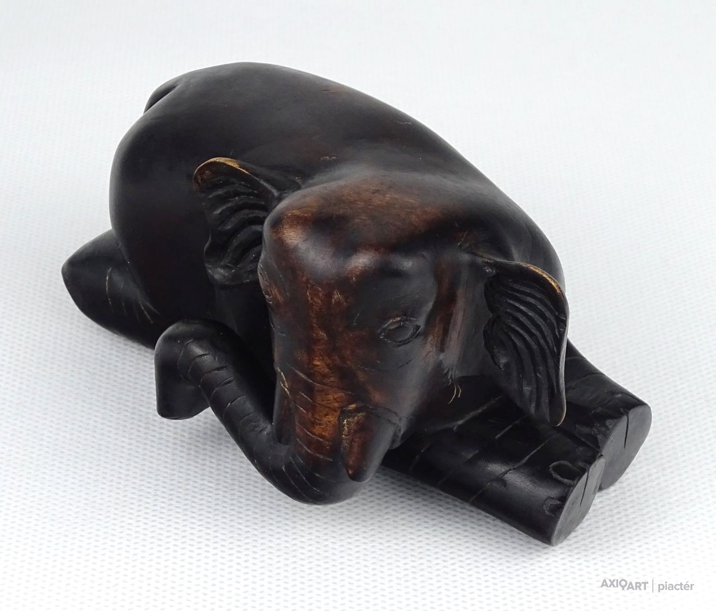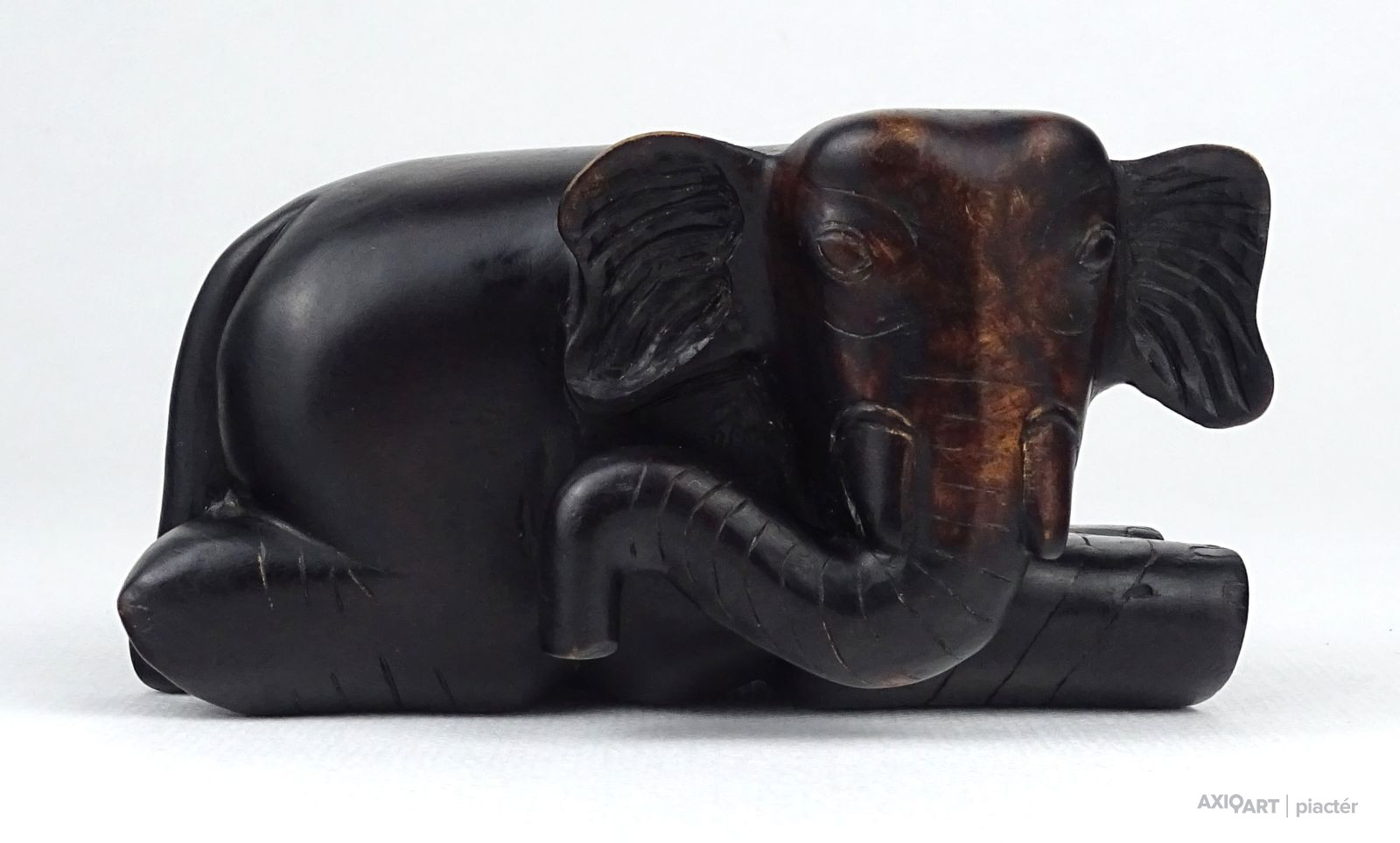 Régi, szép állapotú, faragott keményfa fafaragás. Hason fekvő elefánt szobor.