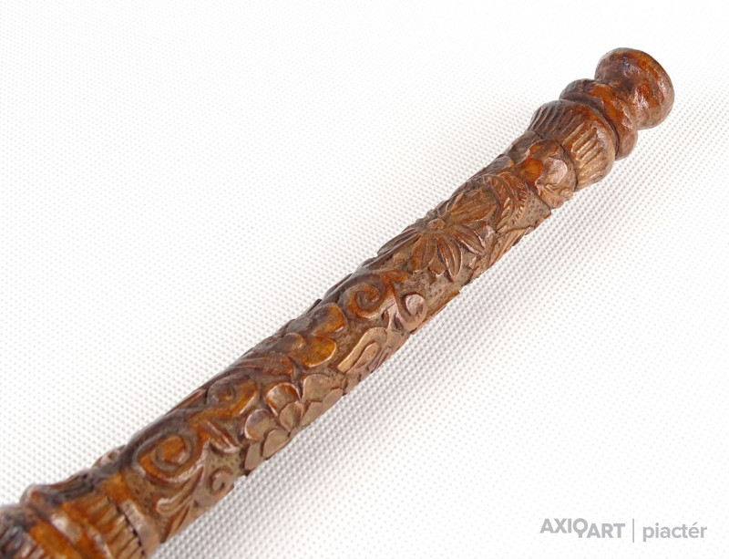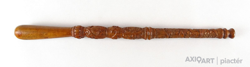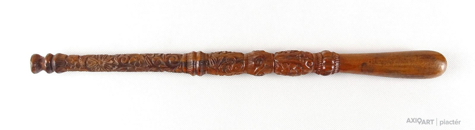 [1A903/X250] Antik, faragott, gazdagon díszített rövid fa pálca. Kapoli Antal jellegű fafaragás. Ritka, gyűjtői darab! Hosszúság: 47 cm Súly: 0.14 kg Kapoli Antal, idősebb és ifjabb (Gyalán, 1867–Somogyhárságy, 1957, Gyalán, 1895–1971) apa és fia, mindketten juhászok és faragók. Id. K. A. 1955-ben Kossuth-díjat kapott. Mindketten Somogyban, Baranyában éltek. A → dunántúli pásztorművészet hagyományaiból indulva sajátos díszítőstílust alakítottak ki. Készítettek → juhászkampókat, szaru → sótartókat. Id. K. A.-nak már a múlt század végén kiegészítő kereseti forrása volt a faragás. A más társadalmi rétegek számára készített munkák közt találunk székeket, fogasokat, sétapálcákat, díszkürtöket, kobakokat, később díszdobozokat. Mindketten dolgoztak → karcolt díszítéssel, → domború faragással és különféle színezési eljárásokkal. Karcolt és faragott munkáikra egyaránt zsúfolt, az egész felületet betöltő virágornamentika jellemző, az indák közt jelenik meg a juhász, vadász, betyár, szarvas, kutya stb. alakja. – Irod. Domanovszky György: A két faragó K. (Bp., 1955). Idősebb Kapoli Antal botfaragás közben (Magyarlukafa, Baranya m.)   Kapoli Antal egyik csontfaragványa. Szarukürt részlete karcolt és sárgított díszítéssel (Somogyhárságy, Baranya m.)   Egy darab fából faragott nagyméretű ládika, lapos domborműves díszítéssel. 1904-ben Kapoli Antal készítette saját faragófelszerelése számára (Somogyhárságy, Baranya m.) Bp. Néprajzi Múzeum   Kapoli Antal önarcképe menyasszonyával faragott sótartón (Homokszentgyörgy, Somogy m., 1892) Bp. Néprajzi Múzeum   Kapoli Antal által készített kürt (Somogyhárságy, Baranya m., 1932) Bp. Néprajzi Múzeum   Kapoli Antal szobra Boglárlellén Forrás: http://mek.oszk.hu/02100/02115/html/3-68.html