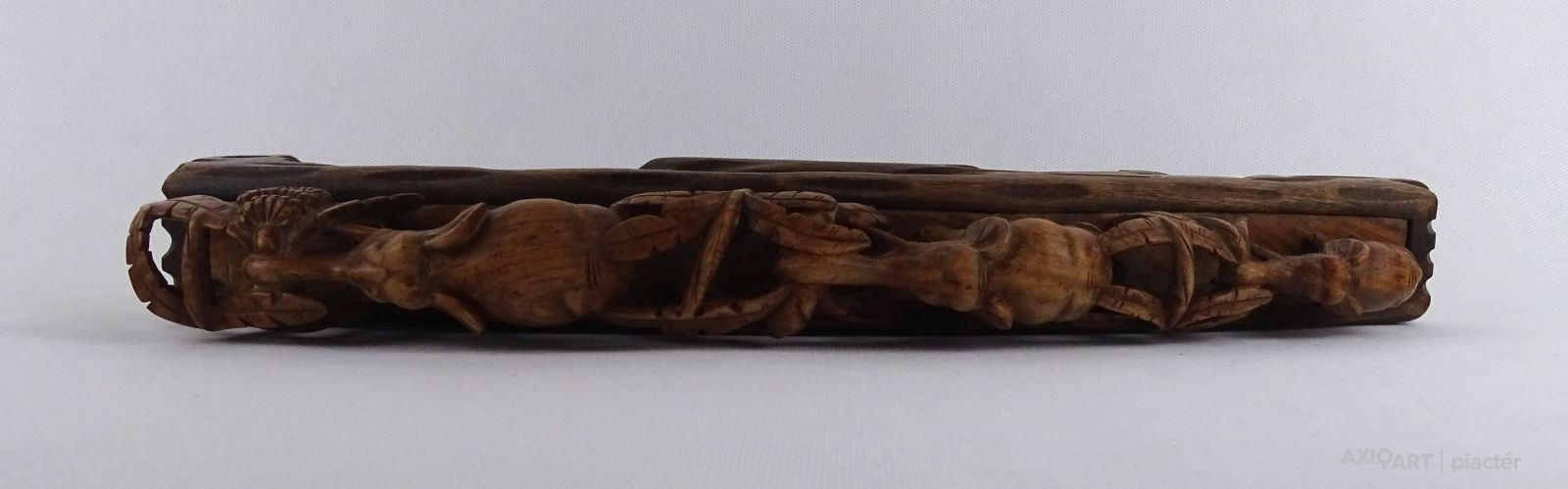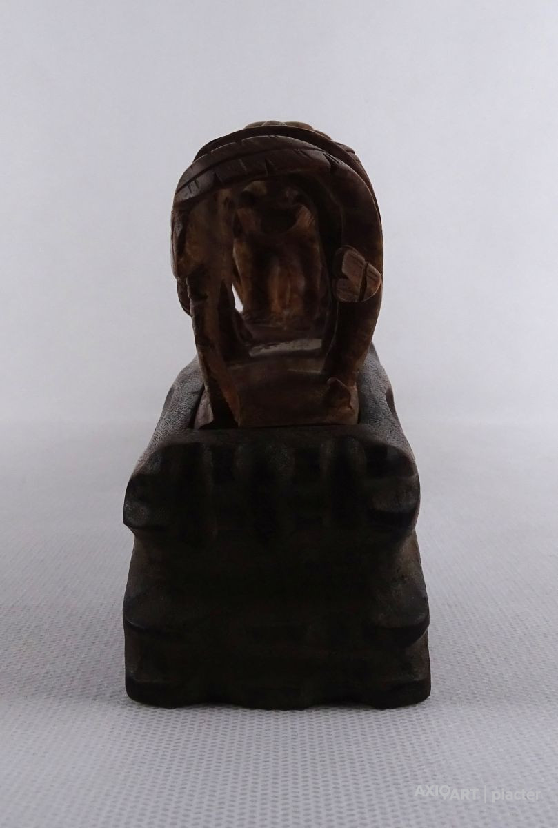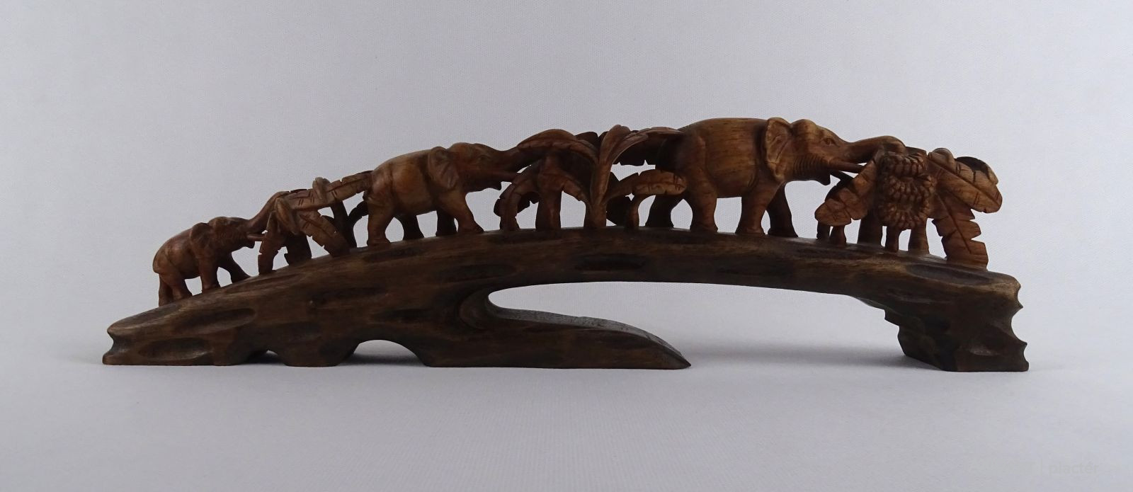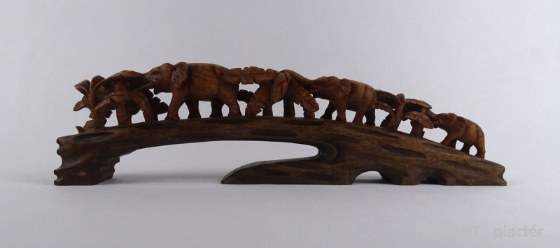 Régi, hibátlan állapotú, fa talpon található három darab faragott, vonuló elefánt csorda, család.