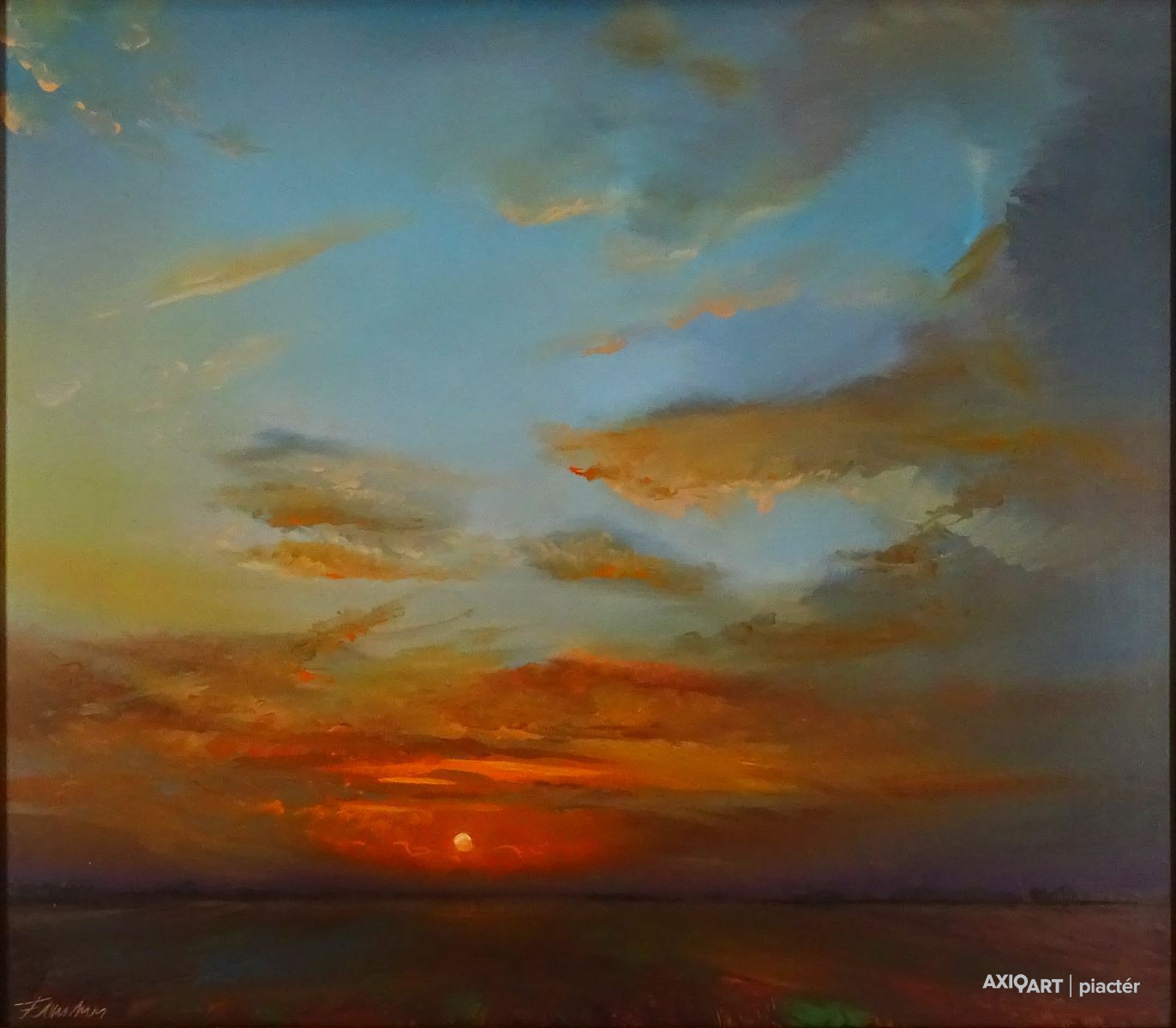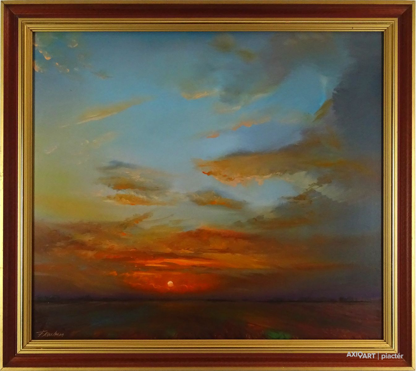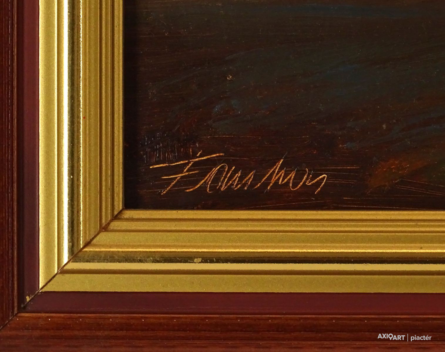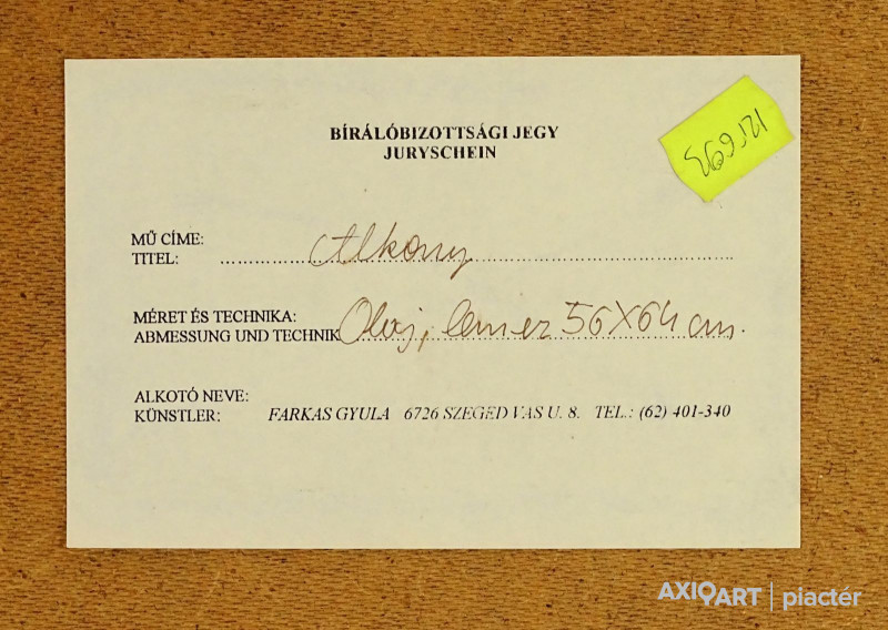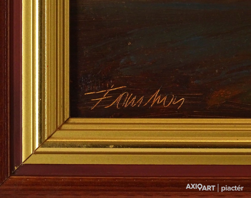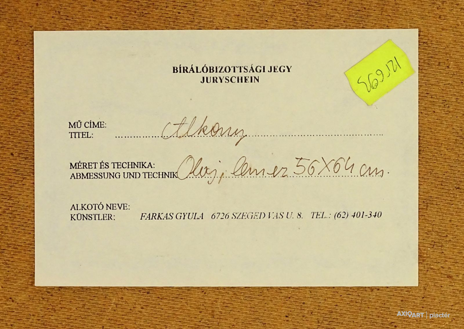 [1E882/082] Olaj farost lemez festmény, szép azonnal falra akasztható keretben. Jelezve jobbra lent FARKAS . Hátoldalán bírálóbizottsági jegy, rajta felirat: MŰ CÍME: ALKONY MÉRET ÉS TECHNIKA: OLAJ, LEMEZ ALKOTÓ NEVE: FARKAS GYULA Magasság: 64.5 cm Szélesség: 72.5 cm Súly: 2.82 kg Farkas Gyula festomuvész, Szeged, l946. szeptember 10. Budapesten és Szegeden él, tagja a Magyar Alkotómuvészek Országos Egyesületének és a Szegedi Szépmíves Céhnek. 1970 óta kiállító muvész, olajfestményei megtalálhatók itthon és külföldön egyaránt. Tájképein foként a magyar táj, valamint Görögország, Istria , a tenger motívumai és olasz, francia, svájci tájak is megjelennek. Szívesen él az absztrakció adta lehetoségekkel is. Modernebb hangvételu munkáiban mindig feltunik az inspirációt adó realista motívum, s így kézen fogva a nézot, mintegy átsétál vele egy elvontabb képi világba.