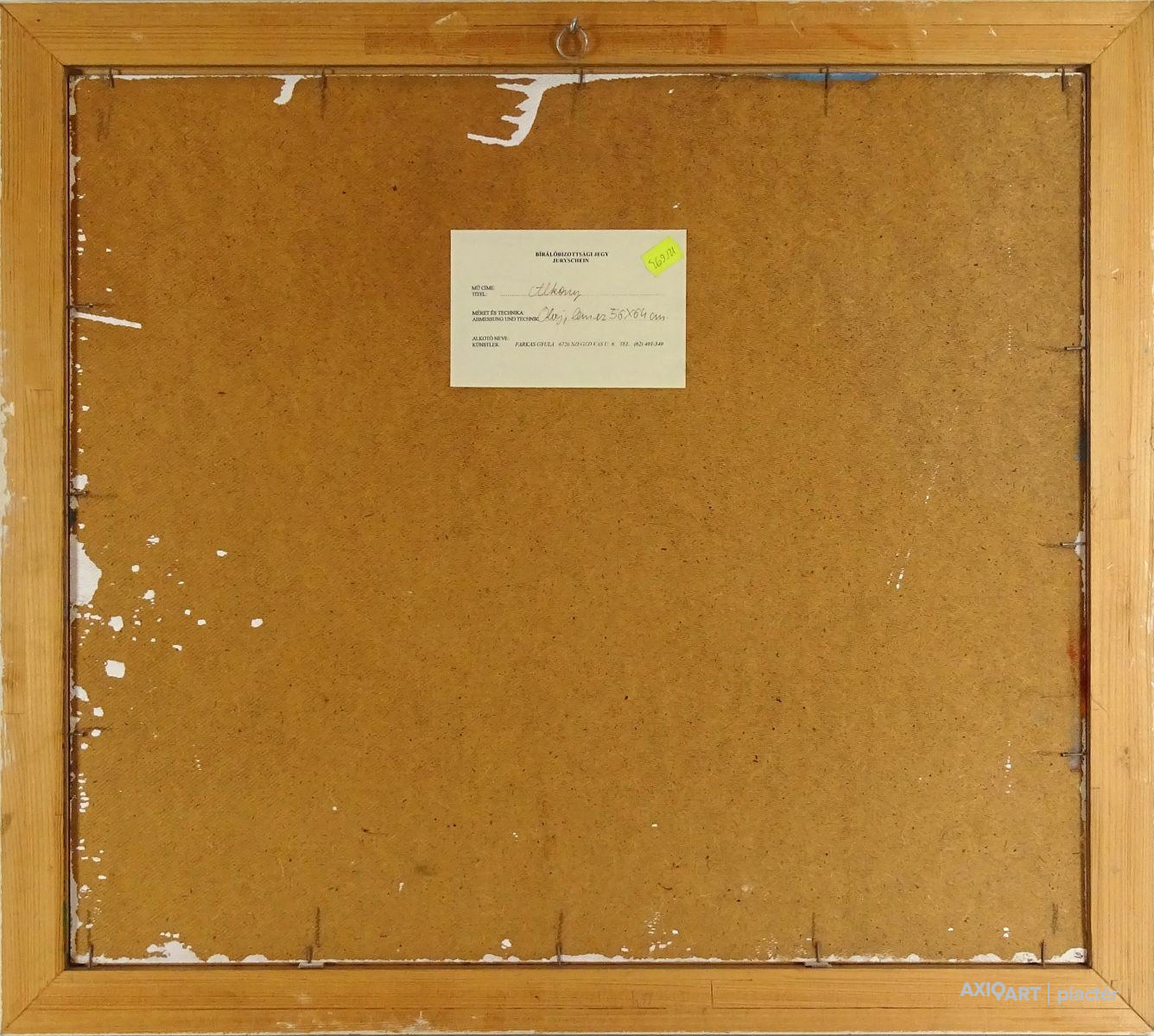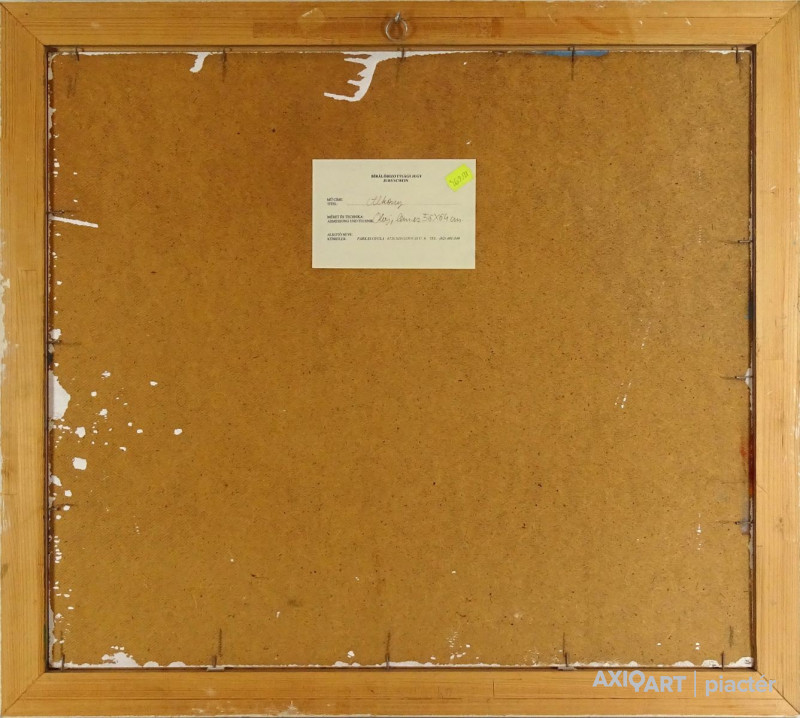 [FK0037/Z018] A kép mérete: 50 x 70 cm keret nélkül. Készült: Olaj, Vászon A kép Paizs László (Szentpéterúr, 1935) alkotása. Jelezve Jobbra lent "P. L." A festmény jó állapotban van. Keret: Ép A festmény hátoldalán a Képcsarnokvállalat címkéje található. Magyar festők és grafikusok életrajzi lexikona I-II. Festő. Tanulmányait a budapesti Iparművészeti Főiskolán végezte 1959-ben. Z. Gács György, Rákosy Zoltán és Szentiványi Lajos növendéke volt. A '60-as évek első felében hagyományosabb felfogású olajképeket festett, mozaikokat, freskókat, utóbb a pop-art körébe tartozó, a francia Arman munkáival rokon műveket alkotott. 1961 óta kiállító művész. Egyéni (Fényes Adolf Terem, Csók Galéria, Műcsarnok, Magyar Nemzeti Galéria, Halászbástya, Bástya Galéria, Vigadó Galéria, Budapest Galéria, Győr, Szombathely, Szeged, Zalaegerszeg, Duisburg, Aix-en-Provence, stb). és vegyes (Ernst Múzeum, Műcsarnok, Óbuda Galéria, Magyar Nemzeti Galéria, Csók Galéria, Vigadó Galéria, Székesfehérvár, Kaposvár, Pécs, Hódmezővásárhely, Firenze, Milano, Padova, Nápoly, Velence, Düsseldorf, Aachen, Genf, stb) tárlatokon vett részt. 1980-ban Munkácsy-díjjal jutalmazták, 1988-ban Érdemes Művész kitüntető elismerésben részesült. Munkáit őrzi a Magyar Nemzeti Galéria, a Fővárosi Képtár, a szombathelyi képtár, a pécsi Janus P. Múzeum, a székesfehérvári István Király Múzeum és a dunaszerdahelyi Kortárs Magyar Galéria. (H.B.: Műv, 1972/4, K.Gy.: Műv. 1977/2, K.G.: Műv. 1978/10, M.L.: Műv, 1983/5, R.G.: Műv, 1987/9, Sz.Gy.: Új Műv. 1995/4, MK) Magyar festők és grafikusok életrajzi lexikona I-II. Műgyűjtők és kereskedők kézikönyve Festő. Tanulmányait a bp.-i Iparművészeti Főiskolán végezte. Mozaikokat ferskókat, utóbb a pop-art körébe tartozó, a francia Arman műveivel rokon műveket alkotott. Mozaikok: a Szegedi Megyei Tanács, a Pécsi Óvoda, a Gödöllői Agrártudományi Egyetem. Freskók: Budapest - Csatárka úti Gyermekotthon. 1971-ben a Fényes Adolf Teremben volt kiállítása, 1983-ban pedig a szegedi Móra Ferenc Múzeumban nagyszabású tárlatokon mutatta be munkáit. 1988-ban érdemes művész kitüntető elismerésben részesült. (MK) Magyar festők és grafikusok adattára Az Iparművészeti Főiskolán végzett 1959-ben. Mozaikokat (Szeged, Megyei Tanács; Pécs, Óvoda; Gödöllő, Agrártudományi Egyetem), freskókat (Budapest, Csatárka úti Gyermekotthon), újabban a pop art körébe tartozó, a francia Arman műveivel rokon műveket alkotott. 1971-ben a Fényes Adolf Teremben nyílt kiállítása. 1983 februárjában a szegedi Móra Ferenc Múzeumban megrendezett nagyszabású tárlaton mutatta be alkotásait. 1988-ban érdemes művész kitüntető elismerésben részesült. - MK Művészeti lexikon I-IV. (Szentpéterur, 1935. dec. 26.- ): festő. Az Iparművészeti Főiskolán 1959-ben végzett Rákosy Zoltán, Z. Gách György és Szentiványi Lajos növendékeként. Épületdiszítő mozaikokat, (Szeged, Megyei Tanács, 1961; Pécs, Óvoda, 1964), műanyagfreskókat (Bp., Csatárka úti Gyermekotthon, 1964) és gobelinterveket készít. Kortárs magyar művészeti lexikon I-III. Festő, szobrász, grafikus. 1959: MIF, mesterei: Z. Gács György, Rákosy Zoltán, Szentiványi Lajos. 1980: Munkácsy-díj; 1988: érdemes művész. Főiskolás éveinek második felében, majd azt követően számos murális munka kivitelezésében vett részt, Fónyi Géza, Konecsni György, Z. Gács György, Rákosi Zoltán és Domanovszky Endre mellett dolgozva. A 60-as évek első felének hagyományosabb fölfogású olajképeket festett. 1964-ben a Velencei B.-n megismerkedett az amerikai pavilonban a pop art Európában akkor még újnak számító törekvésével, és részben ez inspirálta, hogy 1967-ben textil, fém, bőr anyagú "varrottas" képeket küldjön az FKS éves tárlatára; a megnyitó előtt többek között az ő munkáit is eltávolították a falról. A 70-es években pop art-os objekteket (A trónörököspár politikai gyilkosság áldozata lett, 1970, plexiüveg, újság, szarvasbogarak), majd konstruktív, átlátszó plexiüveg plasztikákat készített belső fénytörő határfelületekkel. A 80-as években készültek az anyagában színezett, konstruktív, nagyméretű poliészter szobrai, majd színes poliészter táblaképeket alkotott, mesterségesen roncsolt felületekkel, mintha régészeti leletek vagy atomtámadás utáni festmény-szurrogátumok lennének. Ekkor kezdett organikus plaszikájú bronzszobrokat is mintázni. A 90-es években, a táblaképek és szobrok mellett nagyméretű, egyedi grafikákat készített, formavilágában némileg a roncsolt táblaképekből kiindulva, de szinte kizárólag az emberi alakból elvonatkoztatott torzókat megjelenítve. Ek: 1966: Művészklub, Győr; 1971: Fényes A. T.; 1972: Bercsényi 28-30 G.; 1973: BME B-épület; 1976: Csók G.; 1977: G. Hildebrandt, Duisburg (NSZK); 1979: Bástya G., Halászbástya; Helyőrségi Műv. H., Nagyatád; József A. Műv. Közp., Szeged; Göcsej M., Zalaegerszeg; 1982: Bezzegh G., Küsnacht (CH); 1983: Móra F. M., Szeged; 1987: Műcsarnok (kat.); MNG; 1988: Pandora G., Badacsonytomaj; 1989: Parktheatter, Iserlohn (NSZK); Qualitas G.; Hevesi S. Színház, Zalaegerszeg; 1990: Vasarely Fondation (Ferdinánd Judittal, Fóth Ernővel), Aix-en-Provence (FR); 1994: Vigadó G.; 1997: Pest Center G.; 1998: Budapest G. (kat.); 1999: Pest Center G. (kat); G. Arcis, Sárvár; MMA, Bp.; 2001: SZK, Szhely; Ernst M. (kat.) Vcsk: 1961, 1964, 1966: FKS, Ernst M.; 1962: 9. Magyar Képzőműv. kiállítás, Műcsarnok; 1967: Mai magyar festészet, Új-Delhi; 1969: Vas megyei művészek, Savaria M., Szhely; V. Orsz. Grafikai B., Miskolc; 1971: Új művek, Műcsarnok; 1972: Fiatal művészek Budapestről. Likovni Salon, Újvidék (YU); 1972, 1973: Balatonboglár