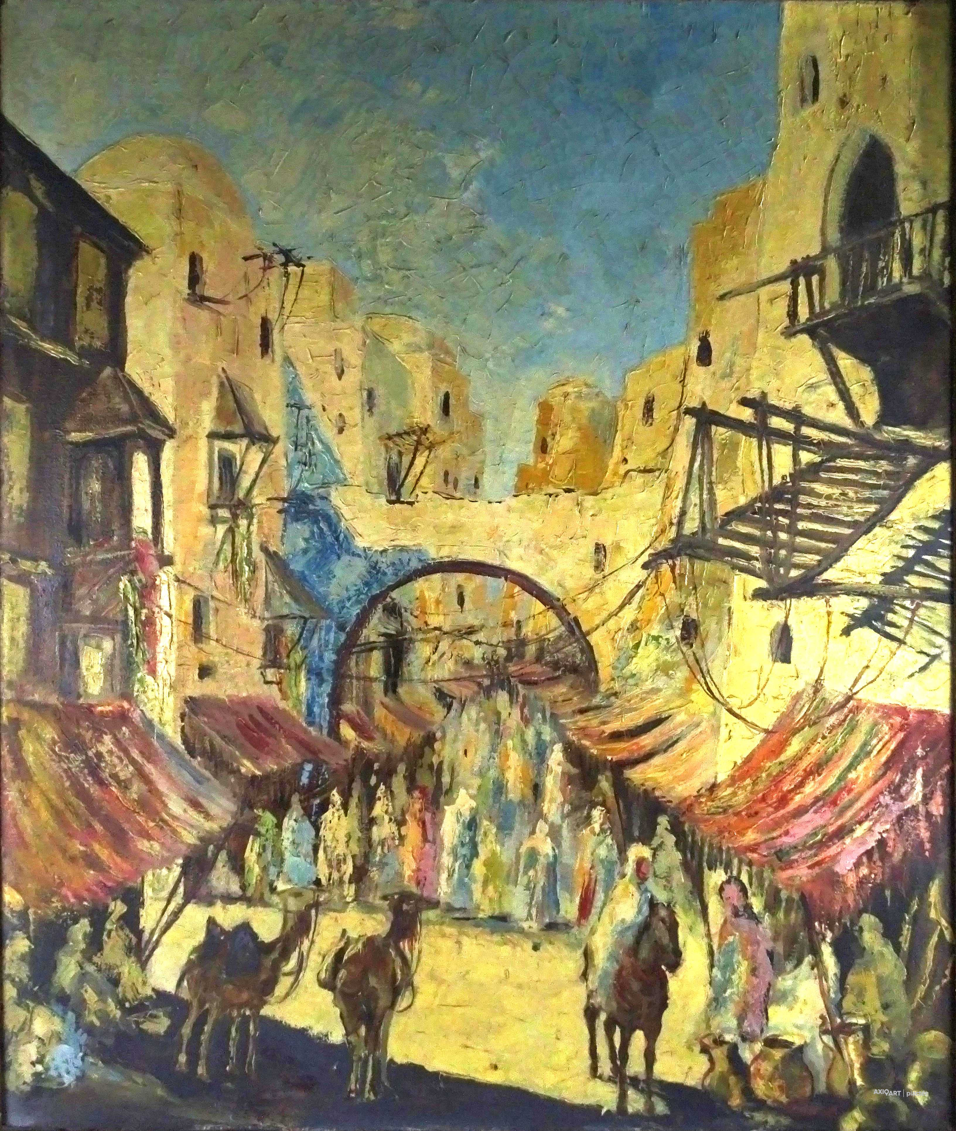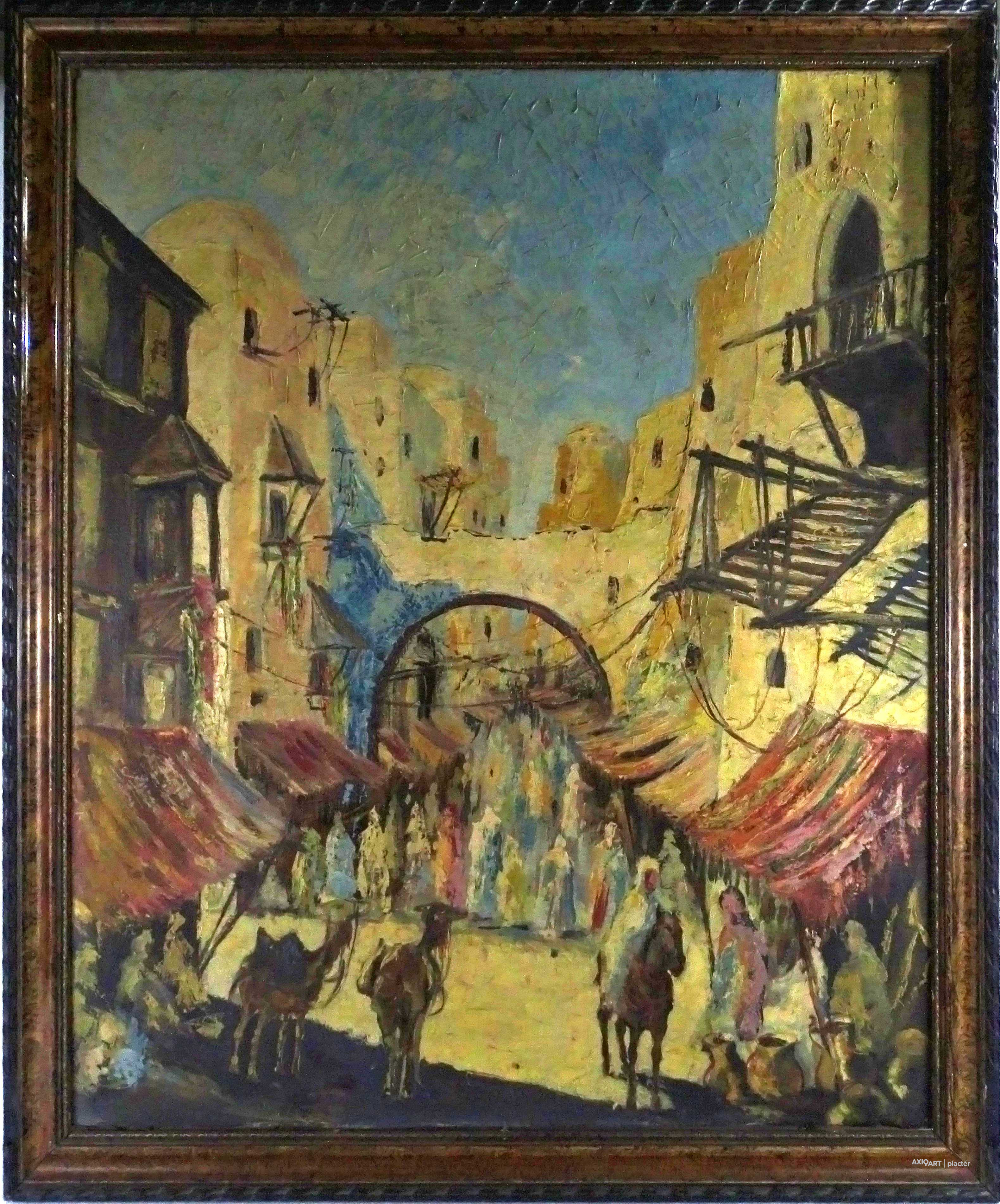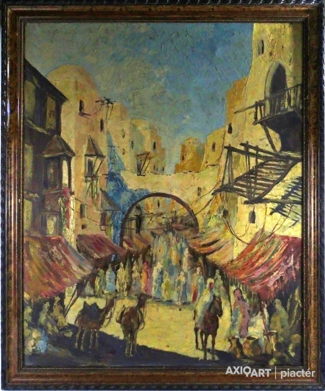[FK2668/Bp301/4] A kép mérete: 50,5 x 80,5 cm keret nélkül. Készült: Olaj, Vászon A kép Moldován István (Kolozsvár, 1911) alkotása. Jelezve Jobbra lent "Moldován István" A festmény jó állapotban van. Keret: Ép A festmény hátoldalán a Képcsarnokvállalat raglapja láltható. Magyar festők és grafikusok életrajzi lexikona I-II. Festő. Tanulmányait Kolozsvárott, a Szépművészeti Főiskolán kezdte 1930-ban. A következő esztendőben a nagybányai Szépművészeti Iskolában Thorma János és Krizsán János korrektúráján képezte magát. 1931-ben a budapesti Képzőművészeti Főiskola hallgatója lett. Réti István, később Szőnyi István volt a mestere. Már mint főiskolás sok díjat és kitüntetést nyert. 1948-ban megkapta a római ösztöndíjat, de lemondva róla, Erdélybe ment. 1948-1950 között Erdélyben élt, és népművészetben gazdag vidékein festett. 1943-ban Kolozsvárott, 1946-ban Gyöngyösön, 1955-ben, 1959-ben és 1962-ben a Kulturális Kapcsolatok Intézetében, illetve a Csók Galériában rendezett egyéni bemutatókat. Ezen kívül több Európai országban, az USA-ban, Kanadában és Indiában is bemutatta munkáit. Eleinte sajátos atmoszférájú, lírai tájképeket, eleven színvilágú képmásokat festett, később mondernebb, erőteljesebben szerkesztett művekkel jelentkezett. A Pécsi Tanárképző Főiskola számára mozaikot készített. Erdély szerelmese volt. A székely népművészet gazdag formavilágának hatása döntő jelentőségűvé vált sokoldalú művészetében. Műv. díjak: a Szinyei Társaság elismerő oklevele, a Főváros festészeti-díja, "Kolozsvár a képzőművészetben" II. díj, állami ösztöndíj, római ösztöndíj, a Képzőművészek Szövetsége Észak-Magyarországi festészeti díja, SZOT festészeti díj. Több murális művet (mozaik) alkotott. A Magyar Nemzeti Galéria több alkotását őrzi. (M. L.: Műv. 1967/6, RI-NM) Magyar festők és grafikusok életrajzi lexikona I-II. Műgyűjtők és kereskedők kézikönyve Festő. Tanulmányait a kolozsvári Szépművészeti Főiskolán kezdte 1930-ban. A nagybányai szabadiskolában is megfordult. Itt Thorma János és Krizsán János korrektúráján képezte magát. 1931-ben Budapesten a Képzőművészeti Főiskola hallgatója lett. Réti István, később Szőnyi István volt a mestere. Már mint főiskolás sok díjat nyert. 1948-ban megkapta a római ösztöndíjat, de lemondva róla, Erdélybe ment. 1948-1950 k. Erdélyben élt, és népművészetben gazdag vidékein festett. 1943-ban Kolozsváron, 1946-ban Gyöngyösön, 1955-ben, 1959-ben és 1962-ben a Kulturális Kapcsolatok Intézetében, illetve a Csók Galériában rendezett önálló kiállítást. Ezen kívül több Európai országban, az USA-ban, Kanadában és Indiában is bemutatta műveit. Eleinte sajátos atmoszférájú, lírai tájképeket, eleven színvilágú képmásokat festett, később mondernebb, erőteljesebben szerkesztett művekkel jelentkezett. A Pécsi Tanárképző Főiskola számára mozaikot készített. Erdély szerelmese volt. A székely népművészet gazdag formavilágának hatása döntő jelentőségűvé vált sokoldalú művészetében. 1942-ben megkapta a Szinyei Társaság elismerését, és a Főváros festészeti-díjat,1943-ban elnyerte a "Kolozsvár a képzőművészetben" c. díjat. 1947-ben állami ösztöndíjat,1948-ban a római ösztöndíjat, 1972-ben a Képzőművészek Szövetsége Észak-Magyarországi festészeti díját kapta meg. A MNG több művét őrzi. (M. L.: Műv.-1976/6) Magyar festők és grafikusok adattára Tanulmányait Kolozsvárott a Képzőművészeti Főiskolán, majd Nagybányán Thorma János és Krizsán János irányítása mellett kezdte, 1931-től Budapesten megszakításokkal a Képzőművészeti Főiskolán Réti István és Szőnyi István növendékeként fejezte be. 1949-ben és 1950-ben ösztöndíjjal dolgozott Erdélyben, majd hosszú tanulmányutakra indult Nyugat-Európába, az Egyesült Államokba, s a Szovjetunióba. Először Kolozsvárott lépett a nyilvánosság elé 1943-ban, majd 1946-ban Egerben és Gyöngyösön, 1947-ben Miskolcon, 1948-ban Hatvanban, 1955, 1961 és 1981-ben a Csók Galériában, 1959-ben a KKI-ben, 1960-ban Nagykanizsán, 1963-ban Kiskunfélegyházán, 1966-ban Debrecenben, 1969 és 1975-ben Békéscsabán, 1971-ben a Mednyánszky Teremben, 1973-ban Gyöngyösön és Debrecenben, 1977-ben Egerben, 1979-ben Veszprémben, 1983-ban Miskolcon, 1984-ben Csepelen, 1986-ban a Vigadó Galériában rendezett önálló kiállítást. Külföldi kiállításai: Moszkva, Varsó, India, Szófia, Párizs, Bukarest, Belgrád, New York, Montreál és Toronto. Eddig közel kétezer színes táblaképet festett, de szívesen foglalkozik mozaikkészítéssel is. 1964-ben a Pécsi Pedagógiai Főiskola, 1968-ban a Salgótarjáni Kórház, 1969-ben a názáreti templom és 1970-ben a Videoton Vállalat díszterme részére mozaikot készített. - Erdély szerelmese. A székely népművészet gazdag formavilágának hatása döntő jelentőségűvé vált festészetében. Olyan formanyelvet alakított ki magának, amely színvilágában és summázó formaalakításában sajátos erdélyi zamat érződik, ugyanakkor korszerűen modern is konstruktivista stílusa. Munkásságát 1942-ben a Szinyei Társaság elismerésével és a Fővárosi festészeti-díjjal, 1943-ben Római-ösztöndíjjal, 1947-ben Állam ösztöndíjjal (Románai), 1963-ben a SZOT festészeti-díjával, 1972-ben a Képzőművészek Szövetsége Észak-Magyarországi festészeti-díjával tüntették ki. - Irod.: Bíró Béla: Kolozsváry Moldován István. Erdélyi Helikon, 1943.; Felvinczi Takács Zoltán: Kolozsváry Moldován István. Kolozsvár, 1943.; Dutka Mária: Magyar Nemzet, 1961.; Maksay László: Moldován István. Művészet, 1965.; D. Fehér Zsuzsa. Moldován István, Bp. 1971.; Theisler G