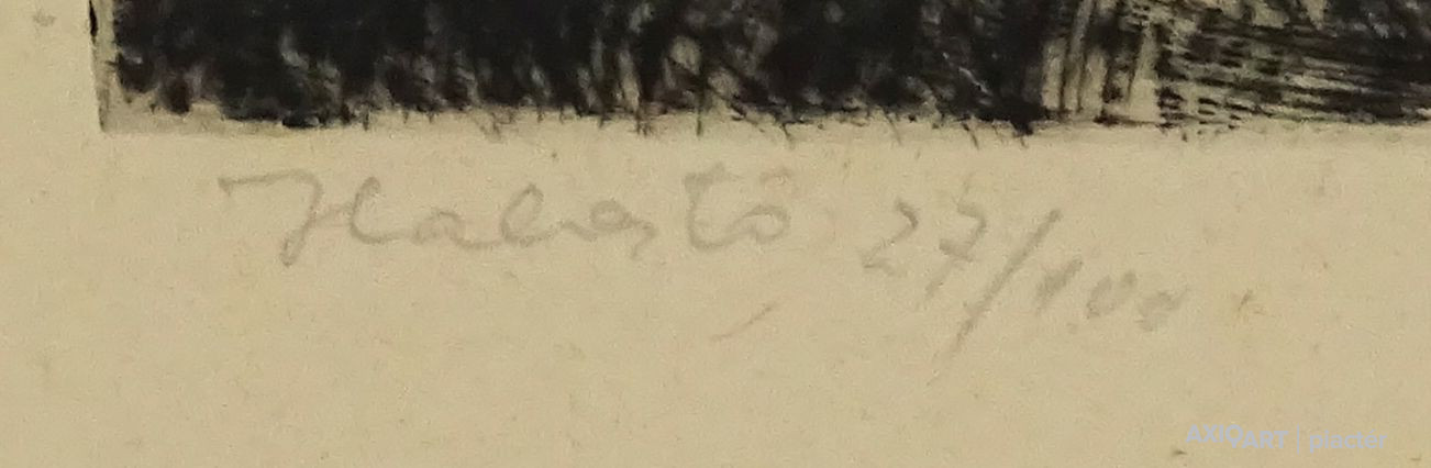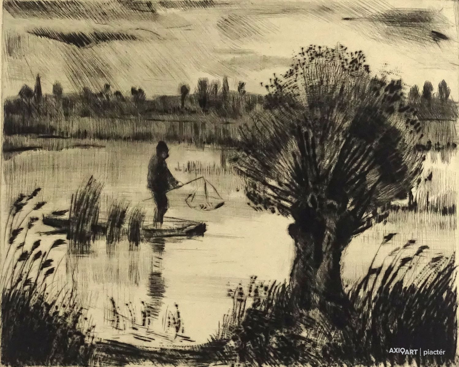 [FKC345/Bp93/94] A kép mérete: 15 x 17,5 cm keret nélkül. Készült: Rézkarc, Papír A kép Csillag József (Győrszentmárton, 1894, Budapest, 1977) alkotása. Jelezve lent "Asztag Csillag (ceruzával)" A festmény jó állapotban van. Keret: Új Magyar festők és grafikusok életrajzi lexikona I-II. Festő, grafikus. 1917-24 között a fővárosi Képzőművészeti Főiskolán tanult és szerzett rajztanári oklevelet. Révész Imre tanítványa volt. A '20-as években tanulmányúton járt Itáliában (Róma, Firenze, Velence, Pádova). Már főiskolás korában kezdett el dolgozni a pécsi és a kecskeméti művésztelepen. Első gyűjteményes tárlatát 1928-ban Pécsett rendezték festményeiből. 1929-ben rézkarcaiból rendeztek bemutatót Brüsszelben. Ezen kívül Firenzében és New Yorkban szerepelt kiállításokon. A '30-as évek folyamán többször műterem-kiállításon mutatta be alkotásait. Elsősorban tájképeket festett, a látványhoz hű, realista modorban. Kerültek ki keze alól magyar jellegű zsánerképek is. Rézkarcain is főként a táj szépségeit igyekezett megörökíteni. Tájképei stockholmi és hollandi múzeumokban is szerepelnek. (Éber, ML, Gyulai Gergely adatközlése nyomán) Magyar festők és grafikusok adattára A Képzőművészeti Főiskolán Révész Imre tanítványa volt. A kecskeméti művésztelepen is dolgozott. 1928-ban Kecskeméten, 1938-ban Velencében, 1935-ben Brüsszelben rendezett gyűjteményes kiállítást. Tájképei stockholmi, hollandiai múzeumokban is szerepelnek. - ML Magyar festők és grafikusok életrajzi lexikona I-II. Műgyűjtők és kereskedők kézikönyve Festő. A fővárosi Képzőművészeti Főiskolán Révész Imre tanítványa volt, majd külföldi tanulmányútra utazott. Gyűjteményes kiállításai voltak Brüsszelben, Firenzében és New Yorkban. Főként magyar jellegű zsánerképeket festett. 1931-ben "Fabán" c. képe kitüntető elismerést kapott. Tájképei stockholmi és hollandiai múzeumokban is szerepelnek. (Éber, ML) Művészeti lexikon I-IV. Festő, grafikus. Révész Imre tanítványa volt a Képzőművészeti Főiskolán, dolgozott a kecskeméti művésztelepen is. 1928-ban Kecskeméten, 1931-ben Velencében, 1935-ben Brüsszelben rendeztek gyűjt. kiállítást műveiből. Tájképei stockholmi, hollandiai múzeumokba is kerültek. Újabban rézkarcokat is készít.