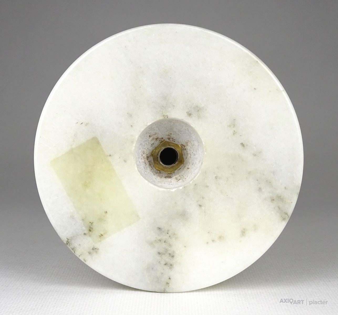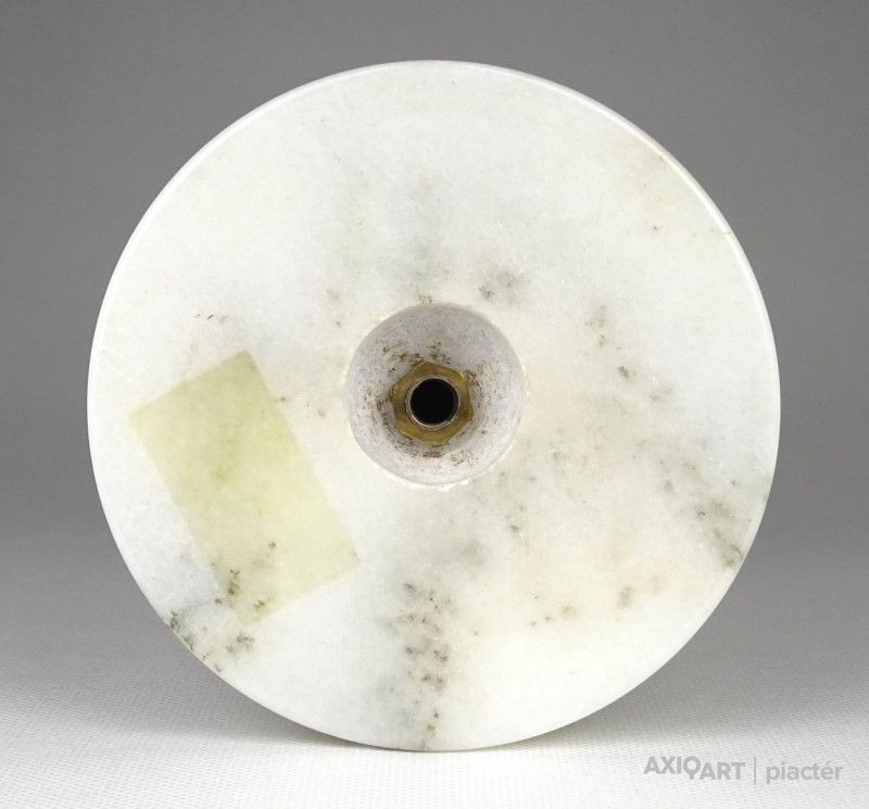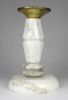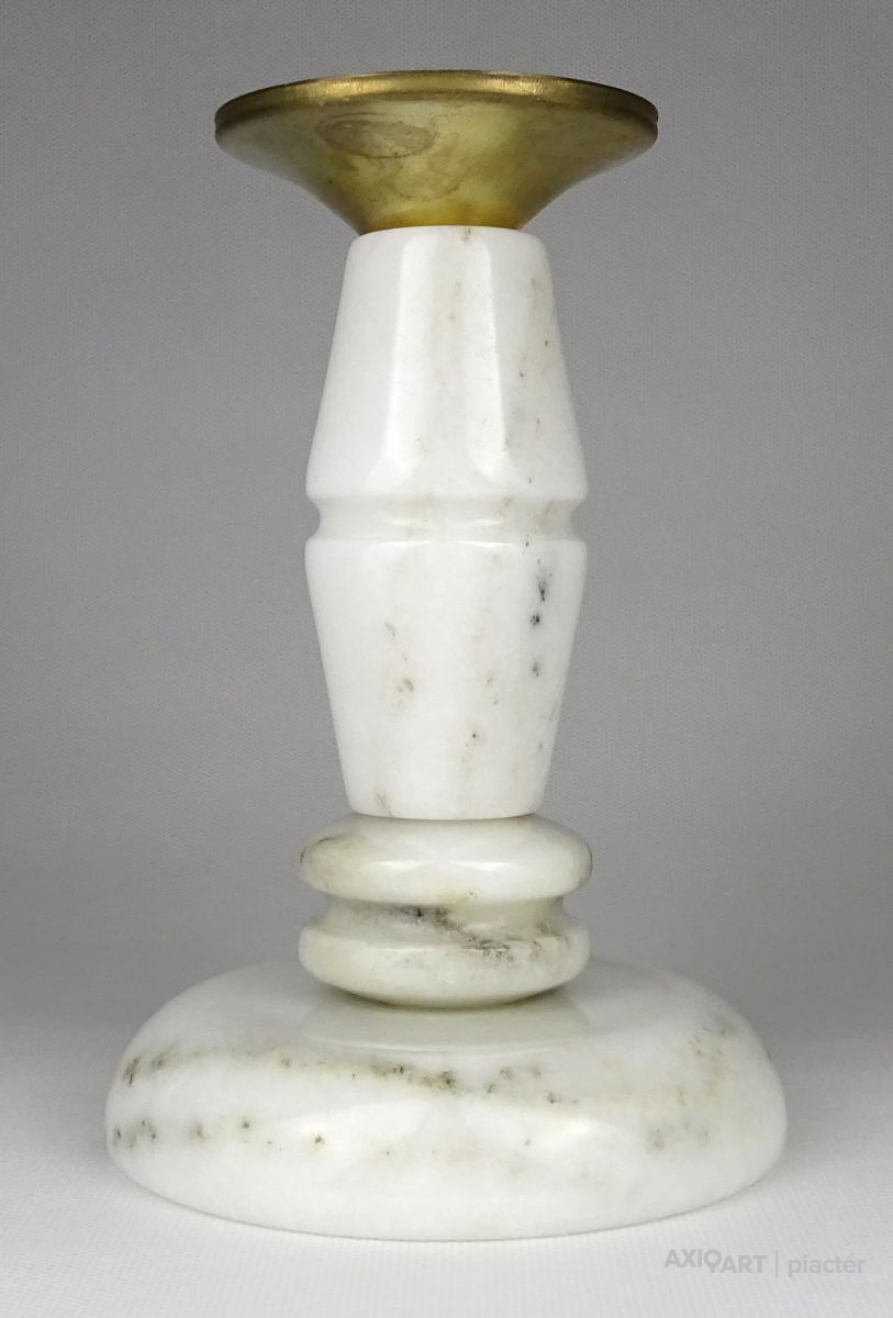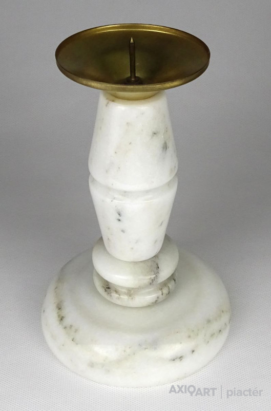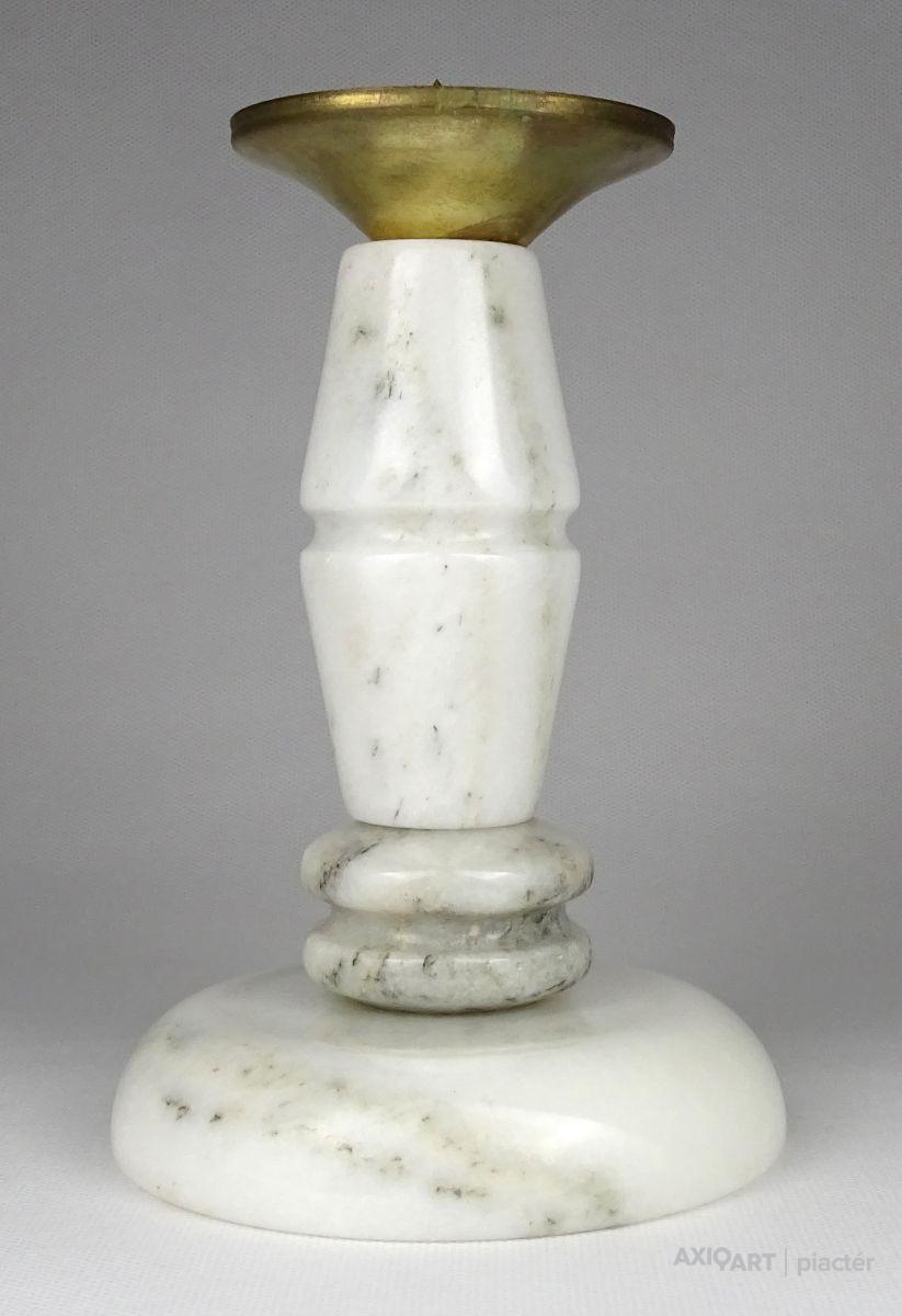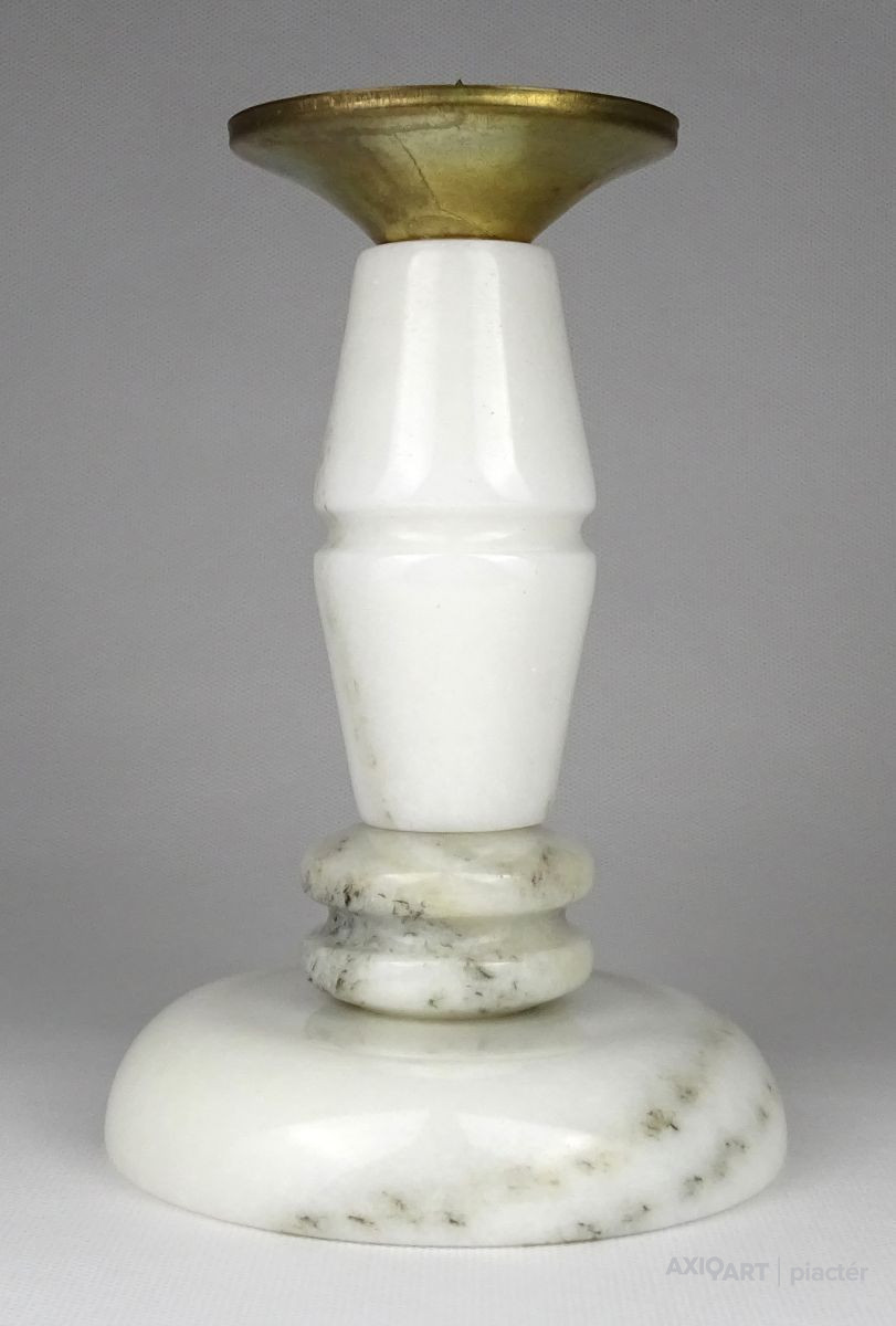 Régi, világos színű márványból készült gyertyatartó szép állapotban. Tetején Réz lecsorgást felfogó csésze található, közepében felszúró tüskével.