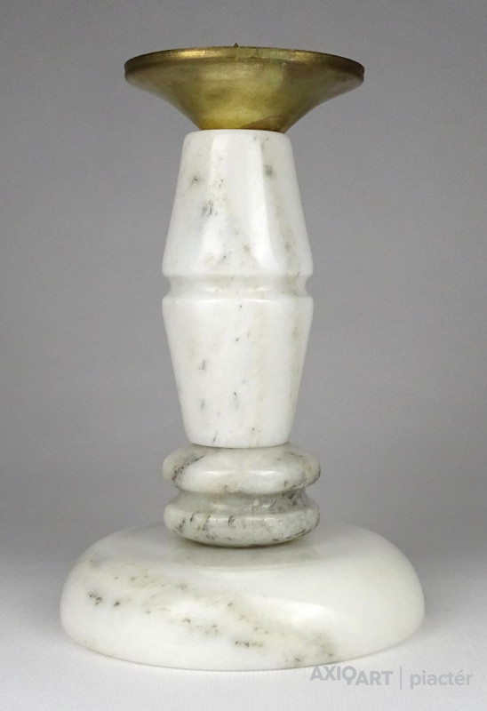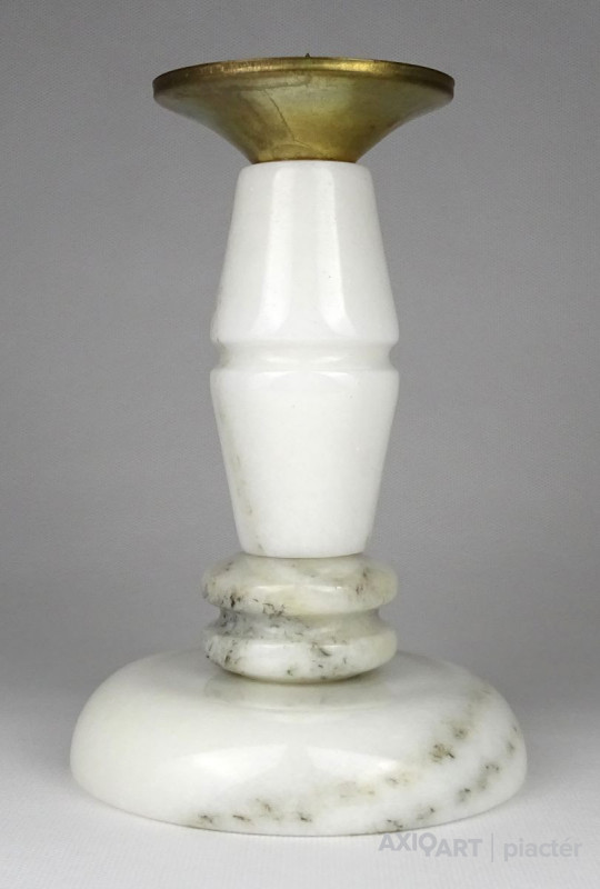 [1N033/X149] Régi, világos színű márványból készült gyertyatartó szép állapotban. Tetején Réz lecsorgást felfogó csésze található, közepében felszúró tüskével. Magasság: 18 cm Szélesség: 12 cm Súly: 1.3 kg