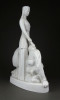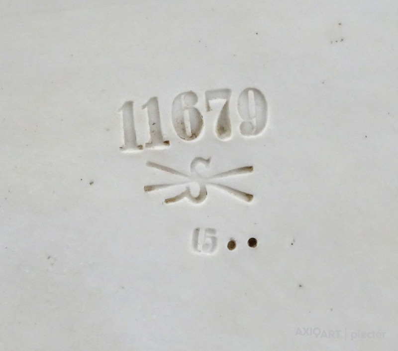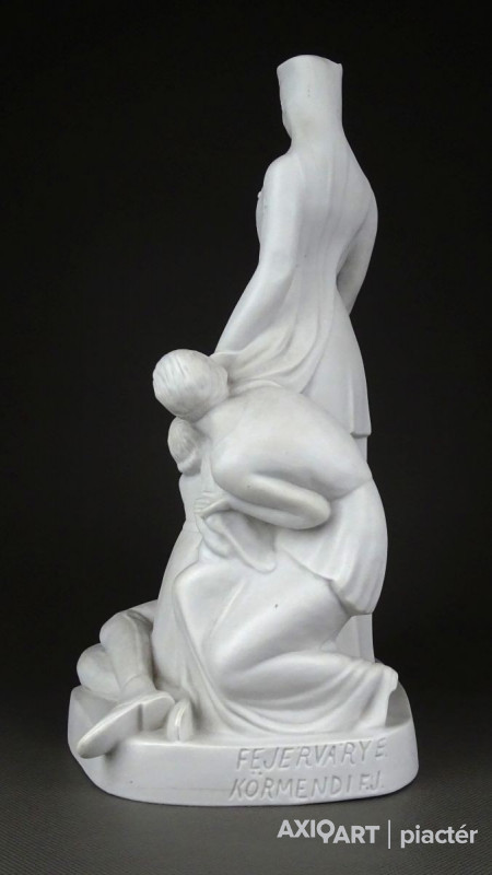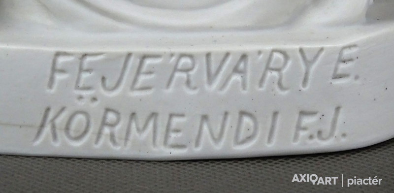 [1F813/UZ-K] Hibátlan állapotú, nagyméretű jelzett biszkvit porcelán szobor talapzaton. Első világháborús jelenet. Védőnő, sebesült magyar huszár és családja. A talapzat oldalán a művész házaspár jelzése: FEJÉRVÁRY E. (Fejérváry Erzsi) KÖRMENDI F.J. (Körmendi Frim Jenő) Alján mélynyomású "S" jelzés, SCHEIBE-ALSBACH. Mellette mélynyomással formaszám: 11679 Magasság: 31 cm Szélesség: 15 cm Hosszúság: 23 cm Súly: 1.51 kg Körmendi-Frim Jenő    A Wikipédiából, a szabad enciklopédiából Ugrás a navigációhozUgrás a kereséshez Körmendi-Frim Jenő Született Frim Jenő 1886. október 11. Budapest Elhunyt 1959. augusztus (72 évesen) 1959. augusztus 14. (72 évesen)[1] Washington Állampolgársága magyar Házastársa Fejérváry Erzsi Szülei Frim Jakab Foglalkozása szobrász A Wikimédia Commons tartalmaz Körmendi-Frim Jenő témájú médiaállományokat. Körmendi-Frim Jenő, született Frim Jenő (Budapest, 1886. október 11.[2][3] – Washington, D.C., 1959. augusztus 14.) magyar szobrász, egyetemi tanár, éremművész. Számos portrét, plakettet és köztéri szobrot alkotott. Feleségével, Fejérváry Erzsi festő és keramikussal 1939-től az Amerikai Egyesült Államokban élt.  Életpályája Budapesten született Frim Jakab (1852–1919)[4] orvos, pedagógus és Goldreich Anna gyermekeként. Előbb a budapesti Iparművészeti Iskolán, majd Párizsban Joseph Bernardnál tanult. Részt vett az Országos Társadalombiztosító Intézet székházának díszítésében is. 1922. szeptember 7-én Budapesten, a Terézvárosban házasságot kötött Fejérvári Zsigmond és Schnitzer Adél lányával, Erzsébettel. 1939-ben hosszabb időt töltött Hollandiában, ahol több városban (Hága, Arnheim) rendezett kiállítást. 1939-ben feleségével együtt az USA-ban telepedett le, ahol mindketten az Indiana állambeli Notre-Dame Egyetem tanárai lettek.  Főbb művei  Portréi és mellszobrai Eötvös Loránd Jedlik Ányos Korányi Frigyes Svéd Sándor Máté Olga Plakettjei Hubay Jenő Vámbéry Ármin  Köztéri szobrai Jászberény: Török-magyar harcosok (1909); Esztergom: Sobieski János (1933) Balassagyarmat: Hősi emlékmű (1937) Erzsébet királyné 0. kilométerkő Madonnája Geszt: Hősi emlékmű (1937) Kiállításai 1906-tól szerepelt a Műcsarnok tárlatain. 1910-ben a Művészházban, 1934-ben az Ernst Múzeumban, 1935-ben a Lipótvárosi Kaszinóban mutatta be munkáit. 1939-ben Hollandiában több városban volt kiállítása (Hága, Arnheim) 1939-ben Milwaukee-ban volt közös kiállítása feleségével, Fejérváry Erzsi festő és keramikussal.   Forrás: wikipédia