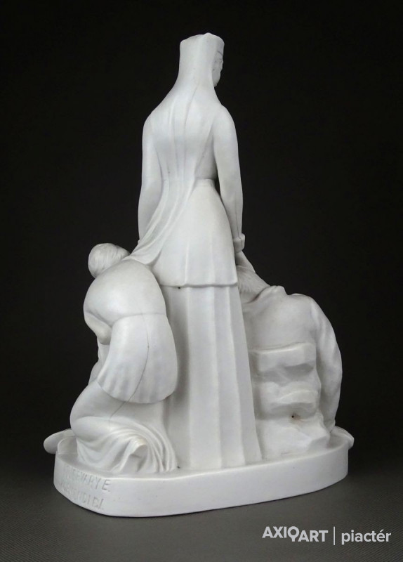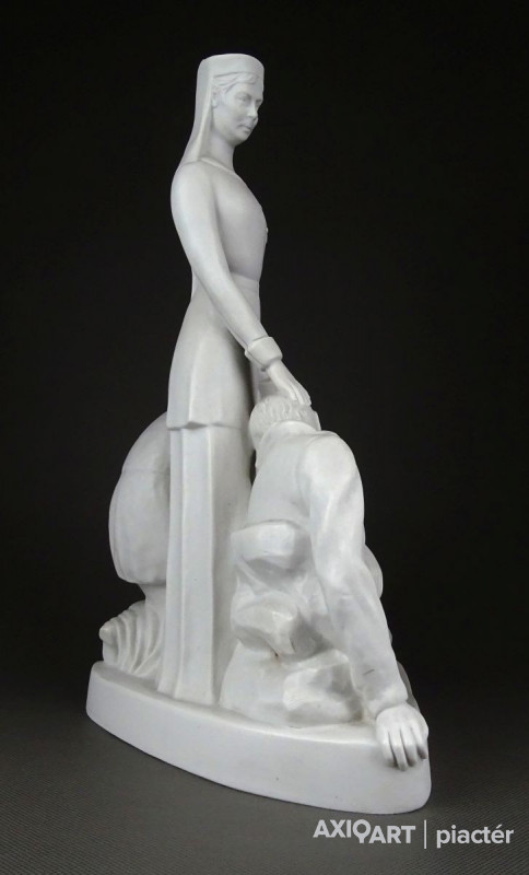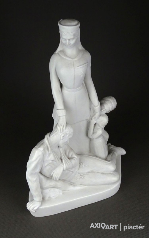 Hibátlan állapotú, nagyméretű jelzett biszkvit porcelán szobor talapzaton. Első világháborús jelenet. Védőnő, sebesült magyar huszár és családja.