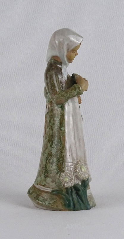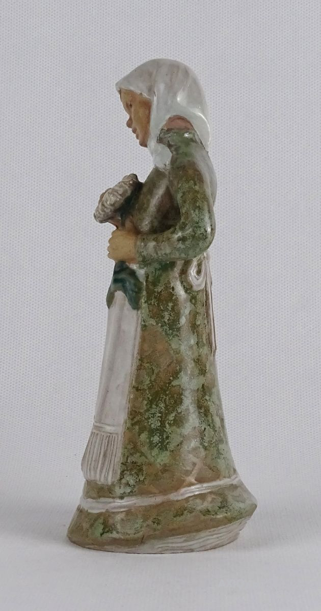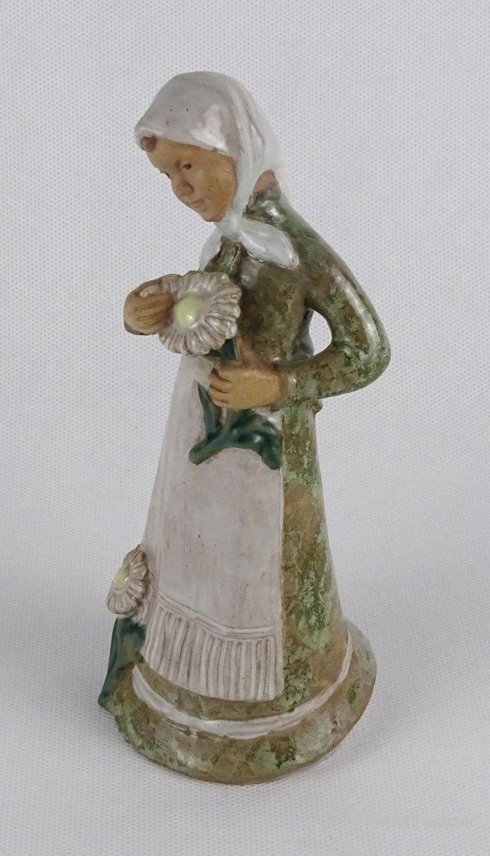 Hibátlan állapotú mázas virágszedő kerámia lány, menyecske szobor. Rajta fejkendő és kötény, kezében virág. Nyaka restaurált.