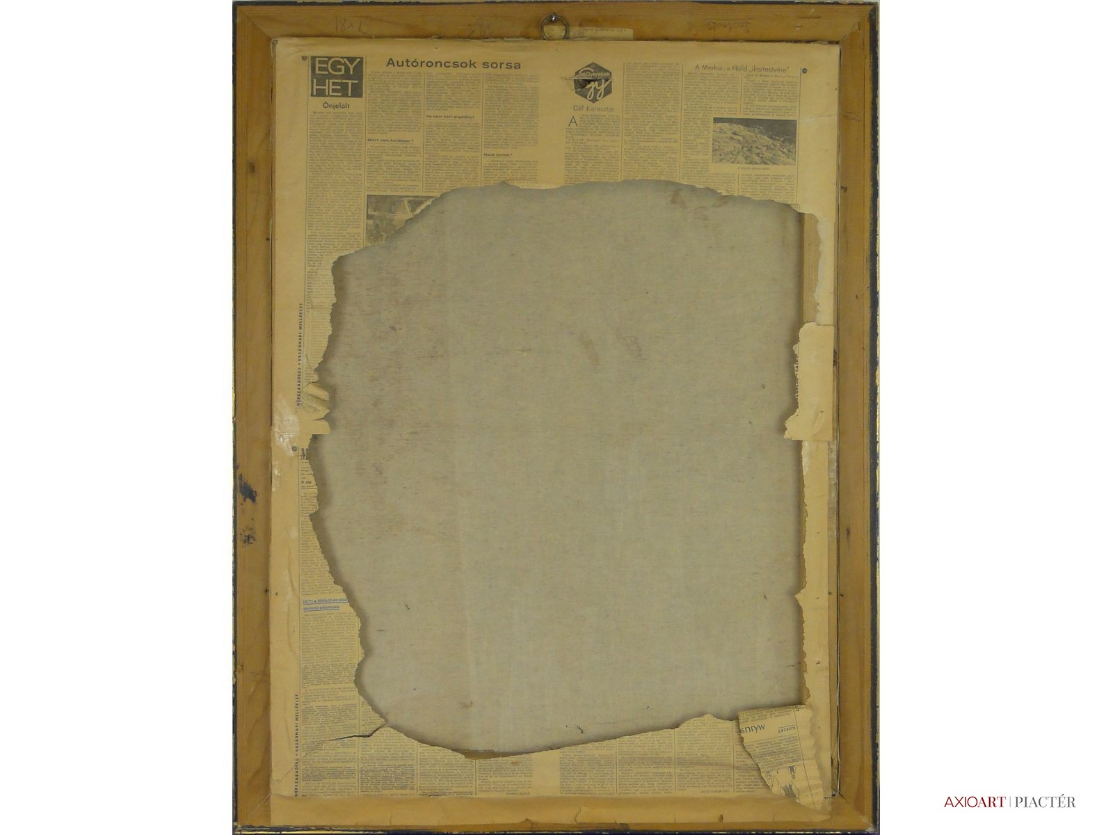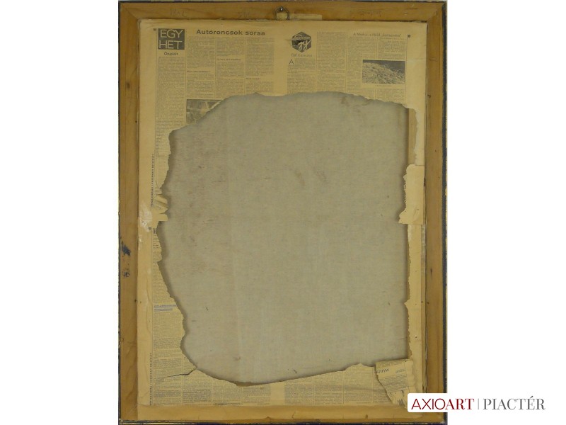 [FK0037/Z018] A kép mérete: 50 x 70 cm keret nélkül. Készült: Olaj, Vászon A kép Paizs László (Szentpéterúr, 1935) alkotása. Jelezve Jobbra lent "P. L." A festmény jó állapotban van. Keret: Ép A festmény hátoldalán a Képcsarnokvállalat címkéje található. Magyar festők és grafikusok életrajzi lexikona I-II. Festő. Tanulmányait a budapesti Iparművészeti Főiskolán végezte 1959-ben. Z. Gács György, Rákosy Zoltán és Szentiványi Lajos növendéke volt. A '60-as évek első felében hagyományosabb felfogású olajképeket festett, mozaikokat, freskókat, utóbb a pop-art körébe tartozó, a francia Arman munkáival rokon műveket alkotott. 1961 óta kiállító művész. Egyéni (Fényes Adolf Terem, Csók Galéria, Műcsarnok, Magyar Nemzeti Galéria, Halászbástya, Bástya Galéria, Vigadó Galéria, Budapest Galéria, Győr, Szombathely, Szeged, Zalaegerszeg, Duisburg, Aix-en-Provence, stb). és vegyes (Ernst Múzeum, Műcsarnok, Óbuda Galéria, Magyar Nemzeti Galéria, Csók Galéria, Vigadó Galéria, Székesfehérvár, Kaposvár, Pécs, Hódmezővásárhely, Firenze, Milano, Padova, Nápoly, Velence, Düsseldorf, Aachen, Genf, stb) tárlatokon vett részt. 1980-ban Munkácsy-díjjal jutalmazták, 1988-ban Érdemes Művész kitüntető elismerésben részesült. Munkáit őrzi a Magyar Nemzeti Galéria, a Fővárosi Képtár, a szombathelyi képtár, a pécsi Janus P. Múzeum, a székesfehérvári István Király Múzeum és a dunaszerdahelyi Kortárs Magyar Galéria. (H.B.: Műv, 1972/4, K.Gy.: Műv. 1977/2, K.G.: Műv. 1978/10, M.L.: Műv, 1983/5, R.G.: Műv, 1987/9, Sz.Gy.: Új Műv. 1995/4, MK) Magyar festők és grafikusok életrajzi lexikona I-II. Műgyűjtők és kereskedők kézikönyve Festő. Tanulmányait a bp.-i Iparművészeti Főiskolán végezte. Mozaikokat ferskókat, utóbb a pop-art körébe tartozó, a francia Arman műveivel rokon műveket alkotott. Mozaikok: a Szegedi Megyei Tanács, a Pécsi Óvoda, a Gödöllői Agrártudományi Egyetem. Freskók: Budapest - Csatárka úti Gyermekotthon. 1971-ben a Fényes Adolf Teremben volt kiállítása, 1983-ban pedig a szegedi Móra Ferenc Múzeumban nagyszabású tárlatokon mutatta be munkáit. 1988-ban érdemes művész kitüntető elismerésben részesült. (MK) Magyar festők és grafikusok adattára Az Iparművészeti Főiskolán végzett 1959-ben. Mozaikokat (Szeged, Megyei Tanács; Pécs, Óvoda; Gödöllő, Agrártudományi Egyetem), freskókat (Budapest, Csatárka úti Gyermekotthon), újabban a pop art körébe tartozó, a francia Arman műveivel rokon műveket alkotott. 1971-ben a Fényes Adolf Teremben nyílt kiállítása. 1983 februárjában a szegedi Móra Ferenc Múzeumban megrendezett nagyszabású tárlaton mutatta be alkotásait. 1988-ban érdemes művész kitüntető elismerésben részesült. - MK Művészeti lexikon I-IV. (Szentpéterur, 1935. dec. 26.- ): festő. Az Iparművészeti Főiskolán 1959-ben végzett Rákosy Zoltán, Z. Gách György és Szentiványi Lajos növendékeként. Épületdiszítő mozaikokat, (Szeged, Megyei Tanács, 1961; Pécs, Óvoda, 1964), műanyagfreskókat (Bp., Csatárka úti Gyermekotthon, 1964) és gobelinterveket készít. Kortárs magyar művészeti lexikon I-III. Festő, szobrász, grafikus. 1959: MIF, mesterei: Z. Gács György, Rákosy Zoltán, Szentiványi Lajos. 1980: Munkácsy-díj; 1988: érdemes művész. Főiskolás éveinek második felében, majd azt követően számos murális munka kivitelezésében vett részt, Fónyi Géza, Konecsni György, Z. Gács György, Rákosi Zoltán és Domanovszky Endre mellett dolgozva. A 60-as évek első felének hagyományosabb fölfogású olajképeket festett. 1964-ben a Velencei B.-n megismerkedett az amerikai pavilonban a pop art Európában akkor még újnak számító törekvésével, és részben ez inspirálta, hogy 1967-ben textil, fém, bőr anyagú "varrottas" képeket küldjön az FKS éves tárlatára; a megnyitó előtt többek között az ő munkáit is eltávolították a falról. A 70-es években pop art-os objekteket (A trónörököspár politikai gyilkosság áldozata lett, 1970, plexiüveg, újság, szarvasbogarak), majd konstruktív, átlátszó plexiüveg plasztikákat készített belső fénytörő határfelületekkel. A 80-as években készültek az anyagában színezett, konstruktív, nagyméretű poliészter szobrai, majd színes poliészter táblaképeket alkotott, mesterségesen roncsolt felületekkel, mintha régészeti leletek vagy atomtámadás utáni festmény-szurrogátumok lennének. Ekkor kezdett organikus plaszikájú bronzszobrokat is mintázni. A 90-es években, a táblaképek és szobrok mellett nagyméretű, egyedi grafikákat készített, formavilágában némileg a roncsolt táblaképekből kiindulva, de szinte kizárólag az emberi alakból elvonatkoztatott torzókat megjelenítve. Ek: 1966: Művészklub, Győr; 1971: Fényes A. T.; 1972: Bercsényi 28-30 G.; 1973: BME B-épület; 1976: Csók G.; 1977: G. Hildebrandt, Duisburg (NSZK); 1979: Bástya G., Halászbástya; Helyőrségi Műv. H., Nagyatád; József A. Műv. Közp., Szeged; Göcsej M., Zalaegerszeg; 1982: Bezzegh G., Küsnacht (CH); 1983: Móra F. M., Szeged; 1987: Műcsarnok (kat.); MNG; 1988: Pandora G., Badacsonytomaj; 1989: Parktheatter, Iserlohn (NSZK); Qualitas G.; Hevesi S. Színház, Zalaegerszeg; 1990: Vasarely Fondation (Ferdinánd Judittal, Fóth Ernővel), Aix-en-Provence (FR); 1994: Vigadó G.; 1997: Pest Center G.; 1998: Budapest G. (kat.); 1999: Pest Center G. (kat); G. Arcis, Sárvár; MMA, Bp.; 2001: SZK, Szhely; Ernst M. (kat.) Vcsk: 1961, 1964, 1966: FKS, Ernst M.; 1962: 9. Magyar Képzőműv. kiállítás, Műcsarnok; 1967: Mai magyar festészet, Új-Delhi; 1969: Vas megyei művészek, Savaria M., Szhely; V. Orsz. Grafikai B., Miskolc; 1971: Új művek, Műcsarnok; 1972: Fiatal művészek Budapestről. Likovni Salon, Újvidék (YU); 1972, 1973: Balatonboglár