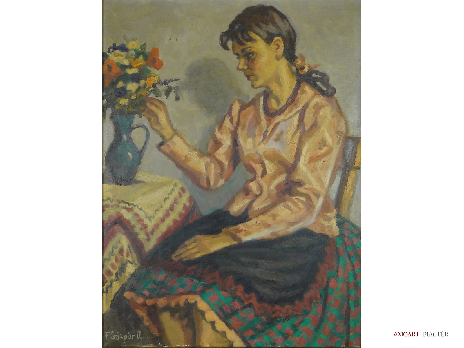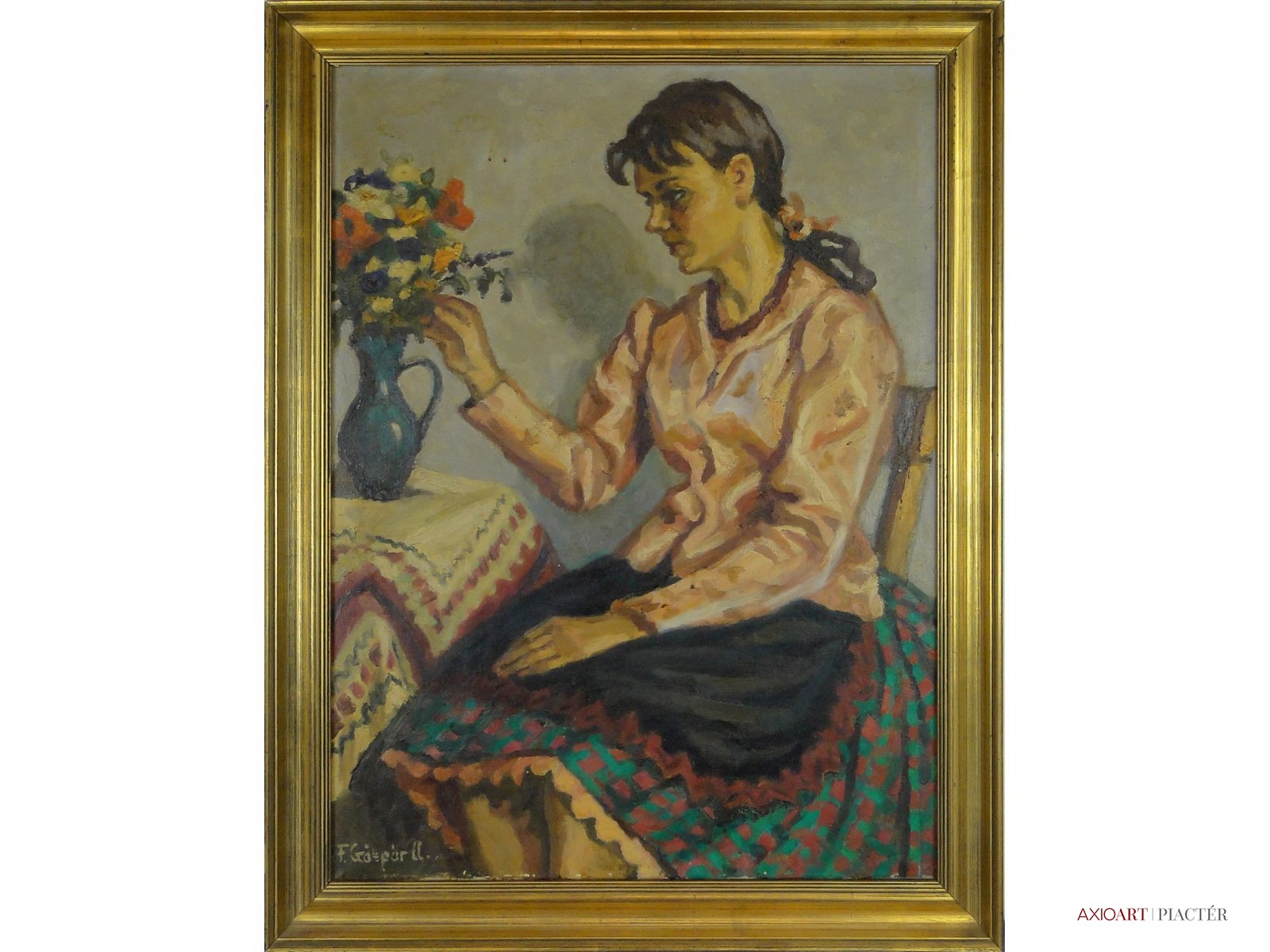 [0E331/053/2] Olaj vászon festmény, jelezve balra lent F. GÁSPÁR A. Szép állapotú, azonnal falra akasztható festmény. Magasság: 90 cm Szélesség: 70 cm Magyar festők és grafikusok életrajzi lexikona I-II. Festő. 1916-17-ben a budapesti Iparrajziskolában végzett tanulmányai után nagyobb európai tanulmányutat tett. Huszonöt év irodai munka után 1943-44-ben Bernáth Aurél korrigálta munkáit az örkényi Strasser szabadiskolában. 1948-49-ben az Elektromos Művek szabadiskolájában tanult, ahol Börzsönyi Kolarits Ferenc és Novotny Emil Róbert növendéke volt. Tanult Breznay Józseftől is. 1949-től állított ki. Több egyéni (Csók Galéria, Fényes Adolf Terem, Arad, Nagytétényi Kastélymúzeum, Békéscsaba, Nyíregyháza) és csoportos (Ernst Múzeum, Műcsarnok, Fővárosi Képtár, Berlin, Varsó, Moszkva, Bukarest, Szófia, stb.) kiállításon mutatta be műveit. 1950-ben Munkácsy-díjat kapott az I. Magyar Nemzeti Kiállításon. Naturalisztikus, leíró jellegű festészetének fő témája az enteriőr, de tájképekkel, csendéletekép- és arcképfestéssel is foglalkozott. (Heitler László adatközlése nyomán, ML) Magyar festők és grafikusok életrajzi lexikona I-II. Műgyűjtők és kereskedők kézikönyve Festő. A bp.-i Iparrajziskolában végzett tanulmányai után nagyobb európai tanulmányutat tett, majd szabadiskolákban Bernáth Aurél, Novotny Emil, Börzsönyi Ferenc irányításával képezte magát. Számos hazai tárlaton szerepelt. 1950-ben Munkácsy-díjat kapott. Naturalisztikus, leíró jellegű festészetének fő témája az enteriőr, de tájképekkel, csendéletkép- és arcképfestéssel is foglalkozik. (ML) Magyar festők és grafikusok adattára Iparrajziskolai tanulmányok után nagyobb európai tanulmányutat tett, majd szabadiskolákban, Bernáth Aurél, Novotny Emil, Börzsönyi Ferenc irányításával képezte magát. Első önálló tárlatát 1946-ban Aradon rendezte meg, majd a Csók Galériában (1955), a Nagytétényi Kastélymúzeumban (1973), a Fényes Adolf Teremben (1974) és Békéscsabán (1977) mutatkozott be önálló anyaggal. 1950-ben Munkácsy-díjjal tüntették ki. - Naturalisztikus leíró jellegű festészetének fő témája az enteriőr, de tájképpel, csöndélettel és arcképfestéssel is foglalkozik. - Irod.: P.Sz.T.: Művész életrajzok. Bp. 1985. Művészeti lexikon I-IV. Festő, Munkácsy-díjas. Magánúton tanult. 1946-ban Aradon arcképeiből gyűjt. kiállítást rendezett. 1949 óta állít ki Bp.-en. Ismertebb képei: Készülődés május 1-re, Füttyös kalauznő. 1955-ben gyűjt. kiállítása volt a Csók Galériában. Művész életrajzok kortárs magyar képzőművészek Iparrajziskolai tanulmányok után nagyobb tanulmányutat tett, majd szabadiskolákban, Bernáth Aurél, Novotny Emil, Börzsönyi Ferenc irányításával képezte magát. Első önálló tárlatát 1946-ban Aradon rendezte meg, majd a Csók Galériában (1955), a Nagytétényi Kastélymúzeumban (1973), a Fényes Adolf Teremben (1974), Békéscsabán (1977), Nyíregyházán (1980) és Miskolcon (1982) jelentkezett önálló anyaggal. 1950-ben Munkácsy-díjat kapott. - Leíró jellegű festészetének fő témája az enteriőr, de tájképpel, csendélettel, portréábrázolással is foglalkozik. Festői nyelve erőteljes, markáns, mondandóit közérthetően, biztos szakmai tudással jeleníti meg.