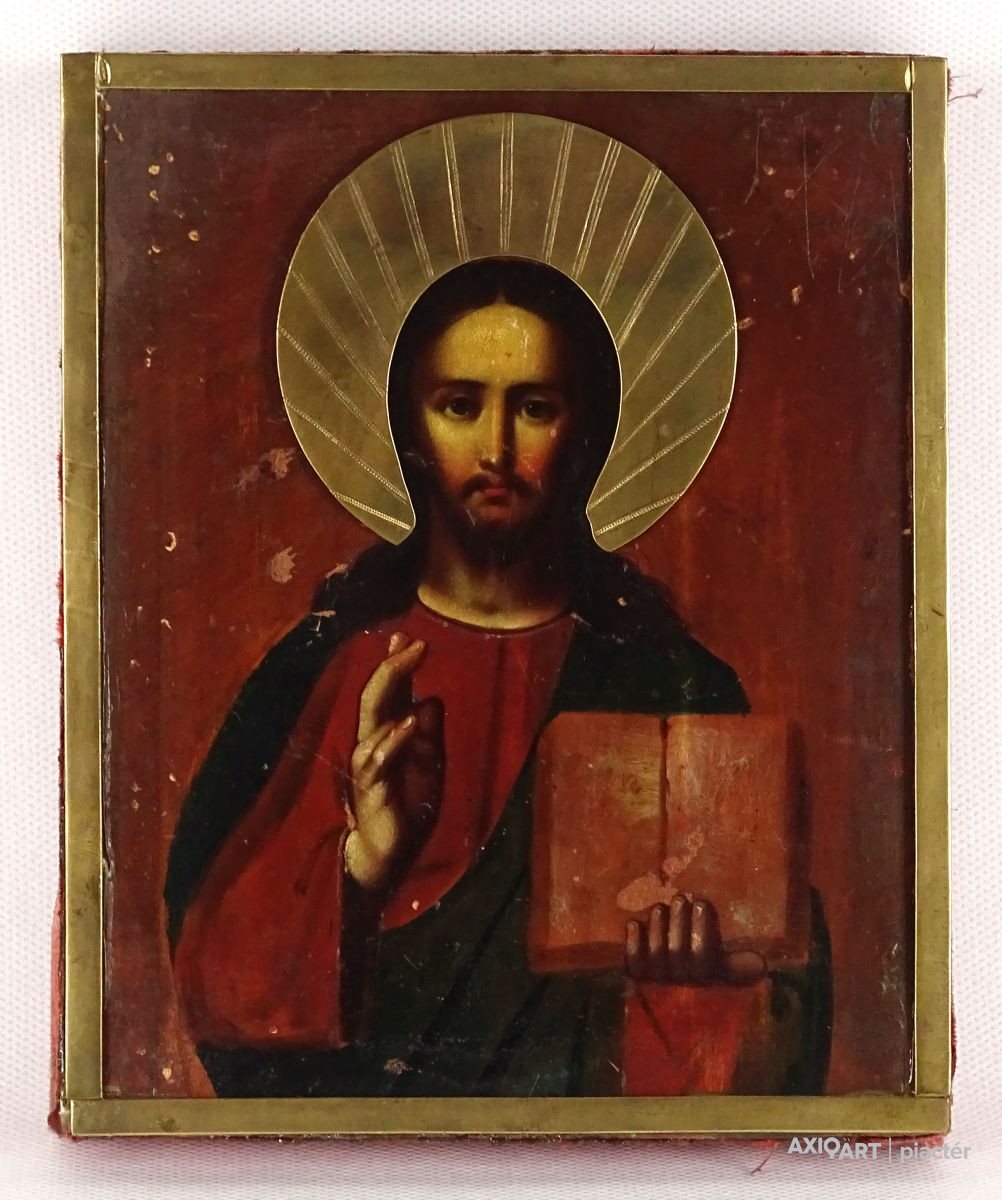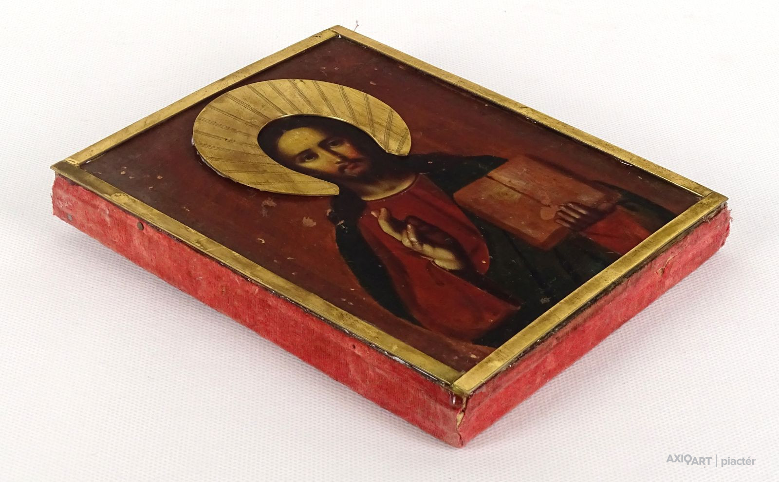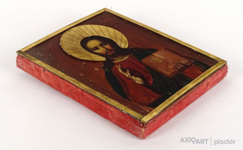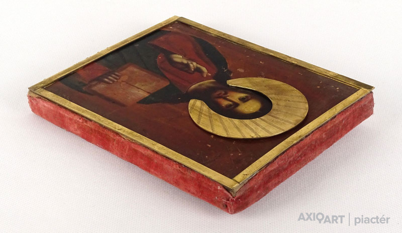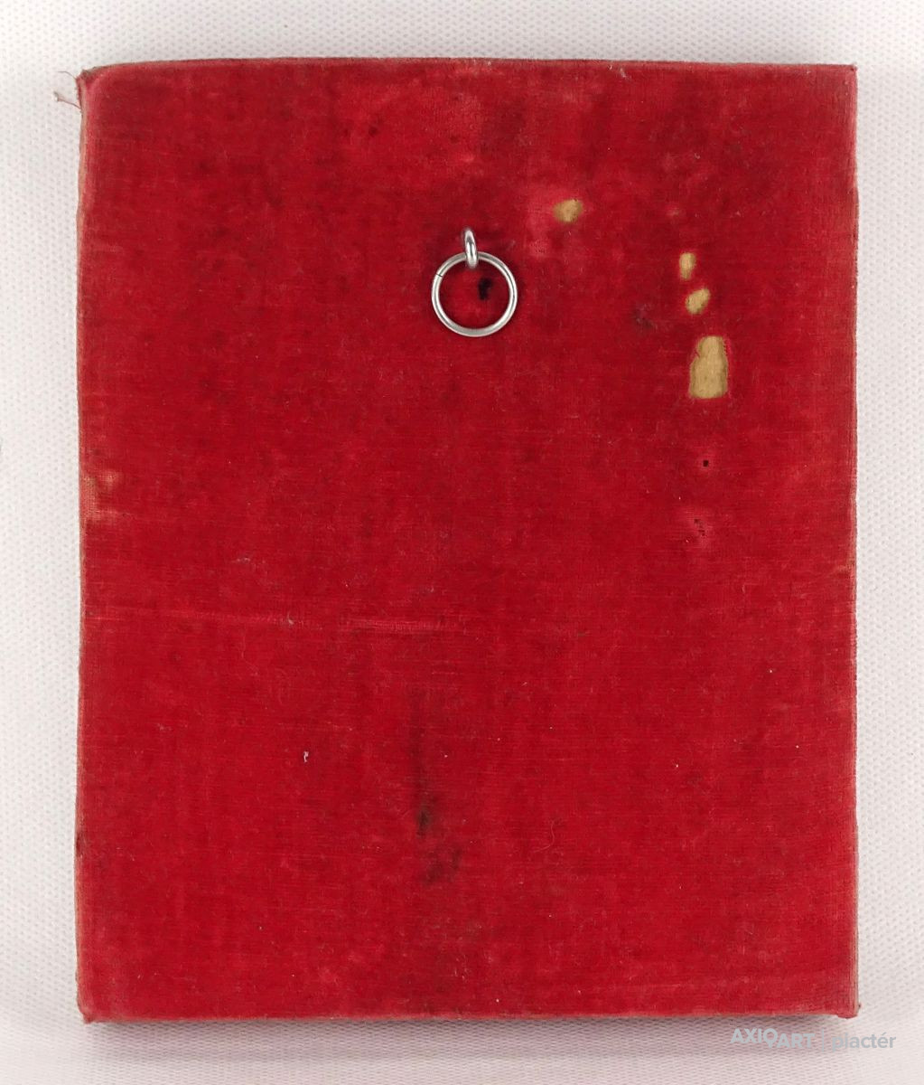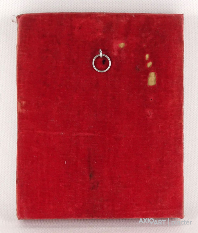 [1Q798/X018] Fa táblára festett ikonkép réz rátétekkel. Akasztási lehetőséggel rendelkezik. A fa lap hátoldala piros anyaggal borított. Magasság: 17.5 cm Szélesség: 14.3 cm Súly: 0.29 kg