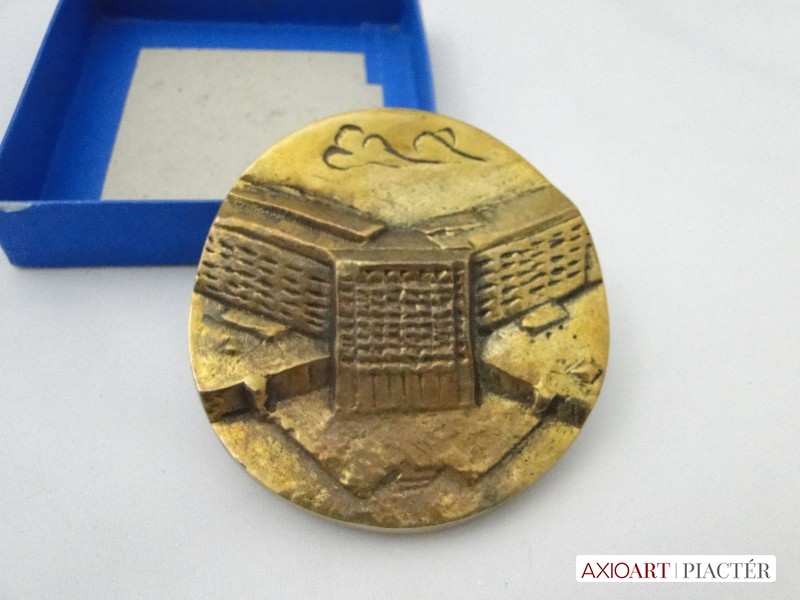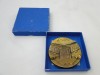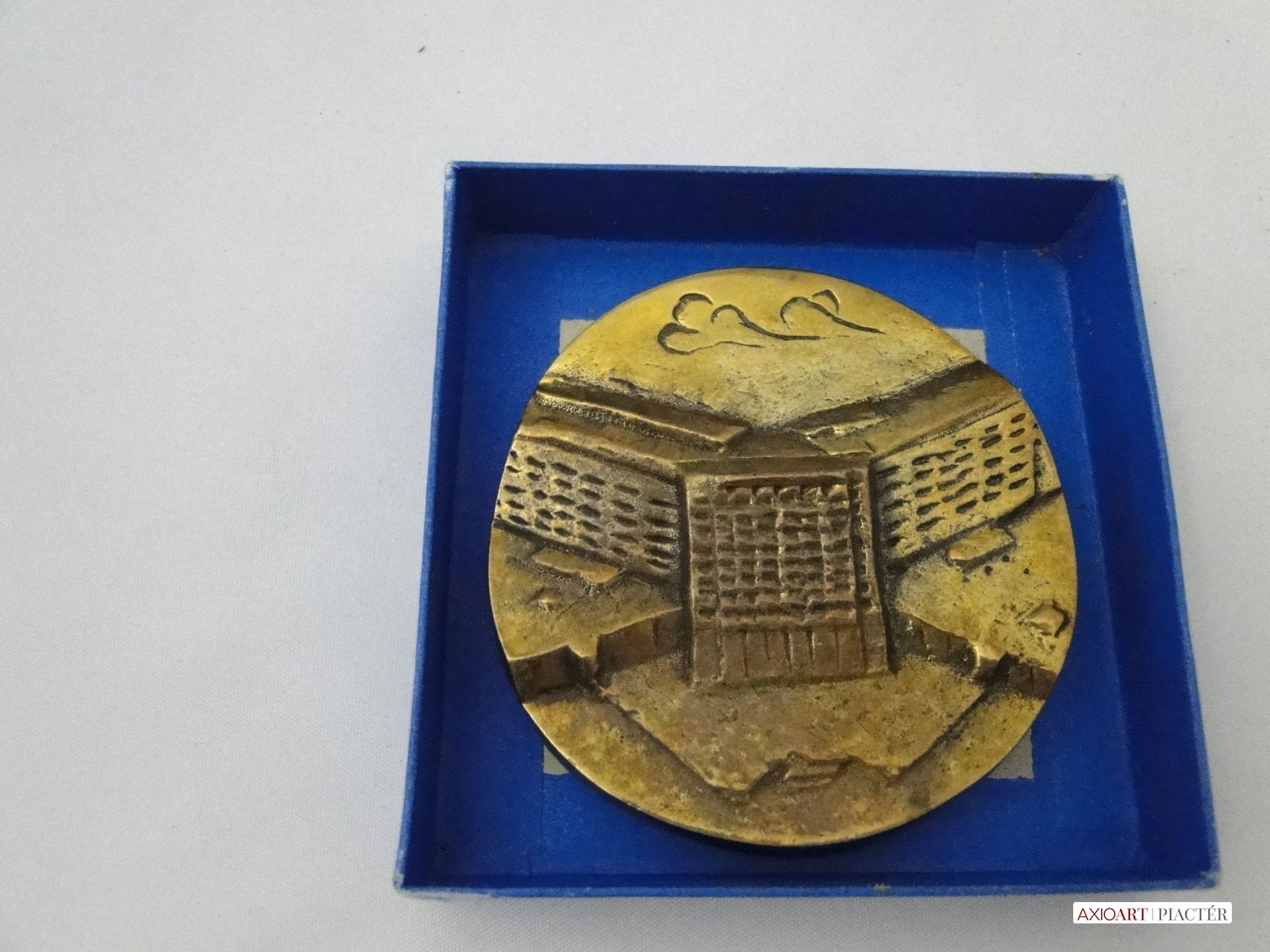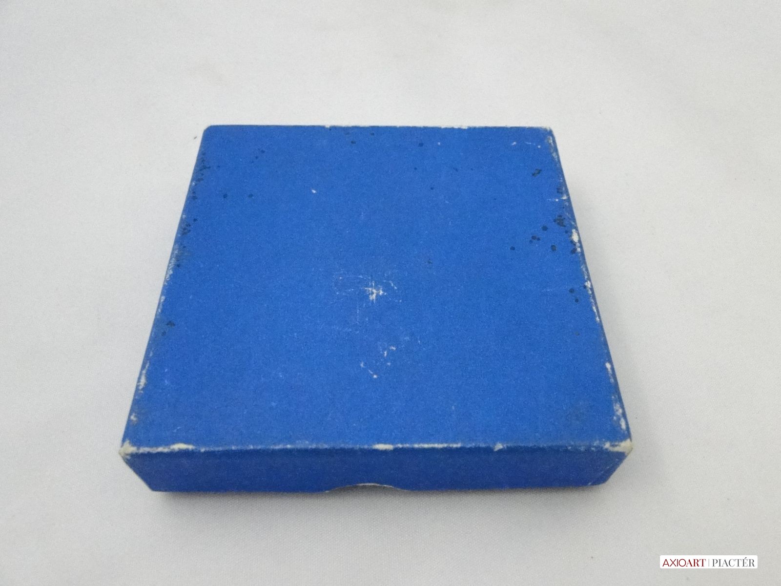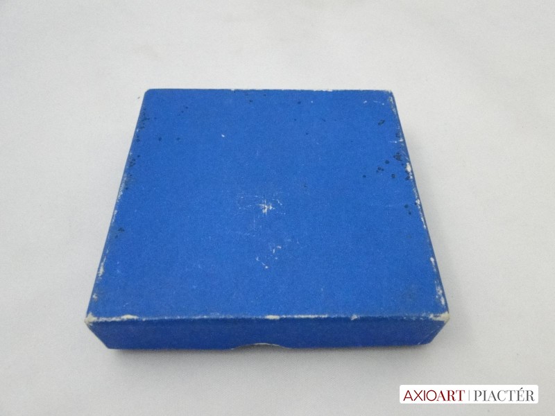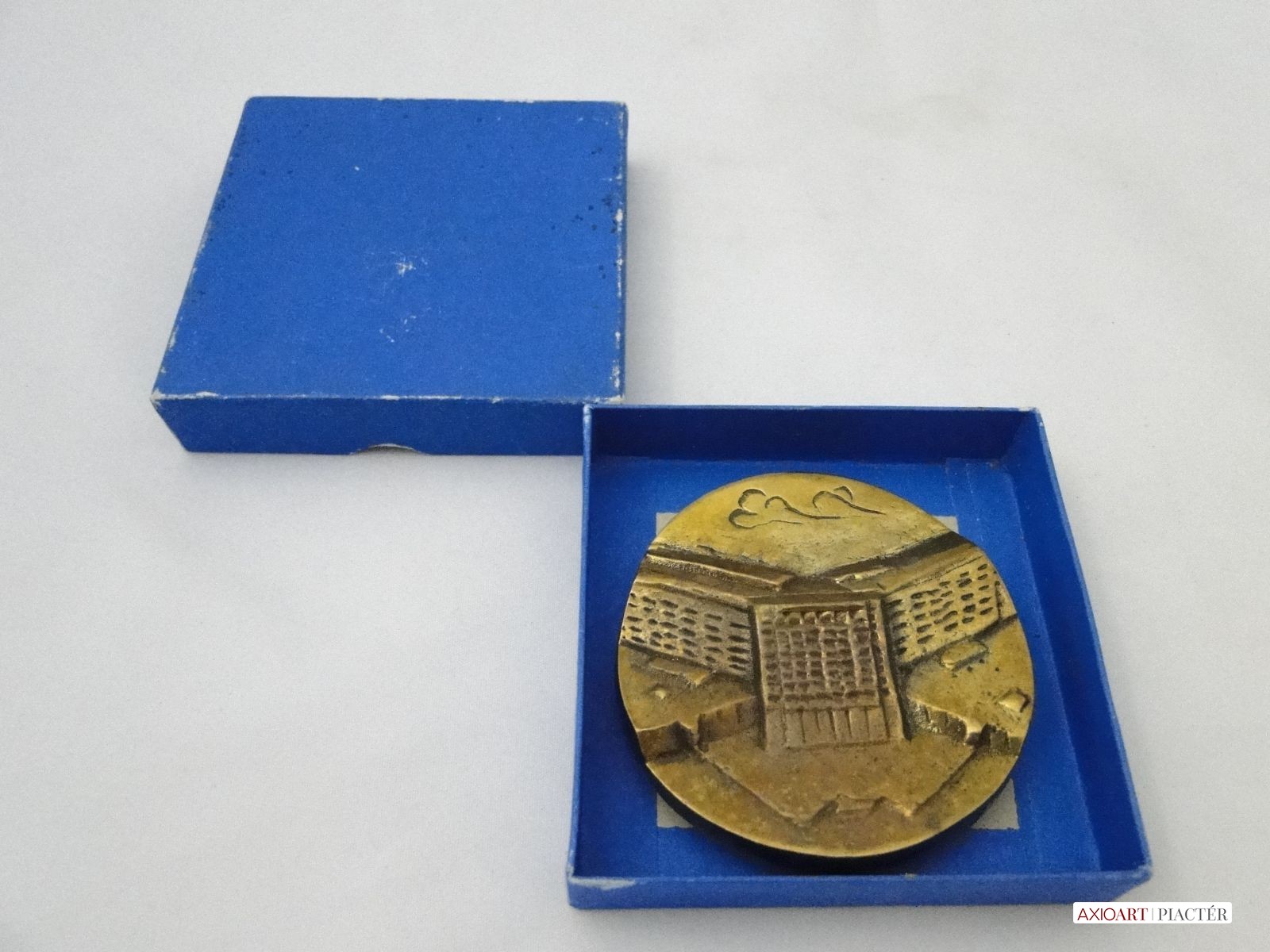 Kék színű papírdobozban nehéz kétoldalas rézplakett, emlékplakett.