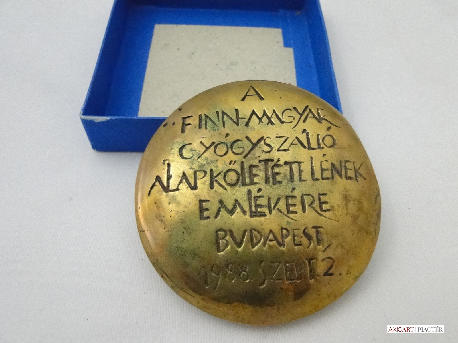 [5918/X109] Kék színű papírdobozban nehéz kétoldalas rézplakett, emlékplakett. Felirat: A FINN-MAGYAR GYÓGYSZÁLLÓ ALAPKŐLETÉTELÉNEK EMLÉKÉRE BUDAPEST 1988. SZEPT. 2. Magasság: 2 cm Szélesség: 9.5 cm Hosszúság: 9.5 cm Súly: 0.467 kg A díszdoboz mérete:  9,5 x 9,5 x 2 cm Lemez átmérő: 8 cm Plakett súlya: 0.438 kg