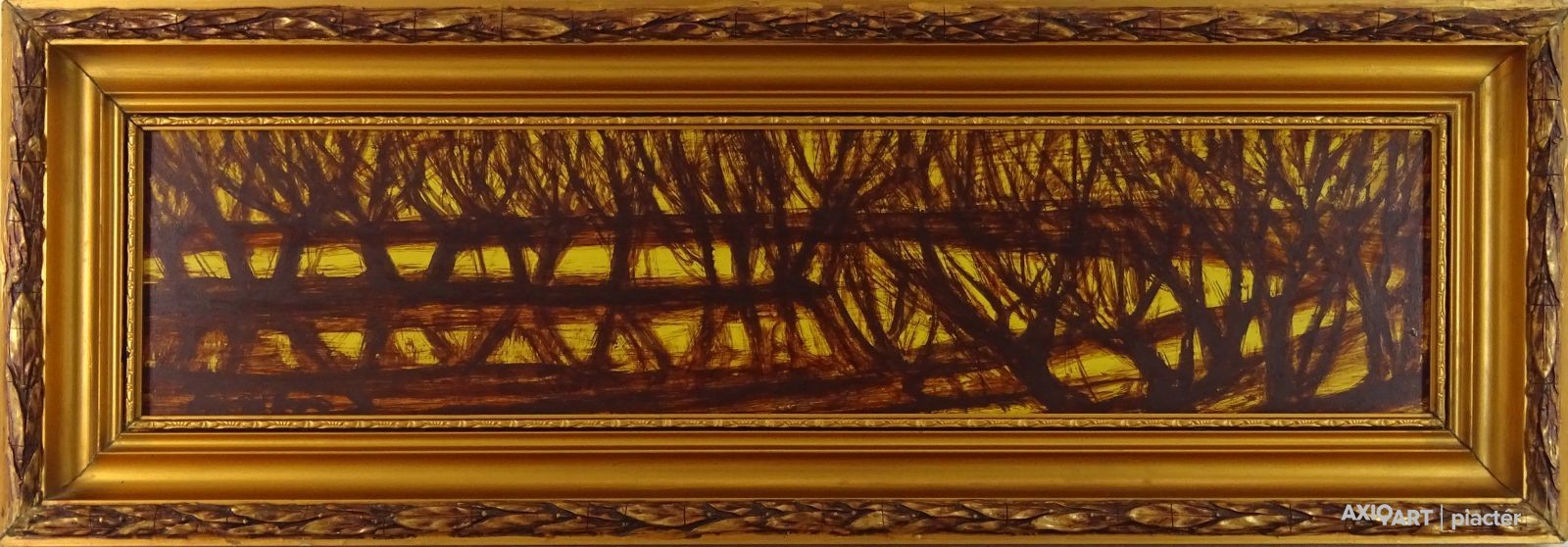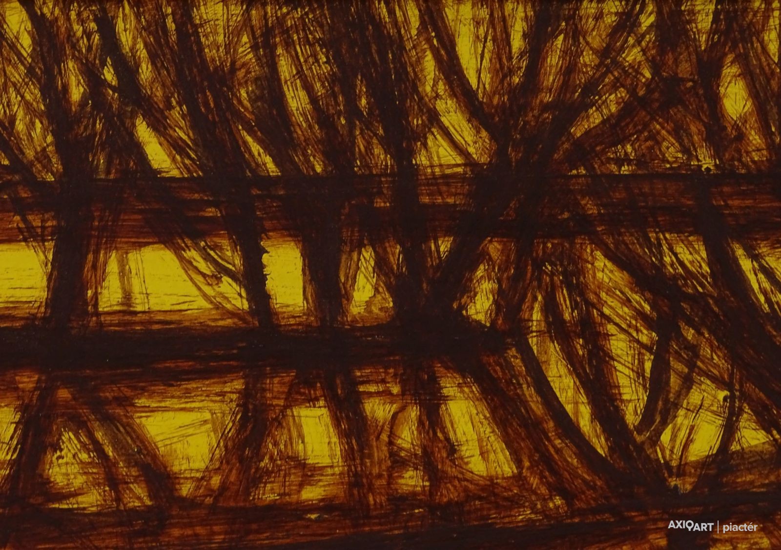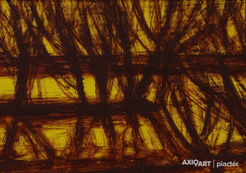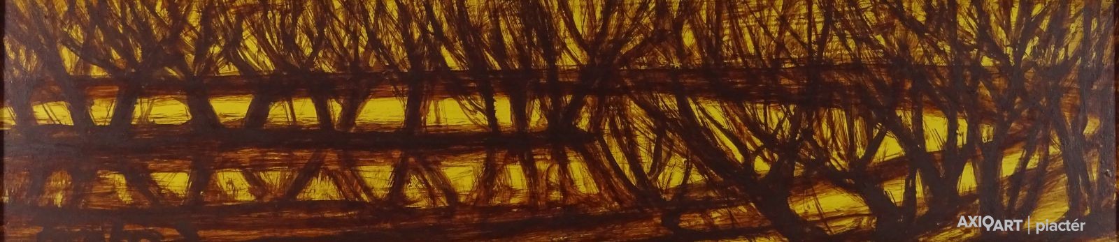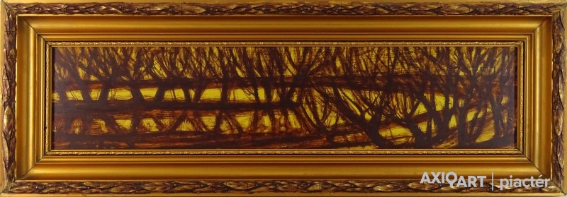 [FK3226/FL-4] A kép mérete: 20 x 40 cm keret nélkül. Készült: Olaj, Farostlemez A kép Fontos Sándor (Szeged, 1920, Szeged, 1991) alkotása. Jelezve Jobbra lent "Fontos S." A festmény jó állapotban van. Keret: Ép A festmény hátoldalán autográf írással: Dr. Simon Pálnak szeretettel Fontos Sándor Szeged 1972. XII. 12. Magyar festők és grafikusok életrajzi lexikona I-II. Festő. Tanulmányait 1951-55 között a szegedi Tanárképző Főiskolán végezte Vinkler László növendékeként. Előbb Üllésen, majd 1969-től Szegeden dolgozott, mint rajzpedagógus. 1952-től állított ki. Kiállításai voltak a szegedi Gulácsy Teremben, a hódmezővásárhelyi Tornyai Múzeumban, a szegedi Móra Ferenc Múzeumban, a fővárosi Mednyánszky Teremben és a Magyar Nemzeti Galériában. 1975-1982 között rendszeresen részt vett a Szegedi Nyári Tárlatokon, 1975-87 között a Vásárhelyi Ősz Tárlatokon. Festészetében egy időben a konstruktivitás volt jellemző, majd egyféle lírai-konstruktív stílus jellemzi. Pályája utolsó éveiben mozgalmas, jelképes és ironikus felfogású figurális kompozíciókat alkotott. Az alföldi homoktájak sajátosságát, szépségét egyéni módon vitte vászonra. Díjak: a Csongrád megyei Tanács alkotói díja; a Munka Érdemrend arany fokozata. A szegedi Móra Ferenc Múzeum őrzi alkotásait. (Szuromi Pál adatközlése nyomán, MÉ) Magyar festők és grafikusok életrajzi lexikona I-II. Műgyűjtők és kereskedők kézikönyve Festő. Tanulmányait a szegedi Tanárképző Főiskolán végezte Vinkler László tanítványaként. Eleinte Üllésen, majd 1969-től Szegeden dolgozott mint rajzpedagógus. 1952 óta kiállító művész. Kiállításai voltak a Szegedi Gulácsy Teremben, a hódmezővásárhelyi Tornyai Múzeumban, a szegedi Móra Ferenc Múzeumban, fővárosi a Mednyánszky Teremben, a MNG-ban. Festészetében egy időben a konstruktivitás volt jellemző, később egyféle lírai-konstruktív stílus jellemzi. A Szegedi Nyári Tárlatok többszörös kitüntetettje. Az alföldi homoktájak sajátosságát, szépségeit, szépségét egyéni módon viszi vászonra. (MÉ) Magyar festők és grafikusok adattára Tanulmányait a Szegedi Tanárképző Főiskolán 1955-ben végezte Vinkler László növendékeként. Rajztanári oklevelet szerzett. Évekig pedagógus Üllésen, majd 1969 óta Szegeden él. 1952-től kiállító művész, 1960-ban, 1965-ben és 1974-ben a szegedi Gulácsy-bemutatóteremben, 1962-ben a hódmezővásárhelyi Tornyai Múzeumban, 1963-ban a szegedi Móra Ferenc Múzeumban, 1976-ban a Mednyánszky Teremben mutatkozott be önállóan. 1967-ben nagyobb anyaggal szerepelt a szegedi képzőművészet kiállításán a Magyar Nemzeti Galériában. A csoportos tárlatok rendszeres kiállító művésze. A Szegedi Nyári Tárlatok többszörös kitüntetettje. Gyűjteményes kiállítását 1980-ban Békéscsabán, a Munkácsy Mihály Múzeumban nagyobb anyaggal szerepelt. 1987-ben Budapesten a Mednyánszky Teremben nyílt kiállítása. Festészetében egy időben a konstrukitvitás volt jellemző, később azonban egyféle lírai-konstruktív stílus jellemzi. Stílusának föltűnő jegye, hogy mély színezésű képeit átszövik a kompozíciót kialakító vonalak, amelyek mintegy érhálózatát adják a műnek. Az alföldi homoktájak sajátosságát, szépségét egyéni módon viszi vászonra. - Irod.: P. Sz. T.: Művész életrajzok, Bp. 1985. - ÖLK Művész életrajzok kortárs magyar képzőművészek Festő. A szegedi Tanárképző Főiskolán szerzett 1955-ben rajztanári diplomát Vinkler László növendékeként. Évekig művész-pedagógus az üllési tanyavilágban, 1969 óta Szegeden él. 1952 óta kiállító művész; 1960-ban, 1965-ben és 1974-ben a Képcsarnok szegedi bemutatótermében, 1962-ben a vásárhelyi Tornyai Múzeumban, 1963-ban és 1980-ban a szegedi Móra Ferenc Múzeum képtárában, 1976-ban a Mednyánszky Teremben, 1978-ban Kecskeméten, 1979-ben Csongrádon, 1981-ben Siófokon és Szolnokon, 1983-ban Esztergomban és Békéscsabán mutatkozott be önálló kollekciókkal. Egyes művei eljutottak Jugoszláviába, a Szovjetunióba, az NDK-ba és Finnországba. A csongrád megyei Tanács művészeti díjának (1976) kitüntetettje, a Szegedi Nyári Tárlat többszörös díjnyertese. - Hol expresszív erejű, hol költői hangulatú piktúrájának központi témája a szegedi tanyavilág, az itt élő emberek. Stílusának jellegzetessége, hogy mélyszínezésű képeit átszövik a kompozíciót kialakító vonalak, amelyek mintegy érhálózatát adják a műnek, lüktető mozgást víve az ábrázolásokba. Újabban az absztrakció felé tájékozódik. Kortárs magyar művészeti lexikon I-III. Festő. 1951-55 szegedi Juhász Gy. TF, mestere: Vinkler László. 1976: Csongrád megyei Tanács alkotói díja, Szeged. 1980: Munka Érdemrend arany fokozata. Szegeden élt. A 70-es évekig leginkább szerkezetes elvű, dekoratív hangvételű tájképeket készített. Majd felszámolja a reális földi látszatokat, s helyettük kozmikus képzetű, expresszív látomásokat hoz létre. Pályája utolsó éveiben mozgalmas, jelképes és ironikus felfogású figurális kompozíciókat alkotott. Ek: 1963: Tornyai J.M., Hmvhely; 1965: Móra F. M. Képtára, Szeged; 1976: Mednyánszky T.; 1978: Kecskeméti Képtár; 1980: Móra F. M.; Képtára, Szeged; 1984: Várm., Esztergom; 1990: Móra F. M. Képtára, Szeged. Vcsk: 1967: Szegedi képzőművészek tárlata, MNG; 1975-82: Szegedi Tárlat, Móra M. Képtára, Szeged; 1975-87: Vásárhelyi Őszi Tárlat, Tornyai J. M., Hmvhely; 1986: Szeged képzőművészete, Móra F. M. Képtára, Szeged. Mk: Móra F. M., Szeged. Irod.: Szelesi Z.: Alföldi művészek között. Fontos Sándor, Tiszatáj, 1965/1.; Tasnádi A.: Fontos Sándornál, Tiszatáj, 1980/3. (Sz. P.)