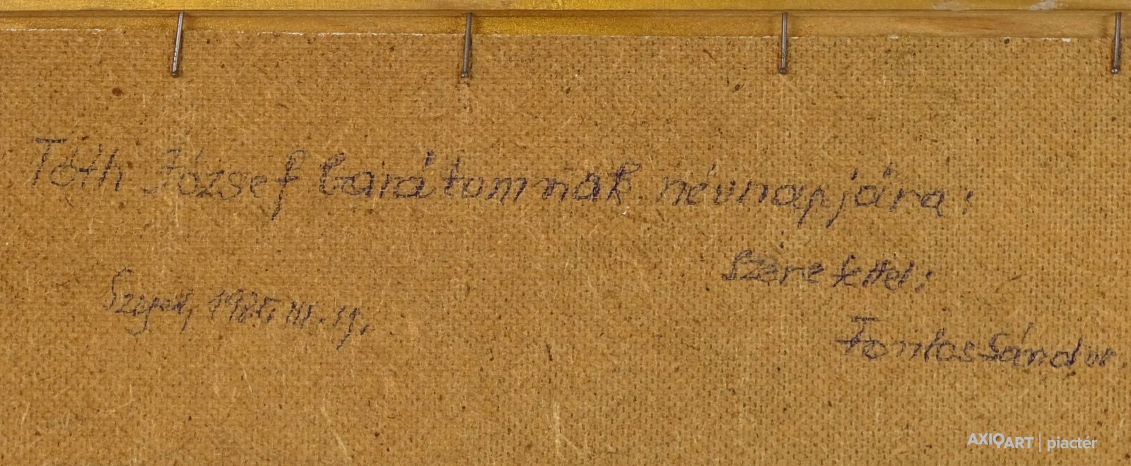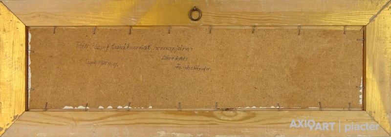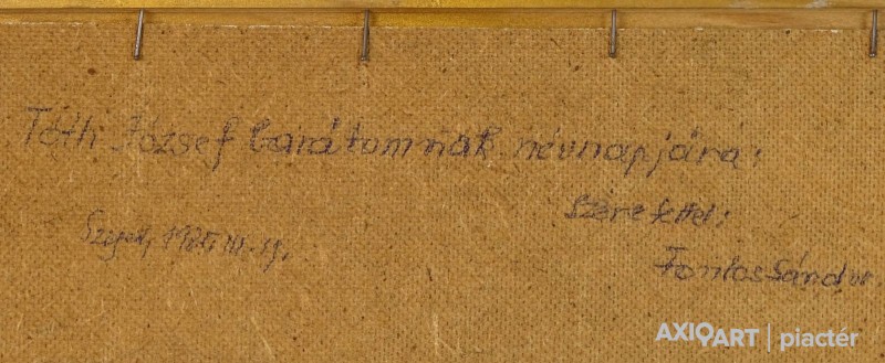 [0M332/053] Olaj farost festmény, szép állapotú aranyozott keretben. Jelezve balra lent: FONTOS S. Hátoldalán ajándékozási felirat, lásd fotó. Magasság: 24 cm Szélesség: 70 cm Súly: 1.65 kg Fontos Sándor festő Születési hely: Szeged Születési dátum: 1920 Kiállítások az adatbázisban: Mesterei: Vinkler László. 1951-55 szegedi Juhász Gyula Tanárképző Főiskola, mestere: Vinkler László. 1976: Csongrád megyei Tanács alkotói díja, Szeged. 1980: Munka Érdemrend arany fokozata. Szegeden élt. A 70-es évekig leginkább szerkezetes elvű, dekoratív hangvételű tájképeket készített. Majd felszámolja a reális földi látszatokat, s helyettük kozmikus képzetű, expresszív látomásokat hoz létre. Pályája utolsó éveiben mozgalmas, jelképes és ironikus felfogású figurális kompozíciókat alkotott. Egyéni kiállítások 1965 • Móra Ferenc Múzeum Képtára, Szeged 1978 • Kecskeméti Képtár 1984 • Vármúzeum, Esztergom 1990 • Móra Ferenc Múzeum Képtára, Szeged. Válogatott csoportos kiállítások 1967 • Szegedi képzőművészek tárlata, Magyar Nemzeti Galéria, Budapest 1986 • Szeged képzőművészete, Móra Ferenc Múzeum Képtára, Szeged. Művek közgyűjteményekben Móra Ferenc Múzeum, Szeged. Irodalom SZELESI Z.: Alföldi művészek között. ~, Tiszatáj, 1965/1. Szuromi Pál Forrás: Artportal.hu