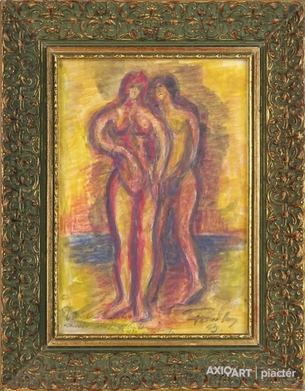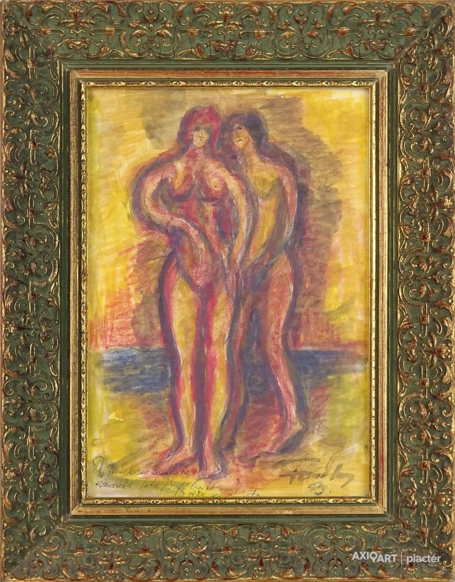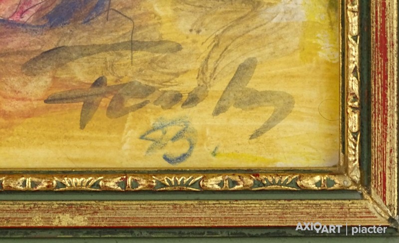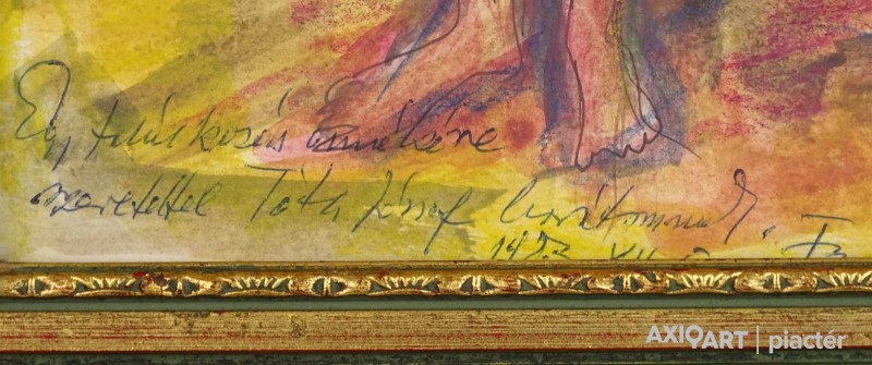 [0M340/074] Papír akvarell, vegyestechnika festmény, szép állapotú aranyozott keretben, üveglap mögött. Jelezve jobbra lent: FONTOS S. 83 Balra lent autográf ajándékozási feljegyzés: "EGY TALÁLKOZÁS EMLÉKÉRE.... 1983" Magasság: 42 cm Szélesség: 33 cm Súly: 1.5 kg Fontos Sándor festő Születési hely: Szeged Születési dátum: 1920 Kiállítások az adatbázisban: Mesterei: Vinkler László. 1951-55 szegedi Juhász Gyula Tanárképző Főiskola, mestere: Vinkler László. 1976: Csongrád megyei Tanács alkotói díja, Szeged. 1980: Munka Érdemrend arany fokozata. Szegeden élt. A 70-es évekig leginkább szerkezetes elvű, dekoratív hangvételű tájképeket készített. Majd felszámolja a reális földi látszatokat, s helyettük kozmikus képzetű, expresszív látomásokat hoz létre. Pályája utolsó éveiben mozgalmas, jelképes és ironikus felfogású figurális kompozíciókat alkotott. Egyéni kiállítások 1965 • Móra Ferenc Múzeum Képtára, Szeged 1978 • Kecskeméti Képtár 1984 • Vármúzeum, Esztergom 1990 • Móra Ferenc Múzeum Képtára, Szeged. Válogatott csoportos kiállítások 1967 • Szegedi képzőművészek tárlata, Magyar Nemzeti Galéria, Budapest 1986 • Szeged képzőművészete, Móra Ferenc Múzeum Képtára, Szeged. Művek közgyűjteményekben Móra Ferenc Múzeum, Szeged. Irodalom SZELESI Z.: Alföldi művészek között. ~, Tiszatáj, 1965/1. Szuromi Pál Forrás: Artportal.hu