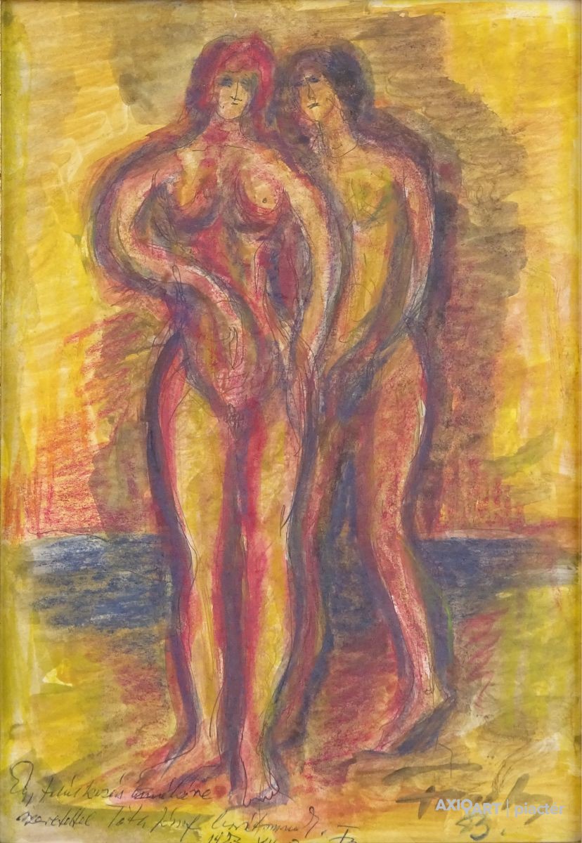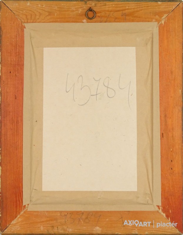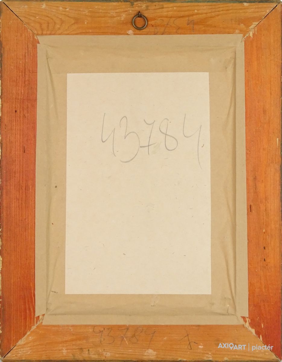 [FKA862/Z026] A kép mérete: 33 x 24 cm keret nélkül. Készült: Akvarell, Papír A kép Vinkler László (Szabadka, 1912, Szeged, 1980) alkotása. Jelezve jobbra lent "Vinkler László" A festmény jó állapotban van. Keret: Paszpartúban Magyar festők és grafikusok életrajzi lexikona I-II. Festő. Tanulmányait Lápossy-Hegedűs Géza irányításával kezdte. A budapesti Képzőművészeti Főiskolán Glatz Oszkár és Karlovszky Bertalan tanítványa volt. 1935-ben diplomázott. 1933-ban a főiskola jubileumi tárlatán a "Nagymamám" című alkotásával elnyerte a Balló-díjat. 1935-1936-ban római ösztöndíjas volt, és a Collegium Hungaricum-ban töltött nyolc hónapot. Szorgalmasan dolgozott, közben tanulmányokat folytatott az Accademia delle Belle Arti freskó-osztályán, Ferazzi irányítása mellett. Az itt készült "Maria Surigia" című képmását 1936-ban a Collegium Hungaricum kiállításán mutatta be, amelyet az olasz állam vásárolt meg. A "Római szobrásznő" című képe 1937-ben elnyerte a Jellinek-díjat. Az alkotás jelenleg a Magyar Nemzeti Galéria tulajdona. Számos kelet- és nyugat-európai országban járt tanulmányúton. 1931-től szerepelt hazai és külföldi bemutatókon. Egyéni kiállításai voltak Szegeden (1942, 1958, 1963, 1972), az Ernst Múzeumban (1959), Olaszországban (1961), Jugoszláviában (1968). Nagyobb anyaggal szerepelt a szegedi művészek 1967-es Magyar Nemzeti Galéria-béli kiállításán. 1932-ben Balló-díjat, 1937-ben Fényes Adolf-díjat kapott, 1972-ben Szeged város alkotói-díját, 1979-ben a Szegedi Nyári Tárlat díját nyerte el. Éveken keresztül (tizenöt év megszakítással) a szegedi Tanárképző Főiskola rajzi tanszékének vezetőjeként működött. Korábban protréfestőként volt ismeretes. Karlovszky mellett a rajz kultuszára és a csendéleti formalátásra kapott indíttatásokat, később Glatz hatott rá, így a rajzos analizálás helyett a művész a szélesebb festőiségre tért át. A naturalizmussal elvi szakítást jelentő harmadik stílusát a novocento jelképes, színesen dekoratív szellemében alakította ki. Jeles grafikus volt. Több irodalmi művet illusztrált. Monumentális feladatokkal is foglalkozott (freskók a Petőfi-telepi templomban stb.). 1957-ben a városban végzett művészi tevékenysége elismerésül a szegedi Collegium Artium Képzőművészeti tagozata vezetőjévé választotta. Műveinek jelentős részét a szegedi Móra F. Múzeum őrzi. (PZ-SzMF,D.E.: Műv. 1927/6, ML, Sz.Z.: Műv. 1973/1, Műv. 1982/10. D.F.Zs.: Műv. 1973/8.) Magyar festők és grafikusok életrajzi lexikona I-II. Műgyűjtők és kereskedők kézikönyve Festő. Tanulmányait Lápossy-Hegedűs Géza irányításával kezdte. A budapesti Képzőművészeti Főiskolán Glatz Oszkár és Karlovszky Bertalan tanítványa volt. 1931 óta kiállító művész. 1933-ban a főiskola jubileumi kiállításán a "Nagymamám" c. festményével elnyerte a Balló-díjat. 1935-36-ban római ösztöndíjas volt. Az Accademia della Bella Arti freskó-osztályán, Ferazzi mester mellett folytatott tanulmányokat. Az itt készült "Maria Surigia" c. portréját 1936-ban a Collegium Hungaricum kiállításán mutatta be, amelyet az olasz állam vásárolt meg. A "Római szobrásznő" c. képe 1937-ben elnyerte a Jellinek-díjat. A mű a MNG tulajdona. Több kelet- és nyugat-európai országban járt tanulmányúton. Egyéni kiállításai voltak Szegeden (1942, 1958, 1963, 1972), az Ernst Múzeumban (1959), Olaszországban (1961), Jugoszláviában (1968). Nagyobb anyaggal szerepelt a szegedi művészek 1967-es MNG-beli kiállításán. 1937-ben Fényes Adolf-díjat, 1972-ben elnyerte Szeged város alkotói-díját, 1979-ben a Szegedi Nyári Tárlat díját. Ezen kívül művészpedagógusi és alkotói tevékenysége elismeréseként még számos kitüntetéssel és díjjal jutalmazták. Hosszabb ideig a szegedi Tanárképző Főiskola rajztanszékének vezetőjeként tevékenykedett. Korábban arcképfestőként volt ismeretes. Karlovszky mellett a rajz kultuszára és a csendéleti formalátásra kapott indíttatásokat, később Glatz Oszkár hatott rá és a rajzos analizálás helyett a szélesebb festőiségre tért át. A naturalizmussal elvi szakítást jelentő harmadik stílusát a novocento jelképes, színesen dekoratív szellemében alakította ki. Jeles grafikus volt. Számos irodalmi művet illusztrált. Monumentális feladatokkal is foglalkozott. (freskók a Petőfi-telepi templomban, stb). (PZ-SzMF,ML,Sz.Z.: Műv.-1982/10) Magyar festők és grafikusok adattára Művészeti tanulmányait Lápossy-Hegedűs Géza irányításával kezdte, majd a Képzőművészeti Főiskolán Karlovszky Bertalan és Glatz Oszkár növendékeként fejezte be 1935-ben. 1931 óta kiállító művész. 1933-ban a főiskola jubileumi kiállításán a Nagymamám c. festményével elnyerte a Balló-díjat. A diploma megszerzését követően 1935-1936-ban római ösztöndíjas. Az itt készült Maria Surigia c. portréját az olasz állam megvásárolta. A Római szobrásznő c. képe 1937-ben elnyerte a Jellinek-díjat, s amelyet ma az MNG őriz. Számos kelet- és nyugat-európai országban megfordult tanulmányúton. Egyéni kiállításai voltak Szegeden (1942, 1958, 1963, 1968, 1972), az Ernst Múzeumban (1959) és Dunaújvárosban (1977), illetve külföldön Olaszországban (1961) és Jugoszláviában (1968). Nagyobb anyaggal szerepelt a szegedi művészek 1967-ben MNG-beli bemutatóján. 1972-ben elnyerte Szeged város alkotói díját és 1979-ben a Szegedi Nyári Tárlat díját. Hosszabb időt töltött a Szegedi Tanárképző Főiskola rajztanszékének élén. Emlékkiállítását 1982-ben a szegedi Móra Ferenc Képtárban és a MNG-ban rendezték meg. Karlovszky mellett a rajz kultuszára és a csöndéleti formalátásra kapott indíttatásokat, később Glatz hatott rá és a ra