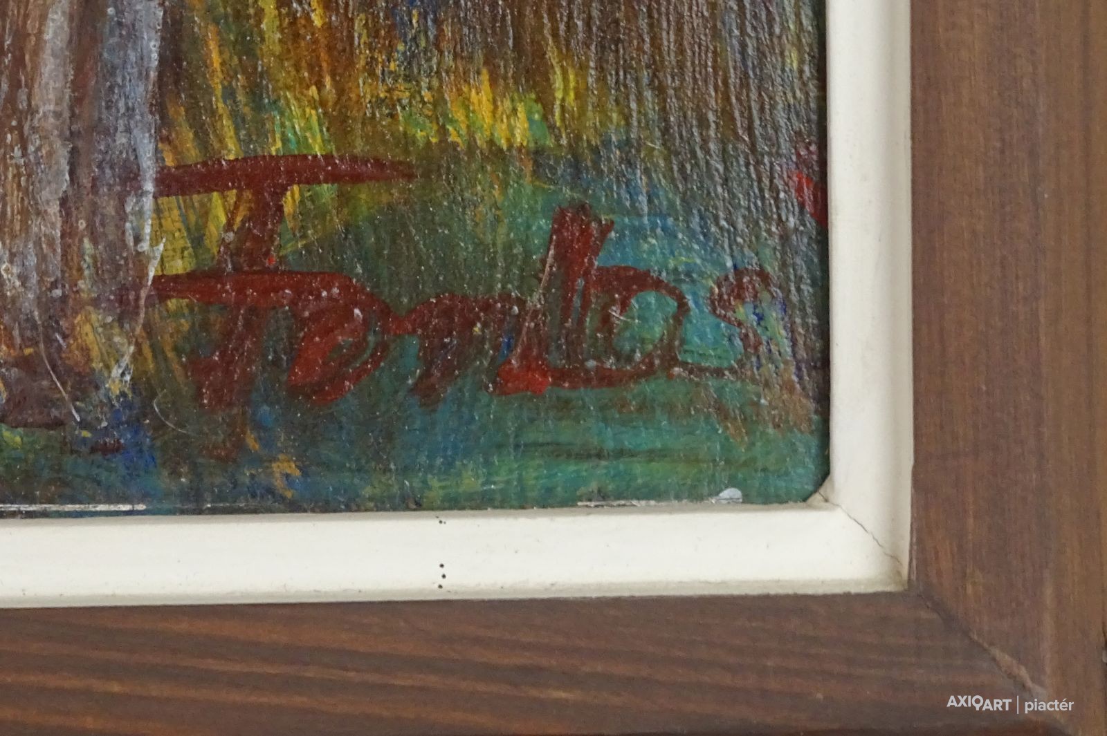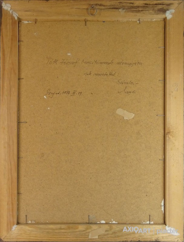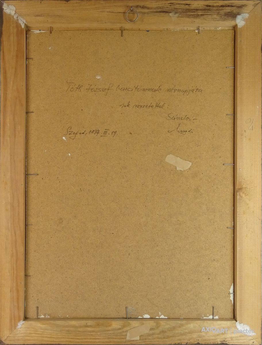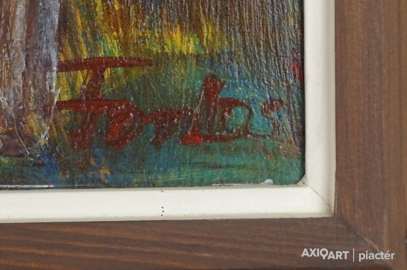 [0M330/035] Olaj farost festmény, képcsarnokos barna keretben. Jelezve jobbra lent: FONTOS S. Hátoldalán datált ajándékozási feljegyzés, lásd fotó. Magasság: 82 cm Szélesség: 62 cm Súly: 2.85 kg Fontos Sándor festő Születési hely: Szeged Születési dátum: 1920 Kiállítások az adatbázisban: Mesterei: Vinkler László. 1951-55 szegedi Juhász Gyula Tanárképző Főiskola, mestere: Vinkler László. 1976: Csongrád megyei Tanács alkotói díja, Szeged. 1980: Munka Érdemrend arany fokozata. Szegeden élt. A 70-es évekig leginkább szerkezetes elvű, dekoratív hangvételű tájképeket készített. Majd felszámolja a reális földi látszatokat, s helyettük kozmikus képzetű, expresszív látomásokat hoz létre. Pályája utolsó éveiben mozgalmas, jelképes és ironikus felfogású figurális kompozíciókat alkotott. Egyéni kiállítások 1965 • Móra Ferenc Múzeum Képtára, Szeged 1978 • Kecskeméti Képtár 1984 • Vármúzeum, Esztergom 1990 • Móra Ferenc Múzeum Képtára, Szeged. Válogatott csoportos kiállítások 1967 • Szegedi képzőművészek tárlata, Magyar Nemzeti Galéria, Budapest 1986 • Szeged képzőművészete, Móra Ferenc Múzeum Képtára, Szeged. Művek közgyűjteményekben Móra Ferenc Múzeum, Szeged. Irodalom SZELESI Z.: Alföldi művészek között. ~, Tiszatáj, 1965/1. Szuromi Pál Forrás: Artportal.hu