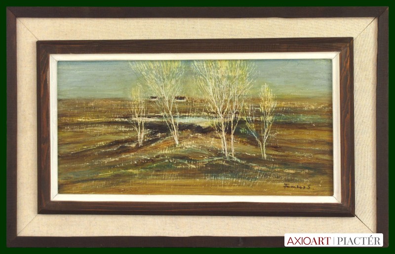 [FK3226/FL-4] A kép mérete: 20 x 40 cm keret nélkül. Készült: Olaj, Farostlemez A kép Fontos Sándor (Szeged, 1920, Szeged, 1991) alkotása. Jelezve Jobbra lent "Fontos S." A festmény jó állapotban van. Keret: Ép A festmény hátoldalán autográf írással: Dr. Simon Pálnak szeretettel Fontos Sándor Szeged 1972. XII. 12. Magyar festők és grafikusok életrajzi lexikona I-II. Festő. Tanulmányait 1951-55 között a szegedi Tanárképző Főiskolán végezte Vinkler László növendékeként. Előbb Üllésen, majd 1969-től Szegeden dolgozott, mint rajzpedagógus. 1952-től állított ki. Kiállításai voltak a szegedi Gulácsy Teremben, a hódmezővásárhelyi Tornyai Múzeumban, a szegedi Móra Ferenc Múzeumban, a fővárosi Mednyánszky Teremben és a Magyar Nemzeti Galériában. 1975-1982 között rendszeresen részt vett a Szegedi Nyári Tárlatokon, 1975-87 között a Vásárhelyi Ősz Tárlatokon. Festészetében egy időben a konstruktivitás volt jellemző, majd egyféle lírai-konstruktív stílus jellemzi. Pályája utolsó éveiben mozgalmas, jelképes és ironikus felfogású figurális kompozíciókat alkotott. Az alföldi homoktájak sajátosságát, szépségét egyéni módon vitte vászonra. Díjak: a Csongrád megyei Tanács alkotói díja; a Munka Érdemrend arany fokozata. A szegedi Móra Ferenc Múzeum őrzi alkotásait. (Szuromi Pál adatközlése nyomán, MÉ) Magyar festők és grafikusok életrajzi lexikona I-II. Műgyűjtők és kereskedők kézikönyve Festő. Tanulmányait a szegedi Tanárképző Főiskolán végezte Vinkler László tanítványaként. Eleinte Üllésen, majd 1969-től Szegeden dolgozott mint rajzpedagógus. 1952 óta kiállító művész. Kiállításai voltak a Szegedi Gulácsy Teremben, a hódmezővásárhelyi Tornyai Múzeumban, a szegedi Móra Ferenc Múzeumban, fővárosi a Mednyánszky Teremben, a MNG-ban. Festészetében egy időben a konstruktivitás volt jellemző, később egyféle lírai-konstruktív stílus jellemzi. A Szegedi Nyári Tárlatok többszörös kitüntetettje. Az alföldi homoktájak sajátosságát, szépségeit, szépségét egyéni módon viszi vászonra. (MÉ) Magyar festők és grafikusok adattára Tanulmányait a Szegedi Tanárképző Főiskolán 1955-ben végezte Vinkler László növendékeként. Rajztanári oklevelet szerzett. Évekig pedagógus Üllésen, majd 1969 óta Szegeden él. 1952-től kiállító művész, 1960-ban, 1965-ben és 1974-ben a szegedi Gulácsy-bemutatóteremben, 1962-ben a hódmezővásárhelyi Tornyai Múzeumban, 1963-ban a szegedi Móra Ferenc Múzeumban, 1976-ban a Mednyánszky Teremben mutatkozott be önállóan. 1967-ben nagyobb anyaggal szerepelt a szegedi képzőművészet kiállításán a Magyar Nemzeti Galériában. A csoportos tárlatok rendszeres kiállító művésze. A Szegedi Nyári Tárlatok többszörös kitüntetettje. Gyűjteményes kiállítását 1980-ban Békéscsabán, a Munkácsy Mihály Múzeumban nagyobb anyaggal szerepelt. 1987-ben Budapesten a Mednyánszky Teremben nyílt kiállítása. Festészetében egy időben a konstrukitvitás volt jellemző, később azonban egyféle lírai-konstruktív stílus jellemzi. Stílusának föltűnő jegye, hogy mély színezésű képeit átszövik a kompozíciót kialakító vonalak, amelyek mintegy érhálózatát adják a műnek. Az alföldi homoktájak sajátosságát, szépségét egyéni módon viszi vászonra. - Irod.: P. Sz. T.: Művész életrajzok, Bp. 1985. - ÖLK Művész életrajzok kortárs magyar képzőművészek Festő. A szegedi Tanárképző Főiskolán szerzett 1955-ben rajztanári diplomát Vinkler László növendékeként. Évekig művész-pedagógus az üllési tanyavilágban, 1969 óta Szegeden él. 1952 óta kiállító művész; 1960-ban, 1965-ben és 1974-ben a Képcsarnok szegedi bemutatótermében, 1962-ben a vásárhelyi Tornyai Múzeumban, 1963-ban és 1980-ban a szegedi Móra Ferenc Múzeum képtárában, 1976-ban a Mednyánszky Teremben, 1978-ban Kecskeméten, 1979-ben Csongrádon, 1981-ben Siófokon és Szolnokon, 1983-ban Esztergomban és Békéscsabán mutatkozott be önálló kollekciókkal. Egyes művei eljutottak Jugoszláviába, a Szovjetunióba, az NDK-ba és Finnországba. A csongrád megyei Tanács művészeti díjának (1976) kitüntetettje, a Szegedi Nyári Tárlat többszörös díjnyertese. - Hol expresszív erejű, hol költői hangulatú piktúrájának központi témája a szegedi tanyavilág, az itt élő emberek. Stílusának jellegzetessége, hogy mélyszínezésű képeit átszövik a kompozíciót kialakító vonalak, amelyek mintegy érhálózatát adják a műnek, lüktető mozgást víve az ábrázolásokba. Újabban az absztrakció felé tájékozódik. Kortárs magyar művészeti lexikon I-III. Festő. 1951-55 szegedi Juhász Gy. TF, mestere: Vinkler László. 1976: Csongrád megyei Tanács alkotói díja, Szeged. 1980: Munka Érdemrend arany fokozata. Szegeden élt. A 70-es évekig leginkább szerkezetes elvű, dekoratív hangvételű tájképeket készített. Majd felszámolja a reális földi látszatokat, s helyettük kozmikus képzetű, expresszív látomásokat hoz létre. Pályája utolsó éveiben mozgalmas, jelképes és ironikus felfogású figurális kompozíciókat alkotott. Ek: 1963: Tornyai J.M., Hmvhely; 1965: Móra F. M. Képtára, Szeged; 1976: Mednyánszky T.; 1978: Kecskeméti Képtár; 1980: Móra F. M.; Képtára, Szeged; 1984: Várm., Esztergom; 1990: Móra F. M. Képtára, Szeged. Vcsk: 1967: Szegedi képzőművészek tárlata, MNG; 1975-82: Szegedi Tárlat, Móra M. Képtára, Szeged; 1975-87: Vásárhelyi Őszi Tárlat, Tornyai J. M., Hmvhely; 1986: Szeged képzőművészete, Móra F. M. Képtára, Szeged. Mk: Móra F. M., Szeged. Irod.: Szelesi Z.: Alföldi művészek között. Fontos Sándor, Tiszatáj, 1965/1.; Tasnádi A.: Fontos Sándornál, Tiszatáj, 1980/3. (Sz. P.)