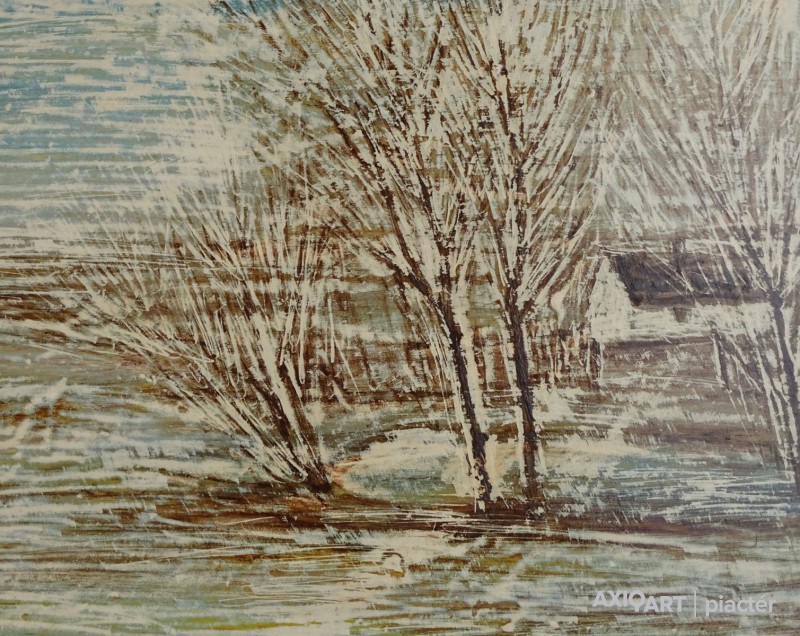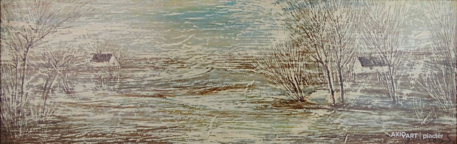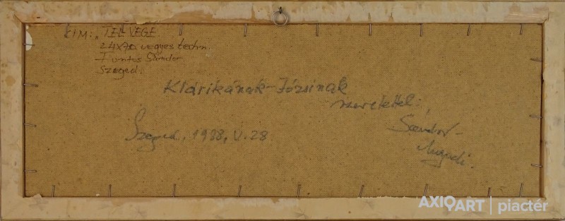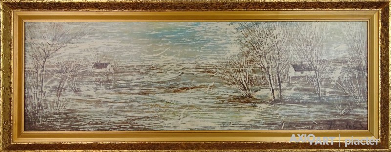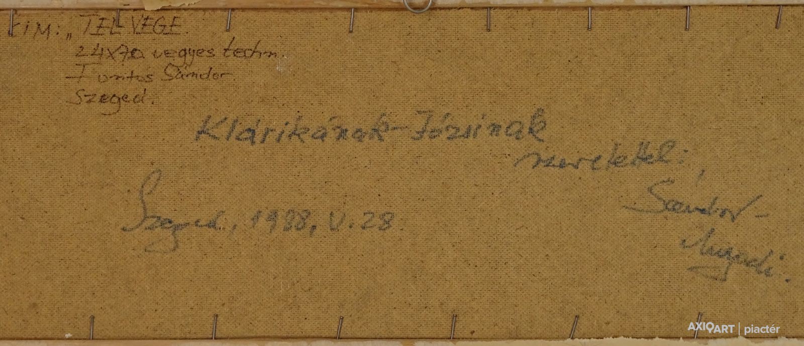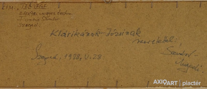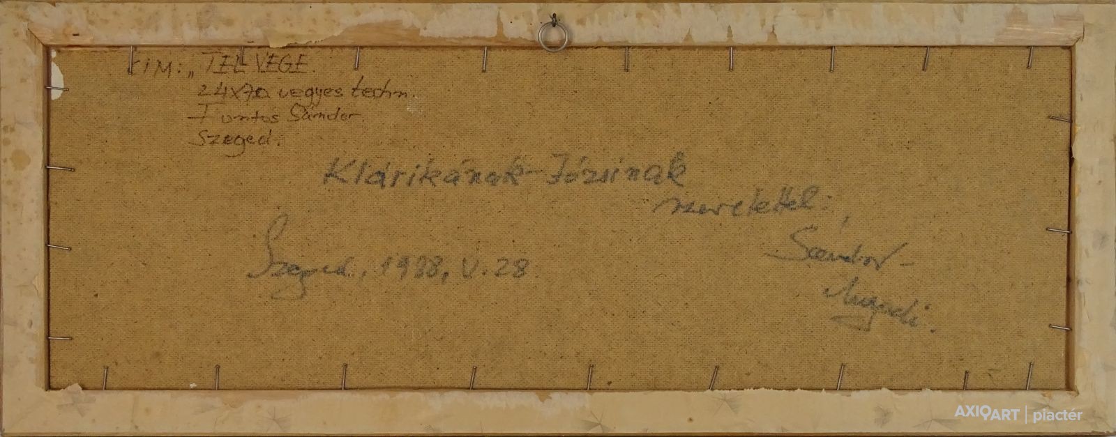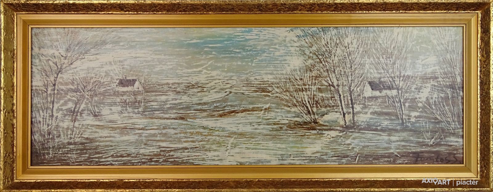 [0M333/053] Olaj, vegyes technika farost festmény, szép állapotú aranyozott keretben. Jelezve jobbra lent: FONTOS S. Hátoldalán felirat: CÍM: "TÉL VÉGE" 24 X 70 CM VEGYES TECHN. FONTOS SÁNDOR SZEGED Alatta datált ajándékozási feljegyzés, lásd fotó. Magasság: 30 cm Szélesség: 76 cm Súly: 1.515 kg Fontos Sándor festő Születési hely: Szeged Születési dátum: 1920 Kiállítások az adatbázisban: Mesterei: Vinkler László. 1951-55 szegedi Juhász Gyula Tanárképző Főiskola, mestere: Vinkler László. 1976: Csongrád megyei Tanács alkotói díja, Szeged. 1980: Munka Érdemrend arany fokozata. Szegeden élt. A 70-es évekig leginkább szerkezetes elvű, dekoratív hangvételű tájképeket készített. Majd felszámolja a reális földi látszatokat, s helyettük kozmikus képzetű, expresszív látomásokat hoz létre. Pályája utolsó éveiben mozgalmas, jelképes és ironikus felfogású figurális kompozíciókat alkotott. Egyéni kiállítások 1965 • Móra Ferenc Múzeum Képtára, Szeged 1978 • Kecskeméti Képtár 1984 • Vármúzeum, Esztergom 1990 • Móra Ferenc Múzeum Képtára, Szeged. Válogatott csoportos kiállítások 1967 • Szegedi képzőművészek tárlata, Magyar Nemzeti Galéria, Budapest 1986 • Szeged képzőművészete, Móra Ferenc Múzeum Képtára, Szeged. Művek közgyűjteményekben Móra Ferenc Múzeum, Szeged. Irodalom SZELESI Z.: Alföldi művészek között. ~, Tiszatáj, 1965/1. Szuromi Pál Forrás: Artportal.hu