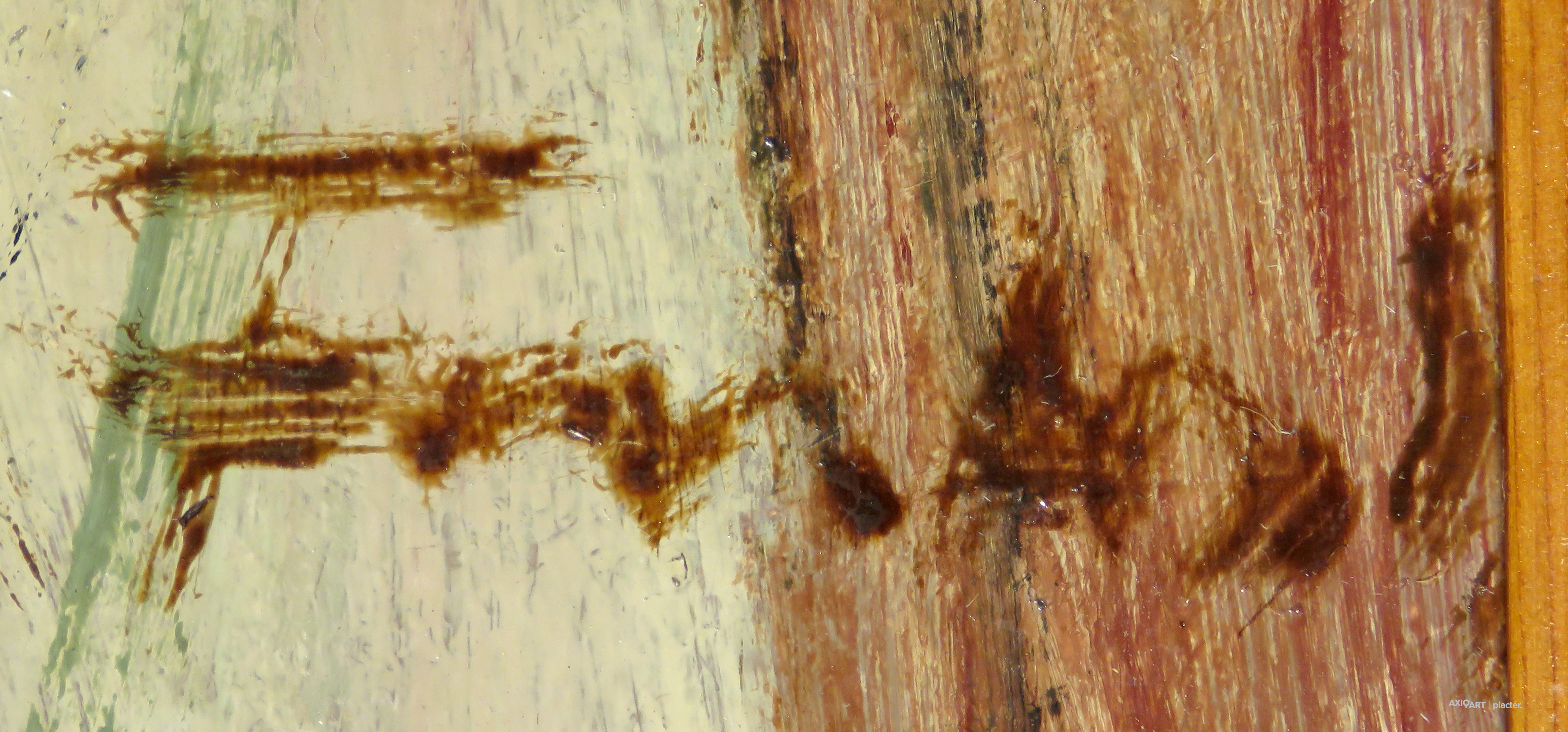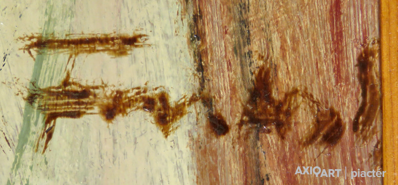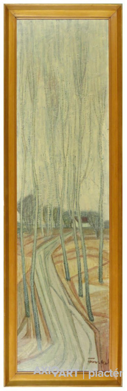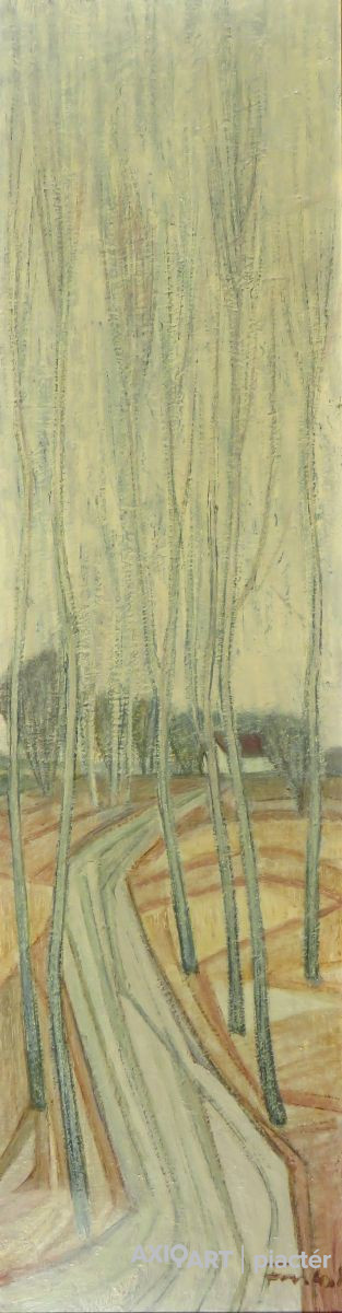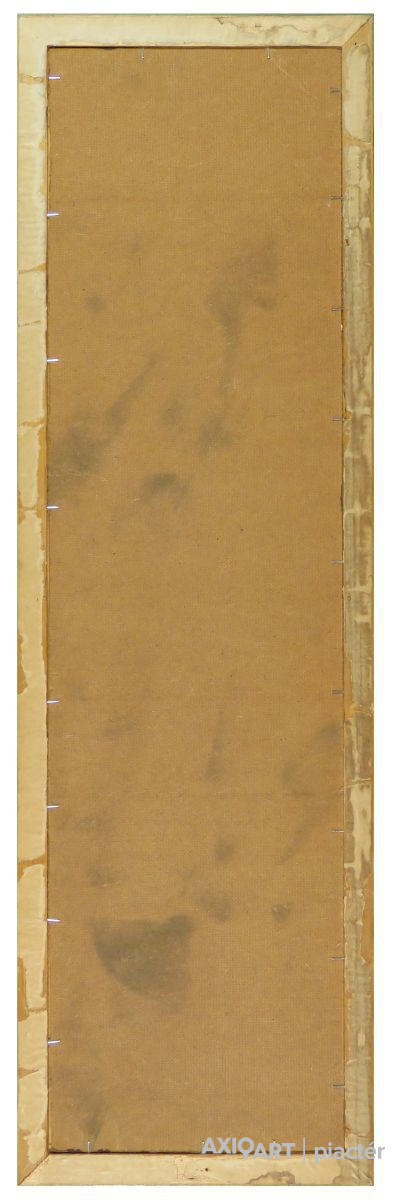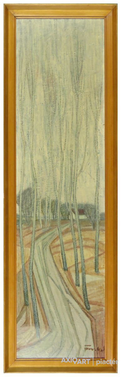 [FKB624/Bp100/20] A kép mérete: 100 x 27 cm keret nélkül. Készült: Olaj, tempera, Farostlemez A kép Fontos Sándor (Szeged, 1920, Szeged, 1991) alkotása. Jelezve jobbra lent "Fontos S." A festmény jó állapotban van. Keret: Ép Magyar festők és grafikusok életrajzi lexikona I-II. Festő. Tanulmányait 1951-55 között a szegedi Tanárképző Főiskolán végezte Vinkler László növendékeként. Előbb Üllésen, majd 1969-től Szegeden dolgozott, mint rajzpedagógus. 1952-től állított ki. Kiállításai voltak a szegedi Gulácsy Teremben, a hódmezővásárhelyi Tornyai Múzeumban, a szegedi Móra Ferenc Múzeumban, a fővárosi Mednyánszky Teremben és a Magyar Nemzeti Galériában. 1975-1982 között rendszeresen részt vett a Szegedi Nyári Tárlatokon, 1975-87 között a Vásárhelyi Ősz Tárlatokon. Festészetében egy időben a konstruktivitás volt jellemző, majd egyféle lírai-konstruktív stílus jellemzi. Pályája utolsó éveiben mozgalmas, jelképes és ironikus felfogású figurális kompozíciókat alkotott. Az alföldi homoktájak sajátosságát, szépségét egyéni módon vitte vászonra. Díjak: a Csongrád megyei Tanács alkotói díja; a Munka Érdemrend arany fokozata. A szegedi Móra Ferenc Múzeum őrzi alkotásait. (Szuromi Pál adatközlése nyomán, MÉ) Magyar festők és grafikusok életrajzi lexikona I-II. Műgyűjtők és kereskedők kézikönyve Festő. Tanulmányait a szegedi Tanárképző Főiskolán végezte Vinkler László tanítványaként. Eleinte Üllésen, majd 1969-től Szegeden dolgozott mint rajzpedagógus. 1952 óta kiállító művész. Kiállításai voltak a Szegedi Gulácsy Teremben, a hódmezővásárhelyi Tornyai Múzeumban, a szegedi Móra Ferenc Múzeumban, fővárosi a Mednyánszky Teremben, a MNG-ban. Festészetében egy időben a konstruktivitás volt jellemző, később egyféle lírai-konstruktív stílus jellemzi. A Szegedi Nyári Tárlatok többszörös kitüntetettje. Az alföldi homoktájak sajátosságát, szépségeit, szépségét egyéni módon viszi vászonra. (MÉ) Magyar festők és grafikusok adattára Tanulmányait a Szegedi Tanárképző Főiskolán 1955-ben végezte Vinkler László növendékeként. Rajztanári oklevelet szerzett. Évekig pedagógus Üllésen, majd 1969 óta Szegeden él. 1952-től kiállító művész, 1960-ban, 1965-ben és 1974-ben a szegedi Gulácsy-bemutatóteremben, 1962-ben a hódmezővásárhelyi Tornyai Múzeumban, 1963-ban a szegedi Móra Ferenc Múzeumban, 1976-ban a Mednyánszky Teremben mutatkozott be önállóan. 1967-ben nagyobb anyaggal szerepelt a szegedi képzőművészet kiállításán a Magyar Nemzeti Galériában. A csoportos tárlatok rendszeres kiállító művésze. A Szegedi Nyári Tárlatok többszörös kitüntetettje. Gyűjteményes kiállítását 1980-ban Békéscsabán, a Munkácsy Mihály Múzeumban nagyobb anyaggal szerepelt. 1987-ben Budapesten a Mednyánszky Teremben nyílt kiállítása. Festészetében egy időben a konstrukitvitás volt jellemző, később azonban egyféle lírai-konstruktív stílus jellemzi. Stílusának föltűnő jegye, hogy mély színezésű képeit átszövik a kompozíciót kialakító vonalak, amelyek mintegy érhálózatát adják a műnek. Az alföldi homoktájak sajátosságát, szépségét egyéni módon viszi vászonra. - Irod.: P. Sz. T.: Művész életrajzok, Bp. 1985. - ÖLK Művész életrajzok kortárs magyar képzőművészek Festő. A szegedi Tanárképző Főiskolán szerzett 1955-ben rajztanári diplomát Vinkler László növendékeként. Évekig művész-pedagógus az üllési tanyavilágban, 1969 óta Szegeden él. 1952 óta kiállító művész; 1960-ban, 1965-ben és 1974-ben a Képcsarnok szegedi bemutatótermében, 1962-ben a vásárhelyi Tornyai Múzeumban, 1963-ban és 1980-ban a szegedi Móra Ferenc Múzeum képtárában, 1976-ban a Mednyánszky Teremben, 1978-ban Kecskeméten, 1979-ben Csongrádon, 1981-ben Siófokon és Szolnokon, 1983-ban Esztergomban és Békéscsabán mutatkozott be önálló kollekciókkal. Egyes művei eljutottak Jugoszláviába, a Szovjetunióba, az NDK-ba és Finnországba. A csongrád megyei Tanács művészeti díjának (1976) kitüntetettje, a Szegedi Nyári Tárlat többszörös díjnyertese. - Hol expresszív erejű, hol költői hangulatú piktúrájának központi témája a szegedi tanyavilág, az itt élő emberek. Stílusának jellegzetessége, hogy mélyszínezésű képeit átszövik a kompozíciót kialakító vonalak, amelyek mintegy érhálózatát adják a műnek, lüktető mozgást víve az ábrázolásokba. Újabban az absztrakció felé tájékozódik. Kortárs magyar művészeti lexikon I-III. Festő. 1951-55 szegedi Juhász Gy. TF, mestere: Vinkler László. 1976: Csongrád megyei Tanács alkotói díja, Szeged. 1980: Munka Érdemrend arany fokozata. Szegeden élt. A 70-es évekig leginkább szerkezetes elvű, dekoratív hangvételű tájképeket készített. Majd felszámolja a reális földi látszatokat, s helyettük kozmikus képzetű, expresszív látomásokat hoz létre. Pályája utolsó éveiben mozgalmas, jelképes és ironikus felfogású figurális kompozíciókat alkotott. Ek: 1963: Tornyai J.M., Hmvhely; 1965: Móra F. M. Képtára, Szeged; 1976: Mednyánszky T.; 1978: Kecskeméti Képtár; 1980: Móra F. M.; Képtára, Szeged; 1984: Várm., Esztergom; 1990: Móra F. M. Képtára, Szeged. Vcsk: 1967: Szegedi képzőművészek tárlata, MNG; 1975-82: Szegedi Tárlat, Móra M. Képtára, Szeged; 1975-87: Vásárhelyi Őszi Tárlat, Tornyai J. M., Hmvhely; 1986: Szeged képzőművészete, Móra F. M. Képtára, Szeged. Mk: Móra F. M., Szeged. Irod.: Szelesi Z.: Alföldi művészek között. Fontos Sándor, Tiszatáj, 1965/1.; Tasnádi A.: Fontos Sándornál, Tiszatáj, 1980/3. (Sz. P.)