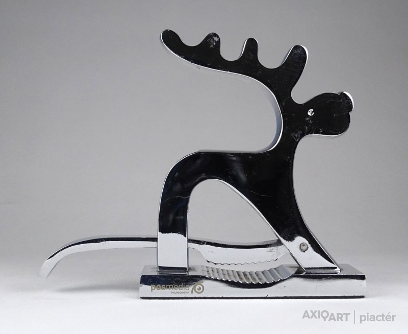 [1L318/X110] Formatervezett masszív krómozott fém diótörő, dió roppantó, minden nemű csonthéjashoz. A talp oldalán felirat: POSMEDIA HUNGARY Magasság: 16 cm Szélesség: 4.3 cm Hosszúság: 19 cm Súly: 0.76 kg