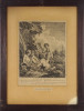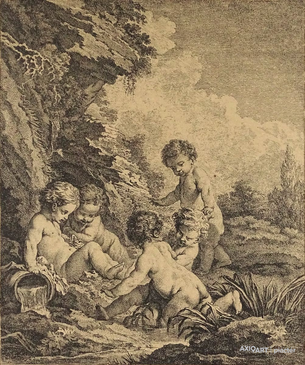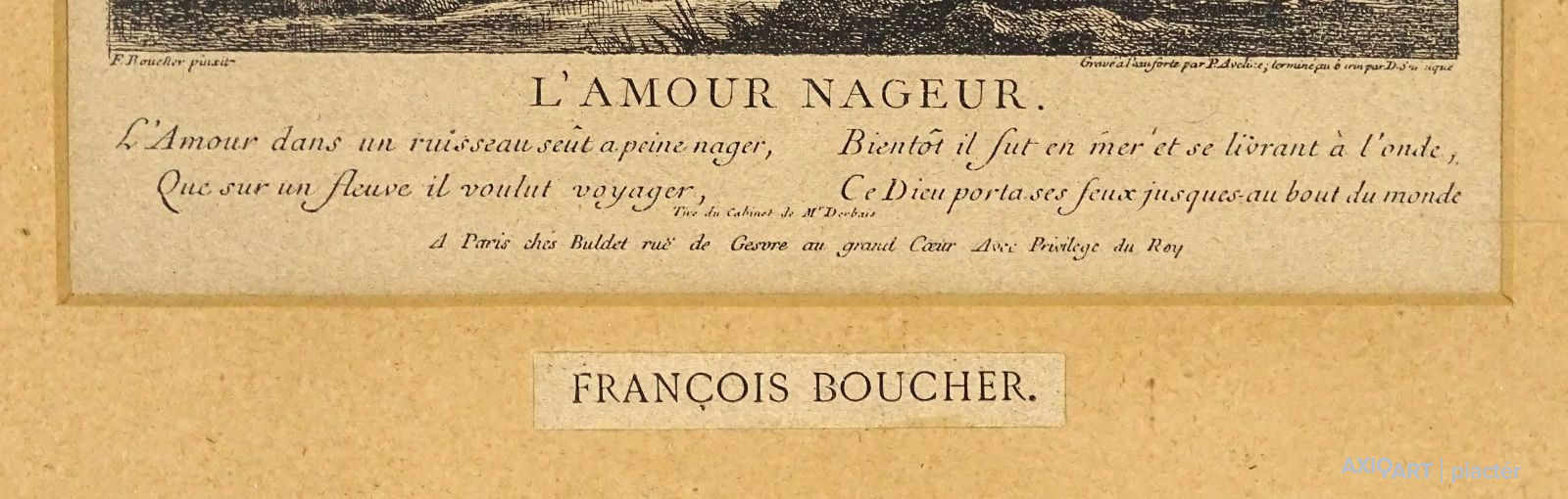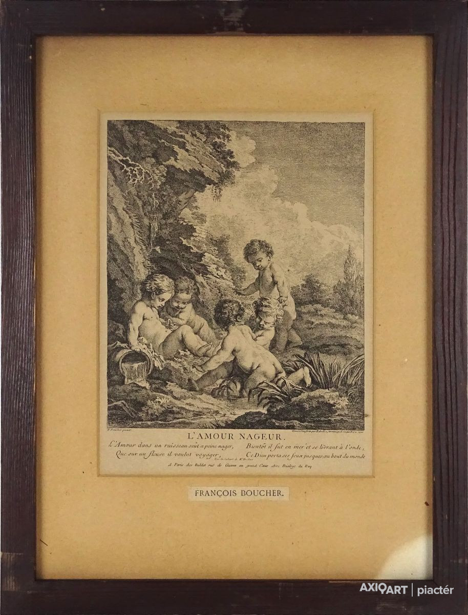 [1J360/094] Antik metszet. Üveglap mögött, paszpartuban, régi keretben szép állapotban megőrzött darab. Akasztási lehetőséggel rendelkezik. Feliratok: F. BOUCHER PINXIT GRAVÉ AL'ANI FORTE PAR P.AVELINE TERMINÉ AU O IRINPAR D. S...IQUE L'AMOUR NAGEUR FRANCOIS BOUCHER Magasság: 37 cm Szélesség: 28 cm Súly: 0.635 kg François Boucher    Ugrás a navigációhozUgrás a kereséshez François Boucher Boucher Gustaf Lundberg festményén Született 1703. szeptember 29. Párizs Meghalt 1770. május 30. Párizs (66 évesen) Nemzetisége francia Stílusa rokokó Mestere(i) François Lemoyne Aki hatott rá Tiziano Tintoretto Veronese François Boucher aláírása A Wikimédia Commons tartalmaz François Boucher témájú médiaállományokat. François Boucher (Párizs, 1703. szeptember 29. – Párizs, 1770. május 30.) francia festő, a rokokó stílus kiemelkedő képviselője.    Élete  Apja, Nicolas Boucher szintén festő volt. Tanulmányait 1720-ban kezdte meg François Lemoyne-nál, a kor neves rokokó festőjénél, majd mindössze három hónap múlva Jean Cars-nál folytatta. Nagy hatással volt rá Tiziano, Veronese és Tintoretto munkássága. 1723-ban elnyerte a királyi festészeti és szobrászati akadémia első díját, a Római Nagydíjat. Ez az 1663-ban XIV. Lajos által alapított díj, amelyet egy versenyen lehetett elnyerni, királyi ösztöndíjjal és négyéves római tanulmányi lehetőséggel járt. Azok a művészek azonban, akik nem arattak győzelmet a pályázaton, semmiféle térítésben nem részesültek munkájukért. Boucher csak négy évvel a díj elnyerése után kezdte meg római útját. 1724 és 1726 között Watteau festményeiről 120 darab metszetett készített el, így tanulmányozva példaképe technikáját.[1] Római útja alatt Giovanni Domenico Tiepolo, Luca Giordano, Sebastiano Ricci és Giovanni Benedetto Castiglione munkássága hatott rá. Rómából visszatérve, 1731-től felgyorsult karrierje. 1733-ban megnősült, felesége Marie Joanne Busseau ekkor csak 17 éves volt.[1] 1734-ben nagy feltűnést keltett Rinaldo és Amira című festményével, a kép XV. Lajos francia király tetszését is elnyerte, így tagja, később professzora, utóbb rektora lett a Királyi Festészeti és Szobrászati Akadémiának. 1755-ben elnyerte a királyi gobelin-manufaktúra vezetőjének állásást, végül 1765-ben a „Premier Peintre du Roi” (A király első festője) címet. Műveivel nagy társasági sikereket is aratott. Madame de Pompadour, XV. Lajos francia király szeretője, kor befolyásos alakja megkedveli képeit, és így Boucher rendkívül divatos festővé vált. Igen könnyen és gyorsan dolgozott; szívesen dicsekedett azzal, hogy évente 50.000 frankot is megkeres. 1742-ben az opera számára készített díszlet- és jelmezterveket. 1748-tól a Saint Laurent Színháznak dolgozott. Az 1750-es évektől főleg bibliai témájú képeket rendeltek tőle. 1770-ben műtermében, munka közben halt meg.[2] Halála után neve hamar feledésbe merült, munkássága azonban igen jelentős volt, a rokokónak újszerű tartalmat adott.  Művészete Korai munkái – Watteau és Rubens nyomán idillikus tájképek és mitológiai témájú festmények voltak. Hamarosan azonban az erotika felé fordult és a hagyományos mitológiai képekből egyre inkább szenvedélyes szerelmi jelenetek lettek. Mestere volt az életképek műfajának is, mint azt az 1739-es Reggeli című festménye is mutatja. Gyakran ábrázolta saját családját is ilyen képein, sőt gyakran „szabadosabb” festményein is, mint az Odaliszk-képek, felesége volt a modellje. Az Odaliszk sötét hajú változata arra indította Diderot-t, hogy kijelentse: Boucher prostituálja a feleségét. Gazdag gyűjtők azonban továbbra is nagyra értékelték Boucher ilyen irányú munkásságát is. Egyik leghíresebb képe ebből a műfajból a 15 éves kurtizán, Marie-Louise O’Murphy ábrázolása. A festészet mellett színházi kosztümöket és díszleteket is tervezett. Favart (1710-1792) vígoperáinak intrikus világa közel állt festészetéhez is. Tapétatervezőként is hozzájárult az opera és a versailles-i, fontainebleau-i és choisy-i királyi kastélyok berendezéséhez. Távoli rokona, Jacques-Louis David neoklasszicista festő Boucher támogatásával indult el művészi pályáján. Boucher híres mondása volt, hogy a természet „túlságosan zöld és rosszul van megvilágítva” ahhoz, hogy festői téma lehessen. Ennek ellenére sok szép tájkép került ki a keze alól. François Boucher neve, patrónusáéval, Madame Pompadourral együtt, azonosult a 18. századi francia rokokó fogalmával.  Forrás: wikipédia