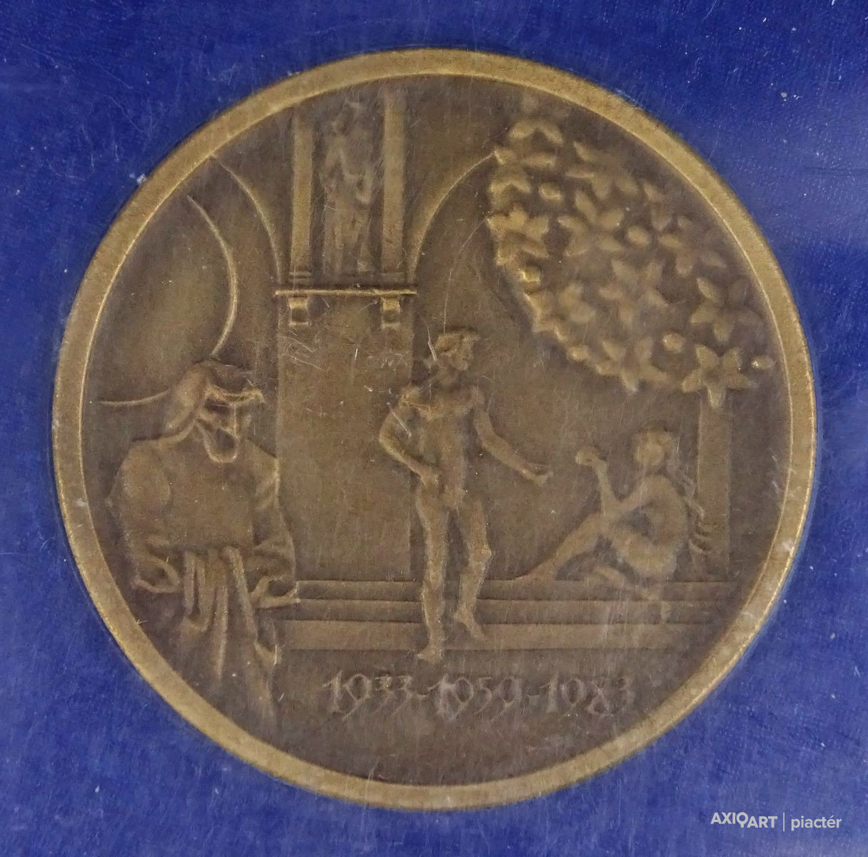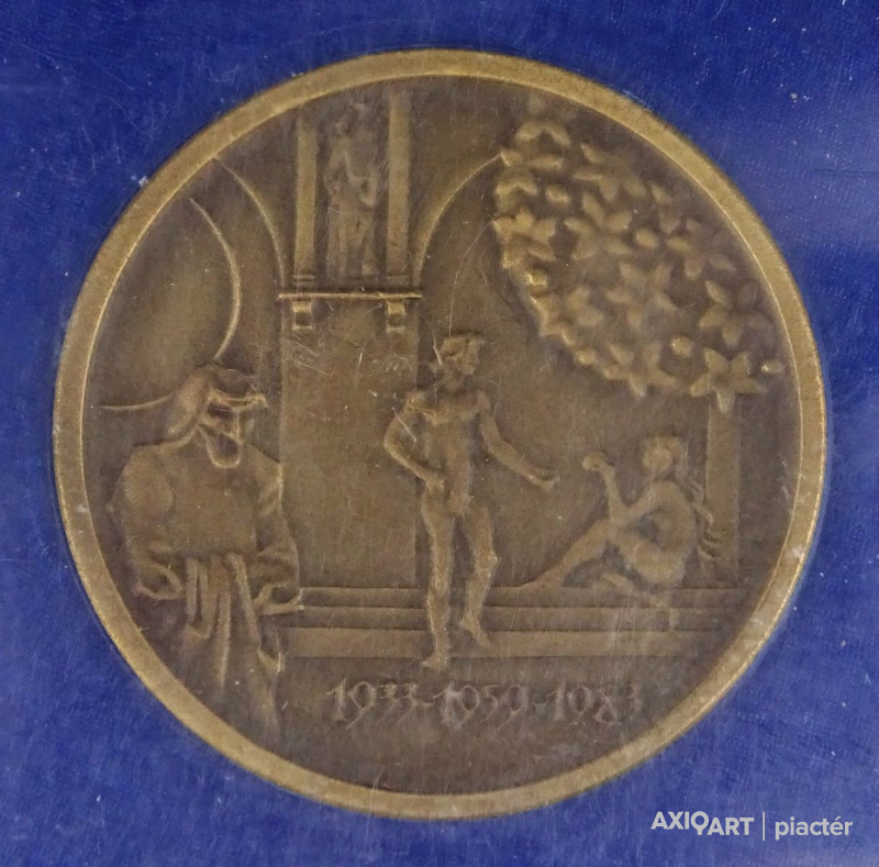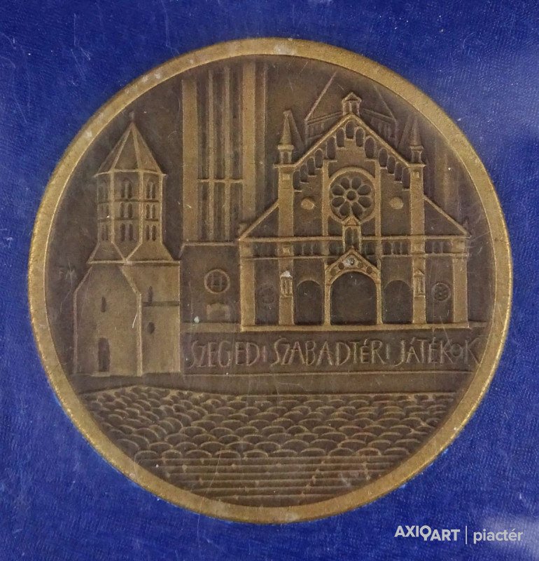 [1L411/FSZ] Kemény, plombált gyűjtői műanyag tokban található bronz érem, plakett. Az egyik oldalon felirat SZEGEDI SZABADTÉRI JÁTÉKOK Jelzés: FM (FRITZ MIHÁLY) Másik Oldalon felirat: 1933-1959-1983 Súly: 0.05 kg Fritz Mihály éremművész, szobrász Marosvásárhely [Târgu-Mureş, RO], 1947-02-18 Szerző: Gyulai Gergely + kieg. Tóth Attila 1965-69: Magyar Képzőművészeti Főiskola, mestere: Pátzay Pál. 1970 óta szerepel a művészeti életben. Szobrászatot tanított a szegedi Tömörkény Művészeti Szakközépiskolában. A Szög-Art művészcsoport tagja. A 70-es évektől több hazai és külföldi kőszobrász-, és érem-szimpóziumon vett részt. Művészetében a magyar szobrászat realista hagyományait követi. Jelentős portréista. Jó karakterizáló képességgel, gondosan mintázza meg modelljeinek arcvonásait. Nagy figyelmet fordít a pszichológiai jellemzésre. Igen jelentékeny éremművészi munkássága, amely több mint 800 művet foglal magába. Érmeit düreri pontosságú, rajzosan szikár plasztikai stílus, klasszikus mértékrend jellemzi. Szobrainak kedvelt anyaga a kő, fa, bronz.   Díjak/ösztöndíjak 1981 • Szegedi Nyári Tárlat díja  1988 • A Világ legszebb vert érme díj („Coin Of The Year – Best Crown”) 2009 • Közönségdíj („People’s Choice”) 1993 • a IX. Országos Éremművészeti Biennálé díja 1997 • a XI.Országos Éremművészeti Biennálé díja  1998 • Szegedért emlékérem 1999 • Pro Numizmatica 2010 • Ligeti Erika-díj. Irodalom: TANDI L.-TÓTH A.: Szegedi szobrászok. Szeged, 1996 WEHNER T.: Fritz Mihály, 249 Magyar Szobrász. Magyar Képzőművészek és Iparművészek Szövetsége Szobrász Szakosztály kiadványa, 2007 WEHNER T.: Modern magyar szobrászat 1945-2010. Budapest, Corvina, 2010. Egyéni kiállítások Egyéni kiállítások 1976 • Juhász Gyula Művelődési Központ, Szeged • Medgyessy Terem, Hódmezővásárhely 1979 • VMK, Nyíregyháza 1980 • Művelődési Ház, Szentes 1982 • Sz. K. J. Múzeum, Orosháza 1987 • (Zoltánfy Istvánnal) Turku 1997 • Móra Ferenc Múzeum (Kalmár Mártonnal), Szeged, Újvidék 1998 • Wile Gallery, Columbus, OH 2000 • Orvostörténeti Múzeum, Buda 2003 • Jelen Ház, Arad 2005 • Mednyánszky terem  (Pataki Ferenccel), Budapest 2007 • Vármúzeum (Kalmár Mártonnal), Szeged. Válogatott csoportos kiállítások Válogatott csoportos kiállítások: 1970-től • több Szegedi Nyári Tárlat, több Vásárhelyi Őszi Tárlat 1976–1977 • Stúdió Kiállítások, Budapest, Párizs, Le Havre, Kairó 1978 • Magyar Szobrászati Kiállítás, Műcsarnok, Budapest 1981 • Magyar Képzőművészek és Iparművészek Szövetsége Kiállítása, Budai Vár, Budapest 1982 • Országos Képzőművészeti Kiállítás, Műcsarnok, Budapest 1983, ’87 • FIDEM, Firenze, Colorado Springs (USA) 1993-tól • Soproni Érembiennálék, Sopron 1992-től • SZÖG-ART kiállítások (Temesvár, Heilbronn, Párizs, Róma, Komarno, Szentendre, Budapest, Szeged stb.).   Művésztelepek: 1976 • Kőszobrász Művésztelep, Villány 1977, 1991 •  Éremművészeti Művésztelep, Nyíregyháza 1979 • Kőszobrász Művésztelep, Hoyerswerda. Művek közgyűjteményekben Művek közgyűjteményekben • Móra Ferenc Múzeum, Szeged • Orvostörténeti Múzeum, Budapest • Vízügyi Múzeum, Budapest • Városi Múzeum, Wrocław (PL). Forrás: artportal.hu