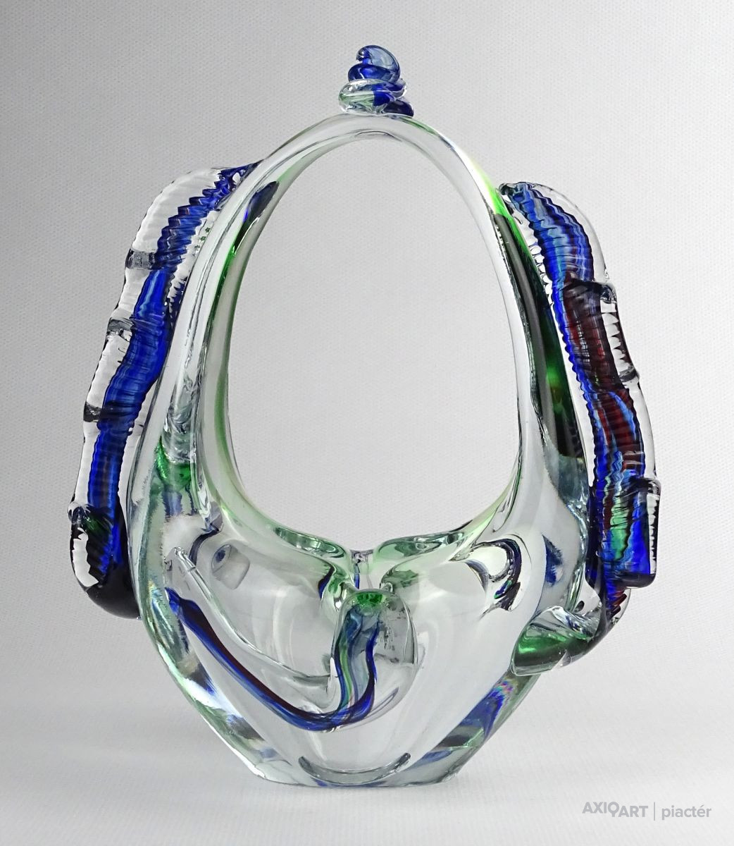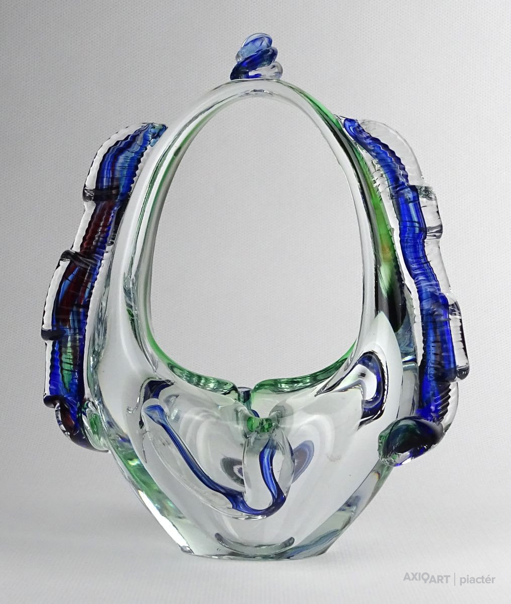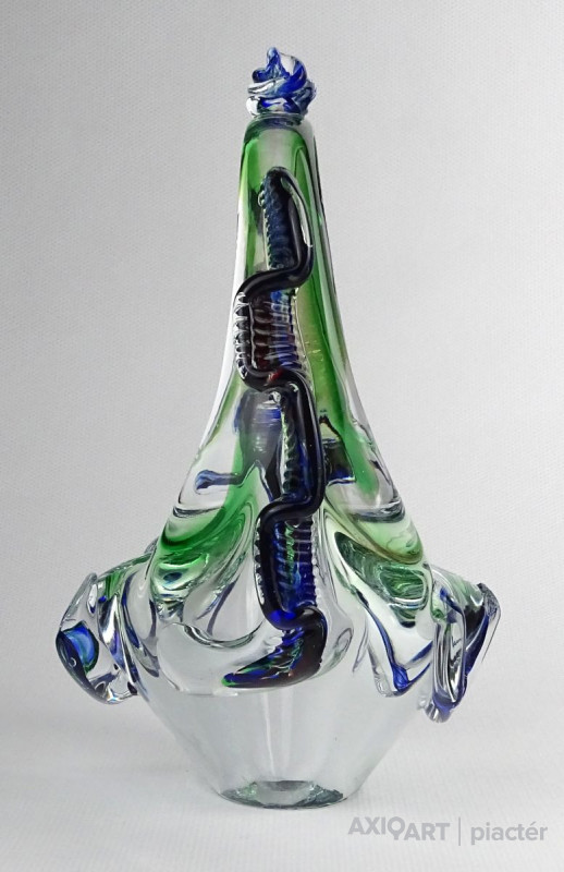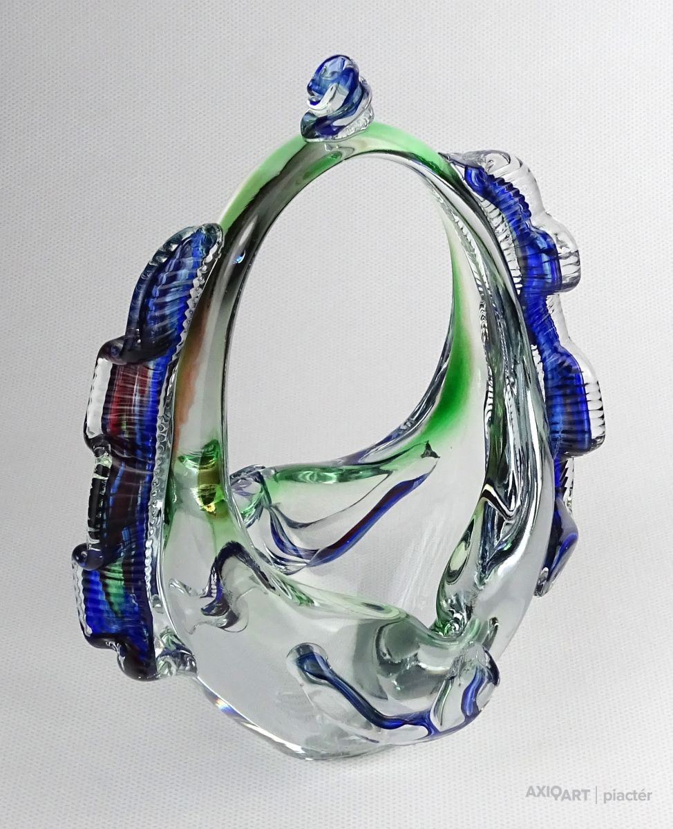 Hibátlan állapotú, színezett művészi üveg kosár dísztárgy, cseh fújt üveg a XX. század második feléből.