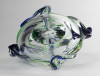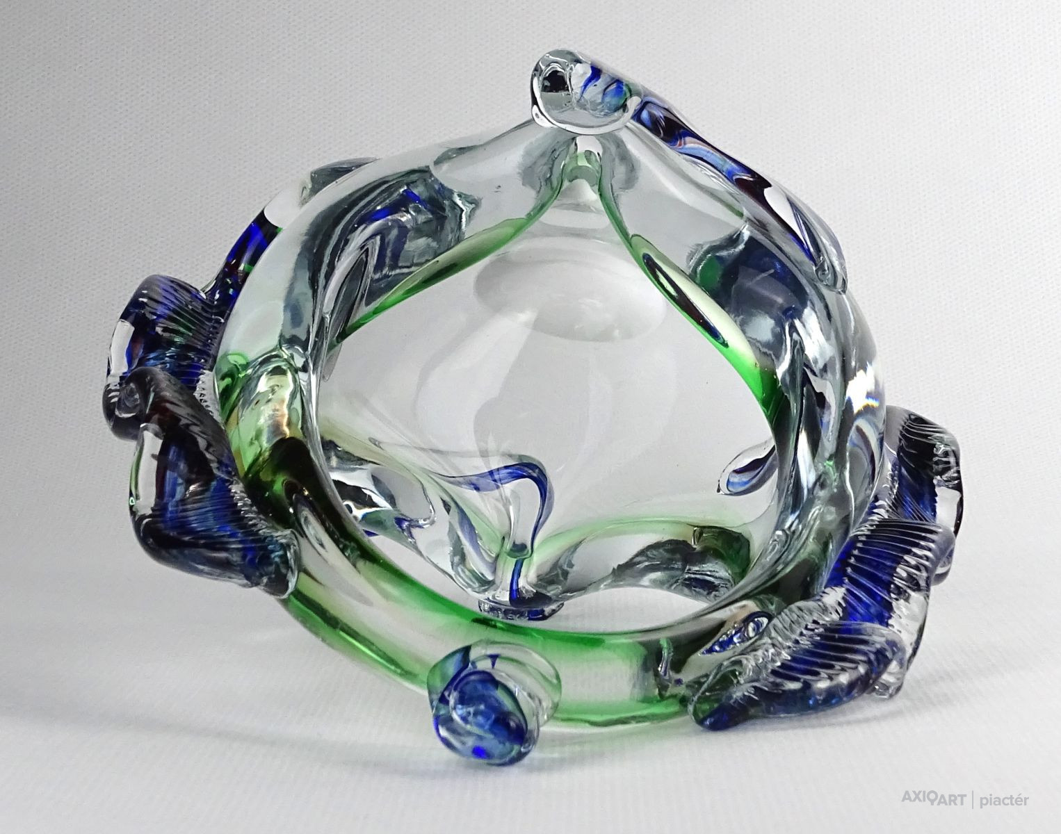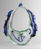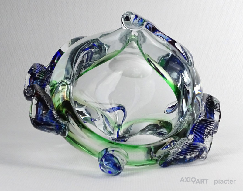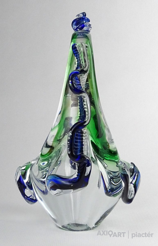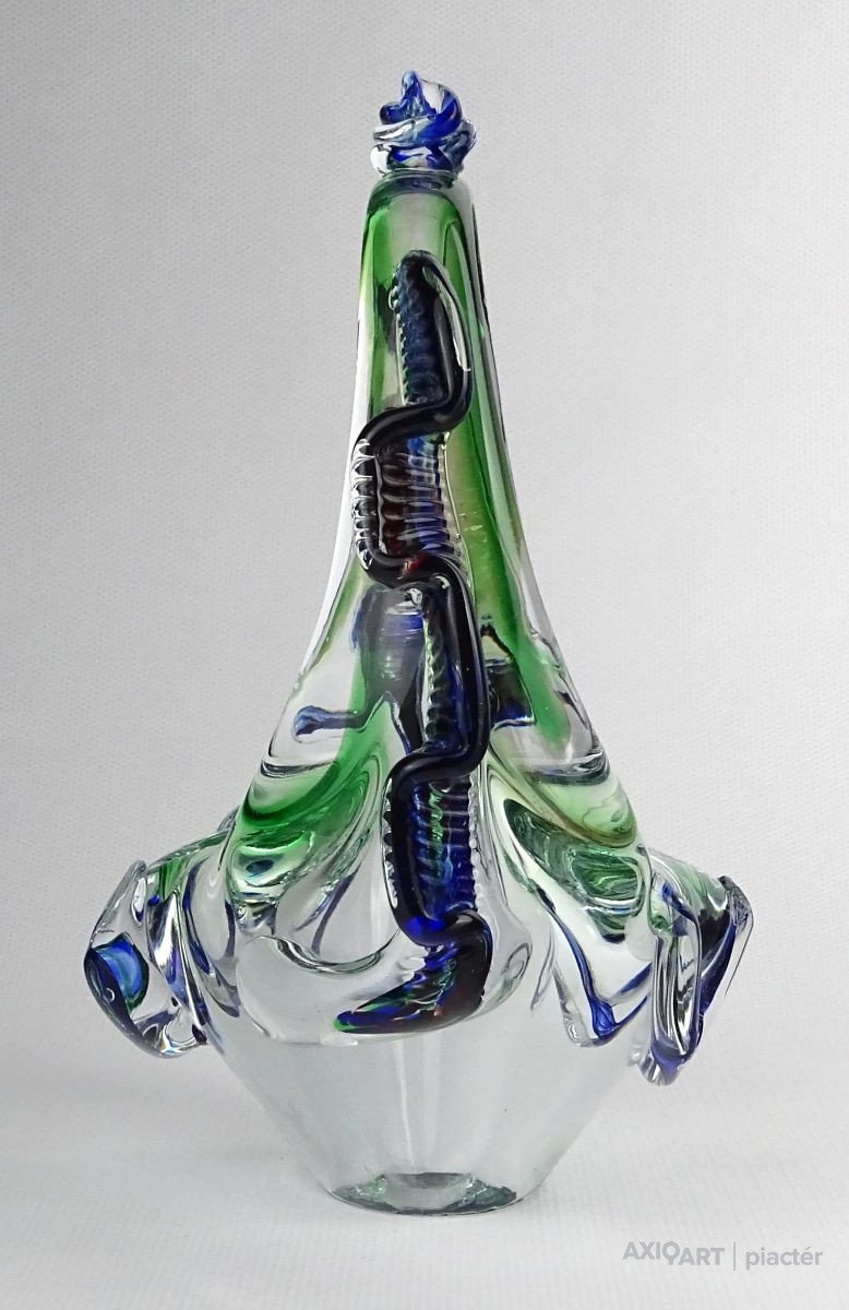 Hibátlan állapotú, színezett művészi üveg kosár dísztárgy, cseh fújt üveg a XX. század második feléből.