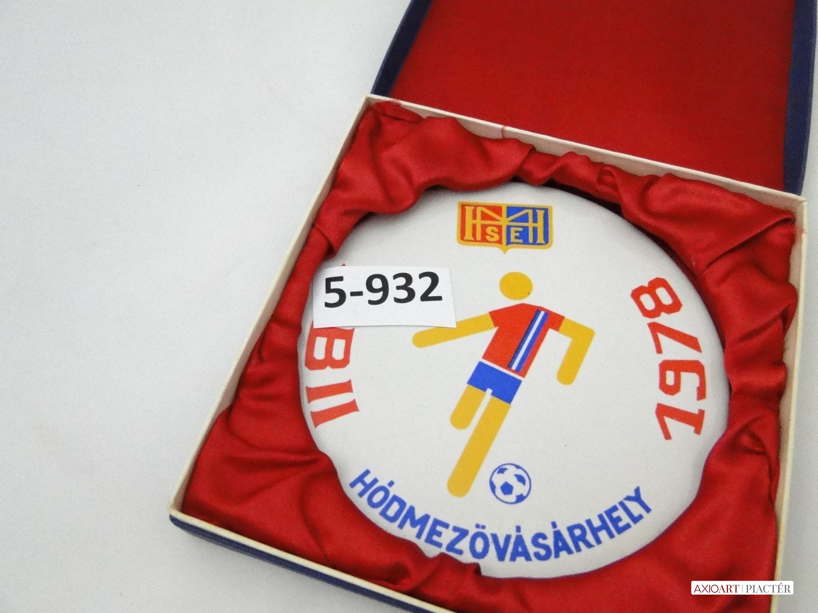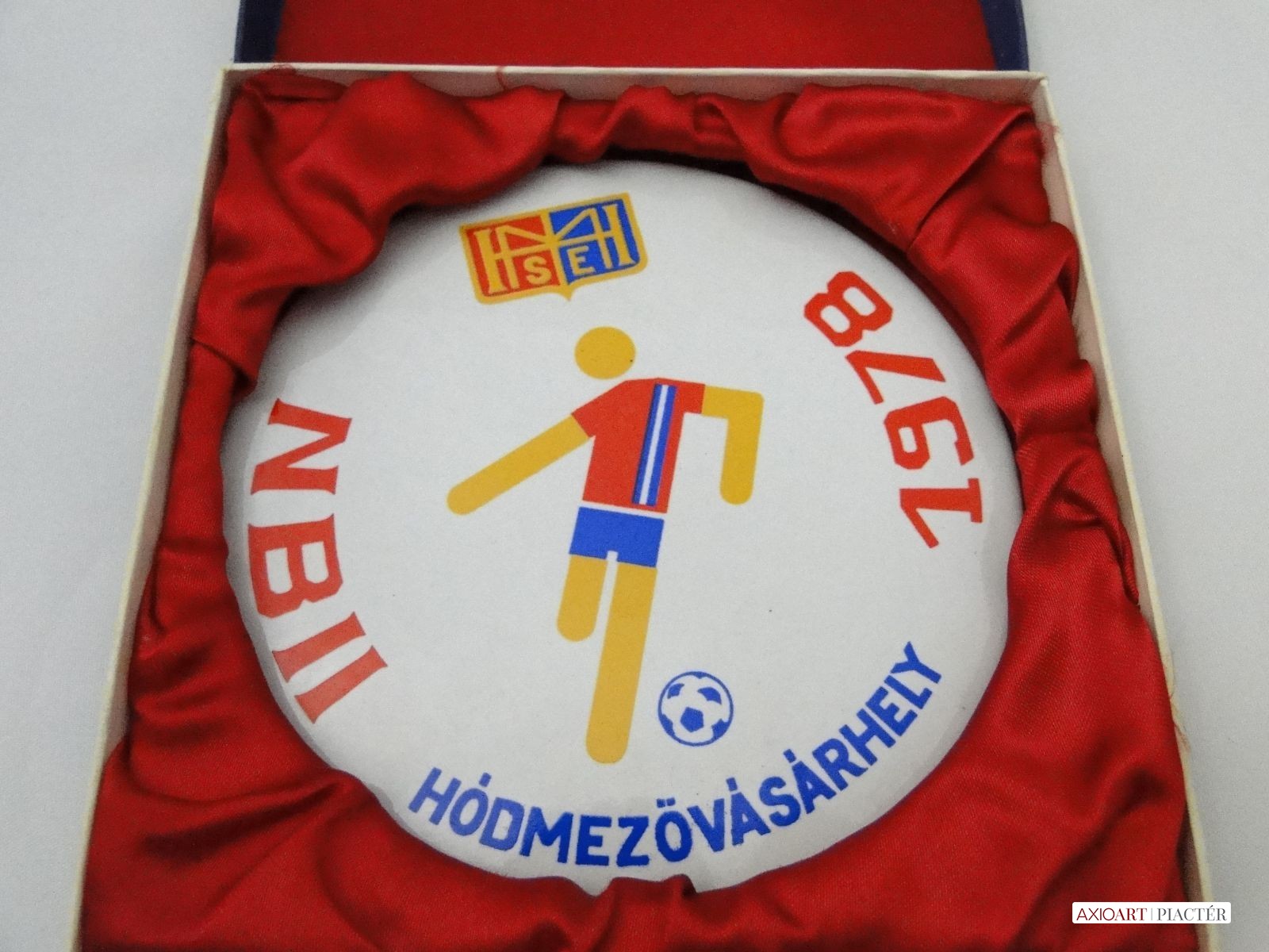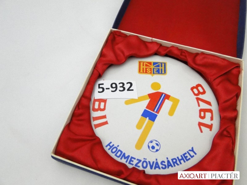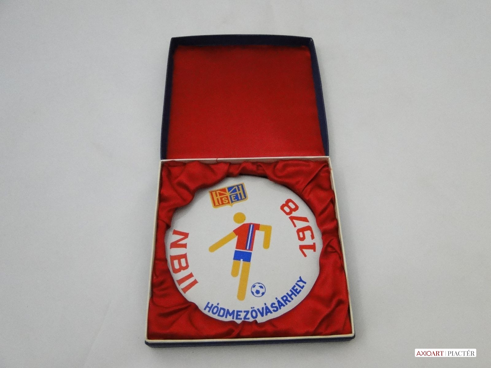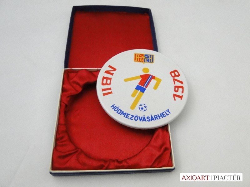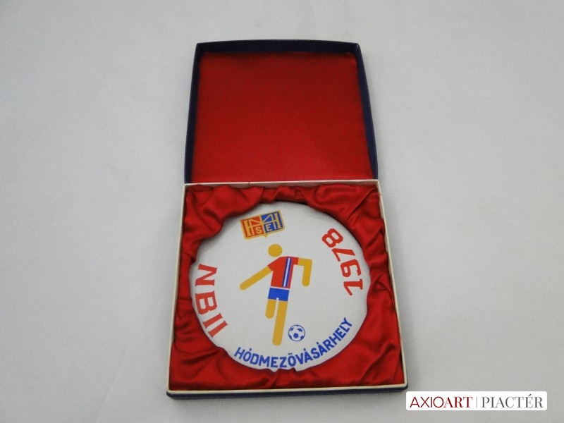 [5932/X074] Régi hibátlan állapotú porcelán sport plakett, sport díj, kitüntetés vörös selyemmel bélelt díszdobozban. Plaketten felirat HÓDMEZŐVÁSÁRHELY HMSE NBII 1978 Súly: 0.301 kg A díszdoboz mérete:  15 x 15 x 3 cm Plakett átmérője : 13 cm