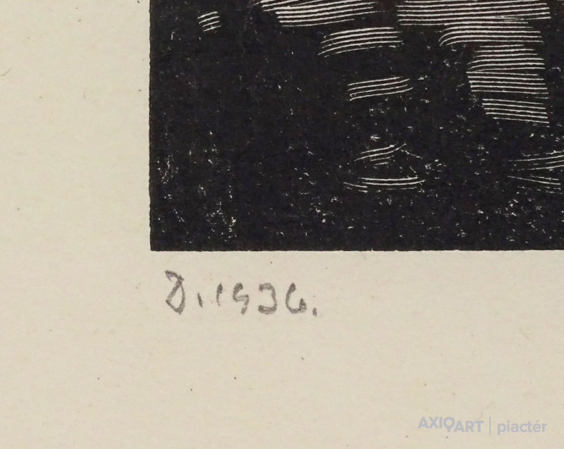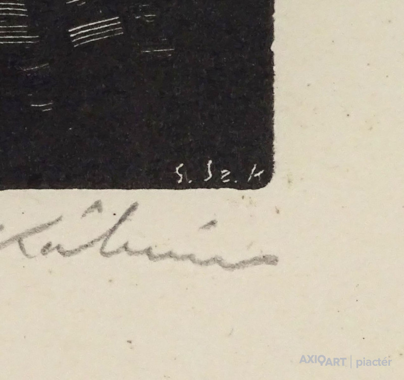 [1J353/080] Sorszámozott papír fametszet üveglap mögött, ezüst színű keretben. Jelezve jobbra lent: GÁBORJÁNI SZABÓ KÁLMÁN Sorszámozás: 2 88 Balra lent ceruzával: 8. 1936 Metszeten belül, jobbra fent: G.SZ.K. Magasság: 24.5 cm Szélesség: 18.5 cm Súly: 0.365 kg Gáborjáni Szabó Kálmán festő, grafikus Debrecen, 1897-09-18 Elhalálozott: Budapest, 1955. június 17. A Magyar Képzőművészeti Főiskolát 1922-ben fejezte be Révész Imre és Vaszary János tanítványaként, akinek tanársegédje is volt a főiskolán. 1922: a Szinyei Társaság ösztöndíja; 1930-1931, 1938-1939: a római Magyar Akadémia ösztöndíja. Tagja volt az Új Művészek Egyesületének, a Magyar Rézkarcoló Művészek Egyesületének. 1922-ben szülővárosában rajztanári állást kapott a Református Kollégium Tanítóképző Intézetében. 1944-1945-ben megbízott igazgatóként irányította a kollégiumot. Ezután rövid ideig a Kultuszminisztériumban dolgozott, majd a Magyar Képzőművészeti Főiskola tanára lett. A 20-as évek elejétől kiállító művész. Az 1930-as évek végétől a szolnoki művésztelepen alkotott, amelynek törzstagja volt. Elsősorban grafikusként ismert, bár életművében jelentős helyet foglalnak el festményei. Készített illusztrációt, kisgrafikát és reklámgrafikát, de legjelentősebbek fametszetsorozatai. Egy rövid ideig a neoklasszicizmus hatása érződik munkáin. Későbbi metszetei drámai ellentétekre épülő, expresszív alkotások. A 30-as, 40-es években gyakran ábrázolta a paraszti életet. Irodalom TÓTH E.: ~ grafikái, Debrecen, 1963 EGRI M.: A szolnoki művésztelep, Budapest, 1977 Magyar művészet 1919-1945, Budapest, 1985. Egyéni kiállítások Egyéni kiállítások 1930 • Scherlhaus, Berlin 1967 • Bakonyi Múzeum, Veszprém. Válogatott csoportos kiállítások Válogatott csoportos kiállítások 1931 • A római Magyar Intézet ösztöndíjas művészeinek első kiállítása, Nemzeti Szalon, Budapest 1932 • XVIII. Velencei Biennálé, Velence • Nemzetközi egyházművészeti kiállítás, Padova 1935 • a Magyar Rézkarcoló Művészek Egyesülete kiállítása, Nemzeti Szalon, Budapest 1932 • Chicago 1934 • Hága • Amszterdam 1941 • 94. csoportkiállítás, Nemzeti Szalon, Budapest (nagyobb anyaggal) 1948 • a Rippl-Rónai Társaság kiállítása, Nemzeti Szalon, Budapest 1950 • 1. Magyar Képzőművészeti kiállítás, Műcsarnok, Budapest 1955 • Képzőművészetünk tíz éve, Műcsarnok, Budapest 1977, 1978 • A Szolnoki Művésztelep Jubiláris Kiállítása, Damjanich János Múzeum • Szolnoki Galéria, Szolnok • Magyar Nemzeti Galéria, Budapest 1983 • Római iskola I., Keresztény Múzeum, Esztergom. Művek közgyűjteményekben Művek közgyűjteményekben Tornyai János Múzeum, Hódmezővásárhely Janus Pannonius Múzeum Modern Magyar Képtár, Pécs  Forrás: artportal.hu