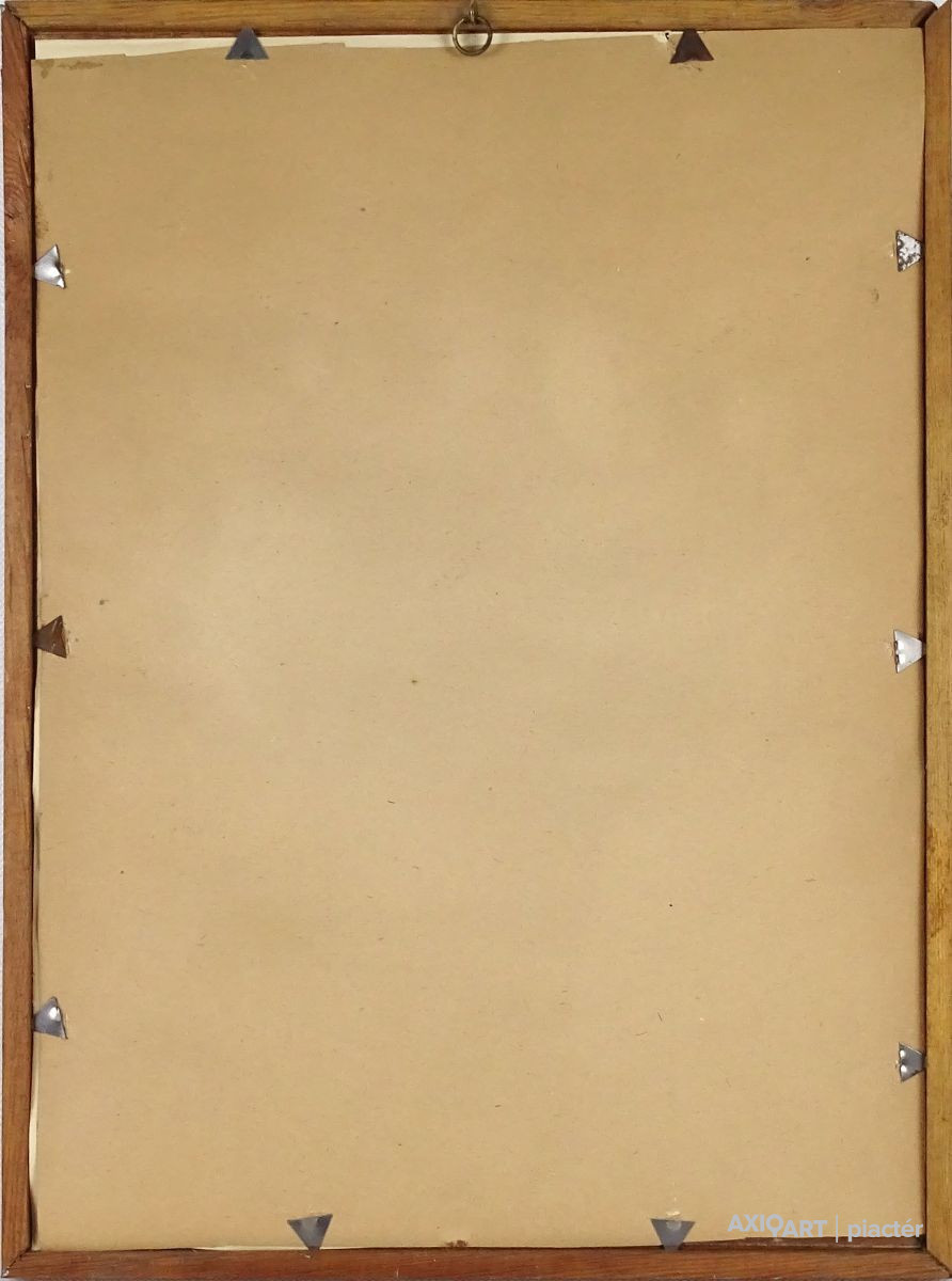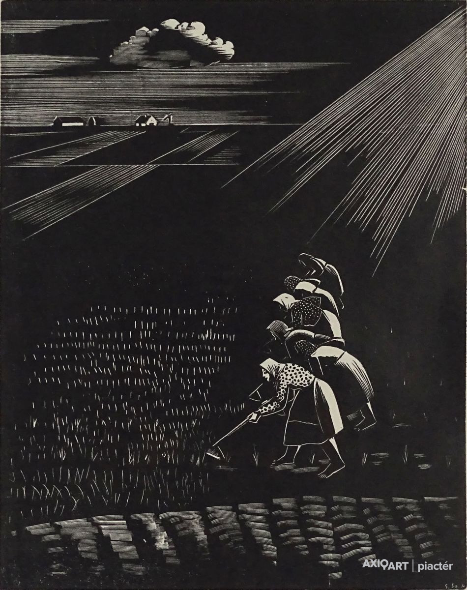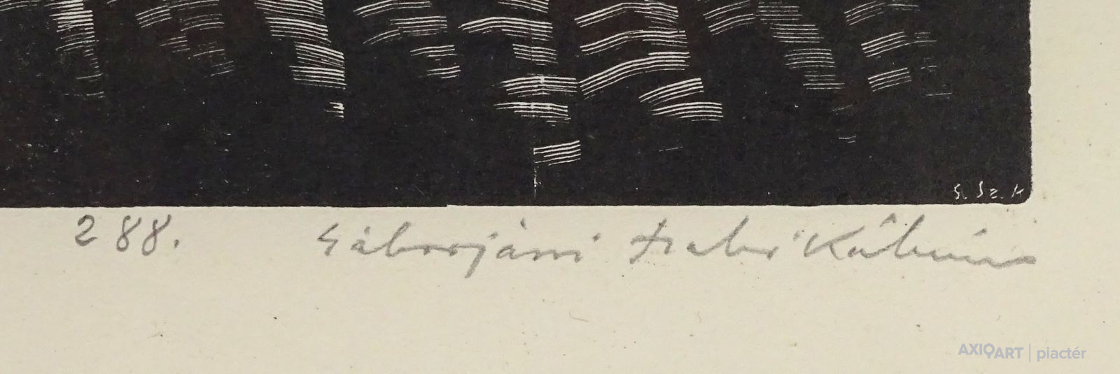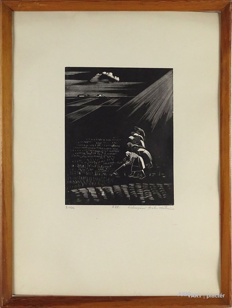 [1J357/109] Sorszámozott papír fametszet üveglap mögött, fenyőfa keretben. Akasztási lehetőséggel rendelkezik. Jelezve jobbra lent: GÁBORJÁNI SZABÓ KÁLMÁN Sorszámozás: 2 88 Balra lent ceruzával: 8. 1936 Metszeten belül: G.SZ.K. Magasság: 41 cm Szélesség: 31 cm Súly: 0.7 kg Gáborjáni Szabó Kálmán festő, grafikus Debrecen, 1897-09-18 Elhalálozott: Budapest, 1955. június 17. A Magyar Képzőművészeti Főiskolát 1922-ben fejezte be Révész Imre és Vaszary János tanítványaként, akinek tanársegédje is volt a főiskolán. 1922: a Szinyei Társaság ösztöndíja; 1930-1931, 1938-1939: a római Magyar Akadémia ösztöndíja. Tagja volt az Új Művészek Egyesületének, a Magyar Rézkarcoló Művészek Egyesületének. 1922-ben szülővárosában rajztanári állást kapott a Református Kollégium Tanítóképző Intézetében. 1944-1945-ben megbízott igazgatóként irányította a kollégiumot. Ezután rövid ideig a Kultuszminisztériumban dolgozott, majd a Magyar Képzőművészeti Főiskola tanára lett. A 20-as évek elejétől kiállító művész. Az 1930-as évek végétől a szolnoki művésztelepen alkotott, amelynek törzstagja volt. Elsősorban grafikusként ismert, bár életművében jelentős helyet foglalnak el festményei. Készített illusztrációt, kisgrafikát és reklámgrafikát, de legjelentősebbek fametszetsorozatai. Egy rövid ideig a neoklasszicizmus hatása érződik munkáin. Későbbi metszetei drámai ellentétekre épülő, expresszív alkotások. A 30-as, 40-es években gyakran ábrázolta a paraszti életet. Irodalom TÓTH E.: ~ grafikái, Debrecen, 1963 EGRI M.: A szolnoki művésztelep, Budapest, 1977 Magyar művészet 1919-1945, Budapest, 1985. Egyéni kiállítások Egyéni kiállítások 1930 • Scherlhaus, Berlin 1967 • Bakonyi Múzeum, Veszprém. Válogatott csoportos kiállítások Válogatott csoportos kiállítások 1931 • A római Magyar Intézet ösztöndíjas művészeinek első kiállítása, Nemzeti Szalon, Budapest 1932 • XVIII. Velencei Biennálé, Velence • Nemzetközi egyházművészeti kiállítás, Padova 1935 • a Magyar Rézkarcoló Művészek Egyesülete kiállítása, Nemzeti Szalon, Budapest 1932 • Chicago 1934 • Hága • Amszterdam 1941 • 94. csoportkiállítás, Nemzeti Szalon, Budapest (nagyobb anyaggal) 1948 • a Rippl-Rónai Társaság kiállítása, Nemzeti Szalon, Budapest 1950 • 1. Magyar Képzőművészeti kiállítás, Műcsarnok, Budapest 1955 • Képzőművészetünk tíz éve, Műcsarnok, Budapest 1977, 1978 • A Szolnoki Művésztelep Jubiláris Kiállítása, Damjanich János Múzeum • Szolnoki Galéria, Szolnok • Magyar Nemzeti Galéria, Budapest 1983 • Római iskola I., Keresztény Múzeum, Esztergom. Művek közgyűjteményekben Művek közgyűjteményekben Tornyai János Múzeum, Hódmezővásárhely Janus Pannonius Múzeum Modern Magyar Képtár, Pécs  Forrás: artportal.hu