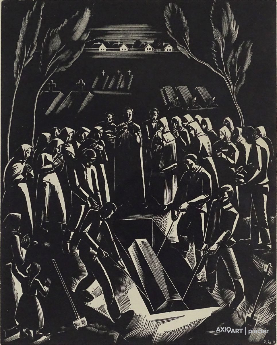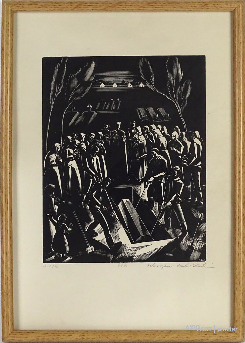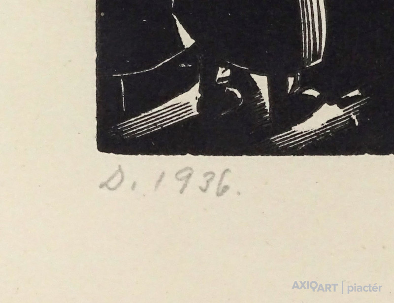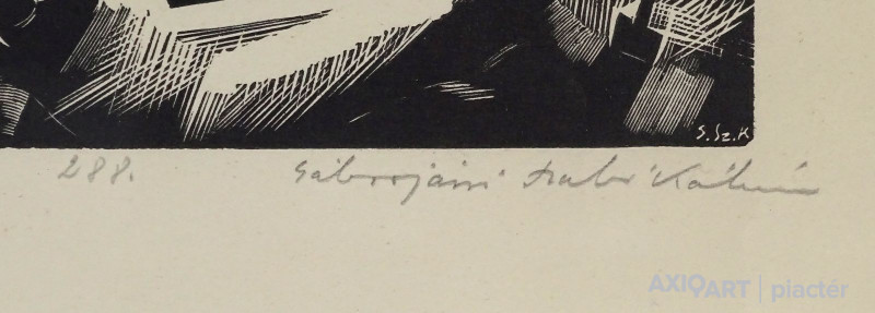 [1J353/080] Sorszámozott papír fametszet üveglap mögött, ezüst színű keretben. Jelezve jobbra lent: GÁBORJÁNI SZABÓ KÁLMÁN Sorszámozás: 2 88 Balra lent ceruzával: 8. 1936 Metszeten belül, jobbra fent: G.SZ.K. Magasság: 24.5 cm Szélesség: 18.5 cm Súly: 0.365 kg Gáborjáni Szabó Kálmán festő, grafikus Debrecen, 1897-09-18 Elhalálozott: Budapest, 1955. június 17. A Magyar Képzőművészeti Főiskolát 1922-ben fejezte be Révész Imre és Vaszary János tanítványaként, akinek tanársegédje is volt a főiskolán. 1922: a Szinyei Társaság ösztöndíja; 1930-1931, 1938-1939: a római Magyar Akadémia ösztöndíja. Tagja volt az Új Művészek Egyesületének, a Magyar Rézkarcoló Művészek Egyesületének. 1922-ben szülővárosában rajztanári állást kapott a Református Kollégium Tanítóképző Intézetében. 1944-1945-ben megbízott igazgatóként irányította a kollégiumot. Ezután rövid ideig a Kultuszminisztériumban dolgozott, majd a Magyar Képzőművészeti Főiskola tanára lett. A 20-as évek elejétől kiállító művész. Az 1930-as évek végétől a szolnoki művésztelepen alkotott, amelynek törzstagja volt. Elsősorban grafikusként ismert, bár életművében jelentős helyet foglalnak el festményei. Készített illusztrációt, kisgrafikát és reklámgrafikát, de legjelentősebbek fametszetsorozatai. Egy rövid ideig a neoklasszicizmus hatása érződik munkáin. Későbbi metszetei drámai ellentétekre épülő, expresszív alkotások. A 30-as, 40-es években gyakran ábrázolta a paraszti életet. Irodalom TÓTH E.: ~ grafikái, Debrecen, 1963 EGRI M.: A szolnoki művésztelep, Budapest, 1977 Magyar művészet 1919-1945, Budapest, 1985. Egyéni kiállítások Egyéni kiállítások 1930 • Scherlhaus, Berlin 1967 • Bakonyi Múzeum, Veszprém. Válogatott csoportos kiállítások Válogatott csoportos kiállítások 1931 • A római Magyar Intézet ösztöndíjas művészeinek első kiállítása, Nemzeti Szalon, Budapest 1932 • XVIII. Velencei Biennálé, Velence • Nemzetközi egyházművészeti kiállítás, Padova 1935 • a Magyar Rézkarcoló Művészek Egyesülete kiállítása, Nemzeti Szalon, Budapest 1932 • Chicago 1934 • Hága • Amszterdam 1941 • 94. csoportkiállítás, Nemzeti Szalon, Budapest (nagyobb anyaggal) 1948 • a Rippl-Rónai Társaság kiállítása, Nemzeti Szalon, Budapest 1950 • 1. Magyar Képzőművészeti kiállítás, Műcsarnok, Budapest 1955 • Képzőművészetünk tíz éve, Műcsarnok, Budapest 1977, 1978 • A Szolnoki Művésztelep Jubiláris Kiállítása, Damjanich János Múzeum • Szolnoki Galéria, Szolnok • Magyar Nemzeti Galéria, Budapest 1983 • Római iskola I., Keresztény Múzeum, Esztergom. Művek közgyűjteményekben Művek közgyűjteményekben Tornyai János Múzeum, Hódmezővásárhely Janus Pannonius Múzeum Modern Magyar Képtár, Pécs  Forrás: artportal.hu