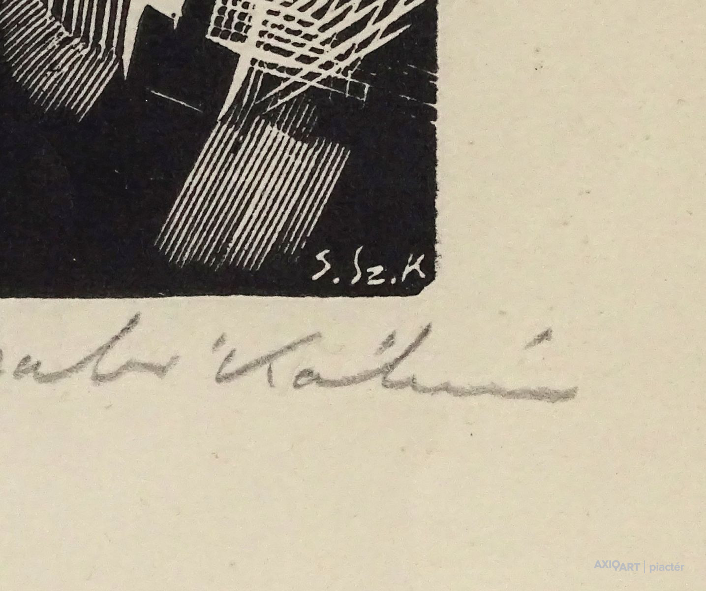 [1J355/112] Sorszámozott papír fametszet üveglap mögött, hibátlan keretben. Akasztási lehetőséggel rendelkezik. Jelezve jobbra lent: GÁBORJÁNI SZABÓ KÁLMÁN Sorszámozás: 2 88 Balra lent ceruzával: 8. 1936 Metszeten belül: G.SZ.K. Magasság: 31.5 cm Szélesség: 22.5 cm Súly: 0.53 kg Gáborjáni Szabó Kálmán festő, grafikus Debrecen, 1897-09-18 Elhalálozott: Budapest, 1955. június 17. A Magyar Képzőművészeti Főiskolát 1922-ben fejezte be Révész Imre és Vaszary János tanítványaként, akinek tanársegédje is volt a főiskolán. 1922: a Szinyei Társaság ösztöndíja; 1930-1931, 1938-1939: a római Magyar Akadémia ösztöndíja. Tagja volt az Új Művészek Egyesületének, a Magyar Rézkarcoló Művészek Egyesületének. 1922-ben szülővárosában rajztanári állást kapott a Református Kollégium Tanítóképző Intézetében. 1944-1945-ben megbízott igazgatóként irányította a kollégiumot. Ezután rövid ideig a Kultuszminisztériumban dolgozott, majd a Magyar Képzőművészeti Főiskola tanára lett. A 20-as évek elejétől kiállító művész. Az 1930-as évek végétől a szolnoki művésztelepen alkotott, amelynek törzstagja volt. Elsősorban grafikusként ismert, bár életművében jelentős helyet foglalnak el festményei. Készített illusztrációt, kisgrafikát és reklámgrafikát, de legjelentősebbek fametszetsorozatai. Egy rövid ideig a neoklasszicizmus hatása érződik munkáin. Későbbi metszetei drámai ellentétekre épülő, expresszív alkotások. A 30-as, 40-es években gyakran ábrázolta a paraszti életet. Irodalom TÓTH E.: ~ grafikái, Debrecen, 1963 EGRI M.: A szolnoki művésztelep, Budapest, 1977 Magyar művészet 1919-1945, Budapest, 1985. Egyéni kiállítások Egyéni kiállítások 1930 • Scherlhaus, Berlin 1967 • Bakonyi Múzeum, Veszprém. Válogatott csoportos kiállítások Válogatott csoportos kiállítások 1931 • A római Magyar Intézet ösztöndíjas művészeinek első kiállítása, Nemzeti Szalon, Budapest 1932 • XVIII. Velencei Biennálé, Velence • Nemzetközi egyházművészeti kiállítás, Padova 1935 • a Magyar Rézkarcoló Művészek Egyesülete kiállítása, Nemzeti Szalon, Budapest 1932 • Chicago 1934 • Hága • Amszterdam 1941 • 94. csoportkiállítás, Nemzeti Szalon, Budapest (nagyobb anyaggal) 1948 • a Rippl-Rónai Társaság kiállítása, Nemzeti Szalon, Budapest 1950 • 1. Magyar Képzőművészeti kiállítás, Műcsarnok, Budapest 1955 • Képzőművészetünk tíz éve, Műcsarnok, Budapest 1977, 1978 • A Szolnoki Művésztelep Jubiláris Kiállítása, Damjanich János Múzeum • Szolnoki Galéria, Szolnok • Magyar Nemzeti Galéria, Budapest 1983 • Római iskola I., Keresztény Múzeum, Esztergom. Művek közgyűjteményekben Művek közgyűjteményekben Tornyai János Múzeum, Hódmezővásárhely Janus Pannonius Múzeum Modern Magyar Képtár, Pécs  Forrás: artportal.hu