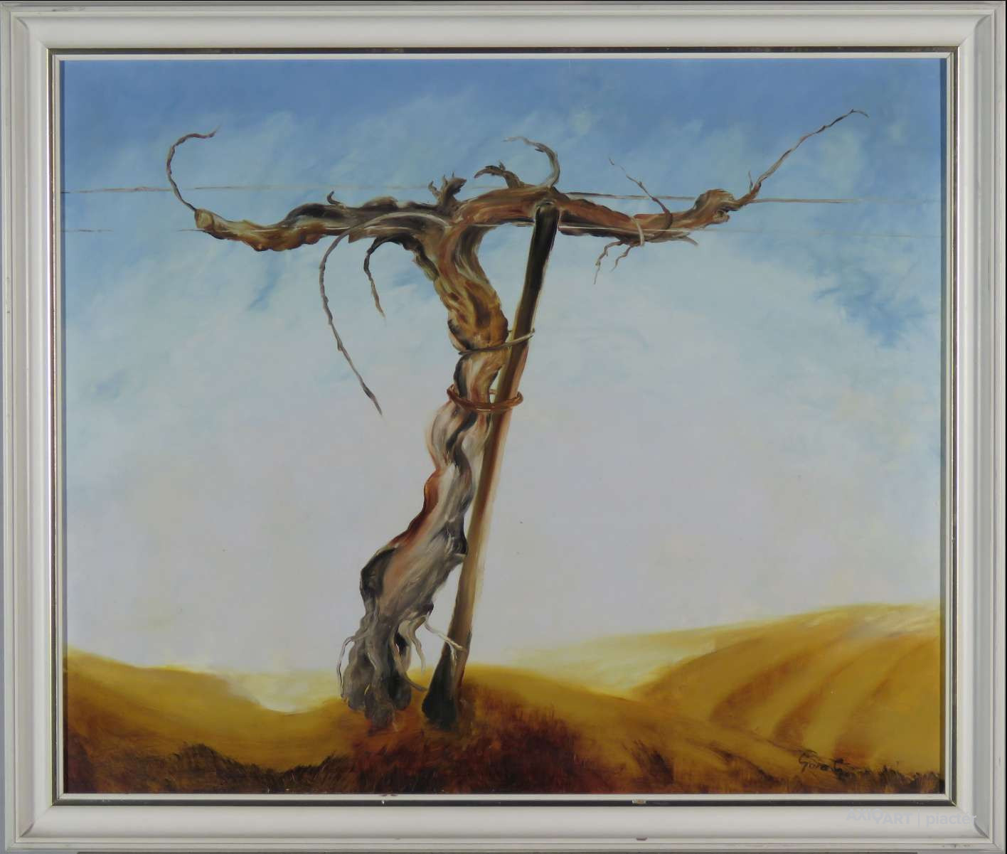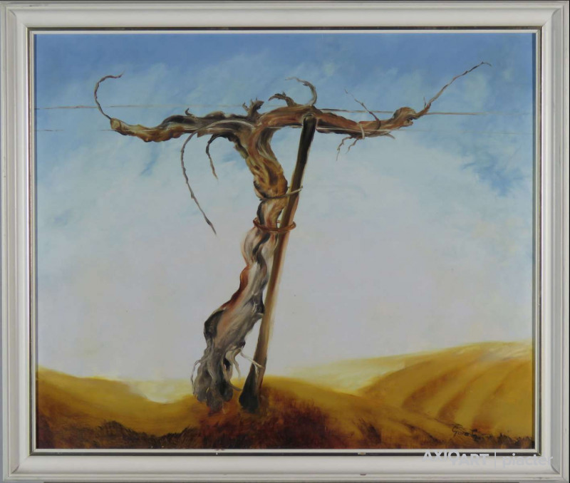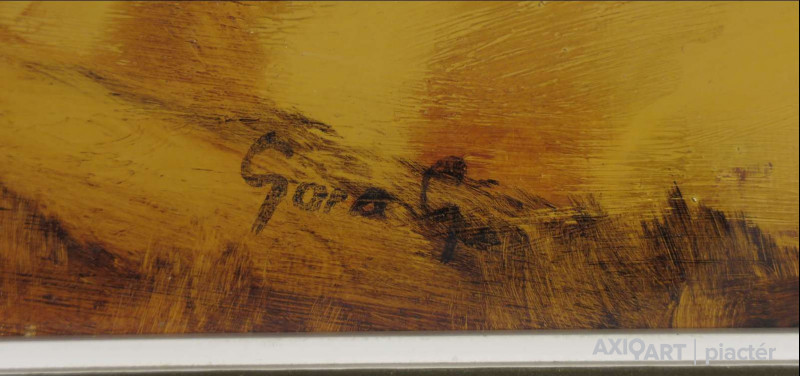 [1Y029/Z018] Olaj farost festmény, üveglap mögött, hibátlan képcsarnokos keretben. Hátoldalán Képcsarnok Vállalat papír címkéje: A művész neve: SCHÉNER MIHÁLY A kép címe: TÁJ Magasság: 66.5 cm Szélesség: 86 cm Súly: 6.54 kg Schéner Mihály festő, grafikus, szobrász, keramikus, bábtervező Medgyesegyháza, 1923-01-9 Elhalálozott: Budapest, 2009. május 11. Honlap: http://www.kormendigaleria.hu/kiadvany.html 1942-1947: Magyar Képzőművészeti Főiskola, tanára: Rudnay Gyula. 1978: Munkácsy-díj; 1984: érdemes művész; 1989: kiváló művész; 1995: Kossuth-díj. 1992-től a Magyar Művészeti Akadémia, 1993-tól a Széchenyi Irodalmi és Művészeti Akadémia tagja. 1956-ig tanított. 1982: Nagyatádi Faszobrász Alkotótelep, 1985: Nemzetközi Acélszobrász Alkotótelep, Dunaújváros. A stílusában felismerhető, mégis sokféle műtárgyat létrehozó ~ gazdag, állandóan alakuló életműve a folyton változó világban helyét kereső, az alkotói szabadságot megvalósító XX. századi képzőművész példázata lehetne. Magát expresszív-szürrealista alkotónak nevezi. Egyaránt dolgozik festékkel, textillel, fával, fémmel. Rajzol, szerkeszt, farag, épít, gyúr, varr és ragaszt, felhasználja a mézesbábok öntőformáit. Festő, rajzoló, textilszobor- és bábkészítő, fazekas, asztalos, esztergályos. Háromlépcsős folyamatban gondolkozik: rajzban tervez, majd fest, szobrot készít, “formába önt”, mindig a végső plasztikai megoldást keresi. Ami állandó és mégis játékosan változékony megjelenésű Schéner művészetében, az a gyermekkori emlékek által meghatározott népi mesterségek iránti tiszteletet kifejező motívumkincs, a tárgyi folklór formakészlete, amely már-már kézjegyként ismétlődik munkáin. Mitologikussá nőtt képzelete új lényeket teremt, pl: a Pigulát, amely disznótestű, emberfejű teremtmény. Schéner festményein a szürrealista motívumokat konstruktív szerkezetbe rendezi, a geometriát és az organikus természeti motívumokat egyaránt beépíti műveibe. A népi, népművészeti formakincsből merített lovas huszárok, betyárok, szegénylegények cifra szűr mentéje, piros csákója, fekete csizmája, az önálló életet élő zsinórdíszek és mézeskalács bábok, a kiskocsik a gyermekkori vásárok, búcsúk színes forgatagába vezet. A primér motívumokat aztán felváltják a vastagon felhordott felületbe karcolt jelek, vonalhálózatok, amelyek a játszó gyermek homokba rajzolt ábráit, a pásztorember fába vésett üzeneteit, az ősember barlang falába rótt mágikus jeleneteit idézik meg. A művész pillanatnyi érdeklődésének megfelelően a színek búvópatakként tűnnek el és jelennek meg ismét. A 60-as években leginkább a formákkal való játék érdekelte, a festmények felülete egyre gazdagodott: a táblaképek felületén applikációk jelentek meg, vagy lemállasztott rétegek hagyták maguk után hiányukat, motívumok nélküli ősformák, archetipikus képzetek bukkantak fel művészetében. A véletlenszerűnek látszó rétegekkel való játék azonban tudatos komponálás eredménye, amely később nyilvánvaló ritmusnak és formai szerkesztettségnek adja át a helyét, mint a Törvénytáblák c. sorozaton. A különböző művészi kifejezési formák egymásra termékenyítő hatással vannak, át- meg áthatják egymást. Textilszobrai, amelyekkel új műfajt teremtett, ugyanazzal az automatikus, expresszív-szürrealista módszerrel készülnek, mint festményei. A hagyományosan a népművészetben alkalmazott anyag, a filc lehetőséget ad a népi formakincs felelevenítésére, amely azonban a művész különös szürrealista átiratában jelenik meg. A szívekkel kivarrt, zsinórdíszes Posztókotlós c. művén mézesbábok lógnak, hátán huszárok lovagolnak. Egész sor textilből készült kéz-plasztikát alkot, amelyeket az ujjakra rávarrt díszekkel öltöztet, személyesít meg. A színes-különös világból aztán ~ újra puritán képi és formai rendbe juttatja el a nézőt, majd nemsokára tépett, gyűrt, vágott, csorgatott, repedezni hagyott szenvedélyesen vonagló képi felületeket hagy hátra. Schéner készített apró gyermekjátékokat, térstruktúra-tereket, mászókákat is. A magyar népi formák mellett szürreális játékaiban gyakran alkalmaz görög mitológiai alakokat, “elkentaurosodott” lovakat, Gorgó-fejeket, sellőket, hárpiákat, Pán-ábrázolásokat. Schéner nemcsak saját művészetéről publikál, hanem művésztársairól is számos írása jelenik meg, elsősorban az Új Auróra c. folyóiratban, amelynek egy ideig főmunkatársa volt. Irodalom kiállítása, Magyar Építőművészet, 1962/4. Húsz év után, Művészet, 1965/4. BOZÓKY M.: ~, Tiszatáj, 1968/5. PERNECZKY G.: Nincs uborkaszezon, Élet és Irodalom, 1969. augusztus 8. BARÁNSZKY-JÓB L.: ~, Művészet, 1969/9. LÁSZLÓ GY.: ~ kaposvári kiállítása, Jelenkor, 1969/4. MAJOR M.: Pásztorok, betyárok, huszárok - kezek, Tükör, 1970. szeptember 15. FRANK J.: Bemutatjuk ~t, Élet és Irodalom, 1972. május 6. ról kiállítása ürügyén, Képzőművészeti Almanach, Budapest, 1972 Sötétkék kokasok, Élet és Irodalom, 1973. szeptember 9. MAJOR M.: ~ játékai, Élet és Irodalom, 1974. július 27. BARTA J.: Egy különös művész, Alföld, 1974/6. VADAS J.: Szárnykészítők, Élet és Irodalom, 1975. október 4. JUHÁSZ F.: A halál ellen játszani, Élet és Irodalom, 1975. május 17. PAP G.: Kincsek és műkincsek, Művészet, 1975/6. P. SZŰCS J.: Az utak kettéválnak, Művészet, 1978/3. Békési művészet, Művészet, 1978/7. SZAMOSI F.: ~ [kismonográfia], Budapest, 1978 VADAS J.: Játék a játékkal, Élet és Irodalom, 1979. augusztus 18. NÉMETH L.: ~ műveiről, Művészet, 1979/4. MIKLÓS P.: Mit akar ez a múzeum?, Művésze