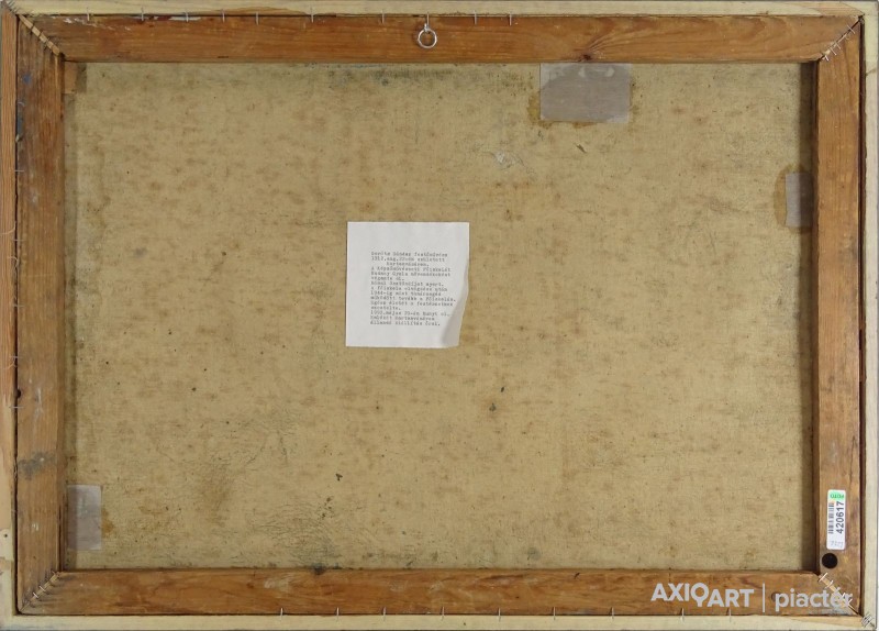 [FK0037/Z018] A kép mérete: 50 x 70 cm keret nélkül. Készült: Olaj, Vászon A kép Paizs László (Szentpéterúr, 1935) alkotása. Jelezve Jobbra lent "P. L." A festmény jó állapotban van. Keret: Ép A festmény hátoldalán a Képcsarnokvállalat címkéje található. Magyar festők és grafikusok életrajzi lexikona I-II. Festő. Tanulmányait a budapesti Iparművészeti Főiskolán végezte 1959-ben. Z. Gács György, Rákosy Zoltán és Szentiványi Lajos növendéke volt. A '60-as évek első felében hagyományosabb felfogású olajképeket festett, mozaikokat, freskókat, utóbb a pop-art körébe tartozó, a francia Arman munkáival rokon műveket alkotott. 1961 óta kiállító művész. Egyéni (Fényes Adolf Terem, Csók Galéria, Műcsarnok, Magyar Nemzeti Galéria, Halászbástya, Bástya Galéria, Vigadó Galéria, Budapest Galéria, Győr, Szombathely, Szeged, Zalaegerszeg, Duisburg, Aix-en-Provence, stb). és vegyes (Ernst Múzeum, Műcsarnok, Óbuda Galéria, Magyar Nemzeti Galéria, Csók Galéria, Vigadó Galéria, Székesfehérvár, Kaposvár, Pécs, Hódmezővásárhely, Firenze, Milano, Padova, Nápoly, Velence, Düsseldorf, Aachen, Genf, stb) tárlatokon vett részt. 1980-ban Munkácsy-díjjal jutalmazták, 1988-ban Érdemes Művész kitüntető elismerésben részesült. Munkáit őrzi a Magyar Nemzeti Galéria, a Fővárosi Képtár, a szombathelyi képtár, a pécsi Janus P. Múzeum, a székesfehérvári István Király Múzeum és a dunaszerdahelyi Kortárs Magyar Galéria. (H.B.: Műv, 1972/4, K.Gy.: Műv. 1977/2, K.G.: Műv. 1978/10, M.L.: Műv, 1983/5, R.G.: Műv, 1987/9, Sz.Gy.: Új Műv. 1995/4, MK) Magyar festők és grafikusok életrajzi lexikona I-II. Műgyűjtők és kereskedők kézikönyve Festő. Tanulmányait a bp.-i Iparművészeti Főiskolán végezte. Mozaikokat ferskókat, utóbb a pop-art körébe tartozó, a francia Arman műveivel rokon műveket alkotott. Mozaikok: a Szegedi Megyei Tanács, a Pécsi Óvoda, a Gödöllői Agrártudományi Egyetem. Freskók: Budapest - Csatárka úti Gyermekotthon. 1971-ben a Fényes Adolf Teremben volt kiállítása, 1983-ban pedig a szegedi Móra Ferenc Múzeumban nagyszabású tárlatokon mutatta be munkáit. 1988-ban érdemes művész kitüntető elismerésben részesült. (MK) Magyar festők és grafikusok adattára Az Iparművészeti Főiskolán végzett 1959-ben. Mozaikokat (Szeged, Megyei Tanács; Pécs, Óvoda; Gödöllő, Agrártudományi Egyetem), freskókat (Budapest, Csatárka úti Gyermekotthon), újabban a pop art körébe tartozó, a francia Arman műveivel rokon műveket alkotott. 1971-ben a Fényes Adolf Teremben nyílt kiállítása. 1983 februárjában a szegedi Móra Ferenc Múzeumban megrendezett nagyszabású tárlaton mutatta be alkotásait. 1988-ban érdemes művész kitüntető elismerésben részesült. - MK Művészeti lexikon I-IV. (Szentpéterur, 1935. dec. 26.- ): festő. Az Iparművészeti Főiskolán 1959-ben végzett Rákosy Zoltán, Z. Gách György és Szentiványi Lajos növendékeként. Épületdiszítő mozaikokat, (Szeged, Megyei Tanács, 1961; Pécs, Óvoda, 1964), műanyagfreskókat (Bp., Csatárka úti Gyermekotthon, 1964) és gobelinterveket készít. Kortárs magyar művészeti lexikon I-III. Festő, szobrász, grafikus. 1959: MIF, mesterei: Z. Gács György, Rákosy Zoltán, Szentiványi Lajos. 1980: Munkácsy-díj; 1988: érdemes művész. Főiskolás éveinek második felében, majd azt követően számos murális munka kivitelezésében vett részt, Fónyi Géza, Konecsni György, Z. Gács György, Rákosi Zoltán és Domanovszky Endre mellett dolgozva. A 60-as évek első felének hagyományosabb fölfogású olajképeket festett. 1964-ben a Velencei B.-n megismerkedett az amerikai pavilonban a pop art Európában akkor még újnak számító törekvésével, és részben ez inspirálta, hogy 1967-ben textil, fém, bőr anyagú "varrottas" képeket küldjön az FKS éves tárlatára; a megnyitó előtt többek között az ő munkáit is eltávolították a falról. A 70-es években pop art-os objekteket (A trónörököspár politikai gyilkosság áldozata lett, 1970, plexiüveg, újság, szarvasbogarak), majd konstruktív, átlátszó plexiüveg plasztikákat készített belső fénytörő határfelületekkel. A 80-as években készültek az anyagában színezett, konstruktív, nagyméretű poliészter szobrai, majd színes poliészter táblaképeket alkotott, mesterségesen roncsolt felületekkel, mintha régészeti leletek vagy atomtámadás utáni festmény-szurrogátumok lennének. Ekkor kezdett organikus plaszikájú bronzszobrokat is mintázni. A 90-es években, a táblaképek és szobrok mellett nagyméretű, egyedi grafikákat készített, formavilágában némileg a roncsolt táblaképekből kiindulva, de szinte kizárólag az emberi alakból elvonatkoztatott torzókat megjelenítve. Ek: 1966: Művészklub, Győr; 1971: Fényes A. T.; 1972: Bercsényi 28-30 G.; 1973: BME B-épület; 1976: Csók G.; 1977: G. Hildebrandt, Duisburg (NSZK); 1979: Bástya G., Halászbástya; Helyőrségi Műv. H., Nagyatád; József A. Műv. Közp., Szeged; Göcsej M., Zalaegerszeg; 1982: Bezzegh G., Küsnacht (CH); 1983: Móra F. M., Szeged; 1987: Műcsarnok (kat.); MNG; 1988: Pandora G., Badacsonytomaj; 1989: Parktheatter, Iserlohn (NSZK); Qualitas G.; Hevesi S. Színház, Zalaegerszeg; 1990: Vasarely Fondation (Ferdinánd Judittal, Fóth Ernővel), Aix-en-Provence (FR); 1994: Vigadó G.; 1997: Pest Center G.; 1998: Budapest G. (kat.); 1999: Pest Center G. (kat); G. Arcis, Sárvár; MMA, Bp.; 2001: SZK, Szhely; Ernst M. (kat.) Vcsk: 1961, 1964, 1966: FKS, Ernst M.; 1962: 9. Magyar Képzőműv. kiállítás, Műcsarnok; 1967: Mai magyar festészet, Új-Delhi; 1969: Vas megyei művészek, Savaria M., Szhely; V. Orsz. Grafikai B., Miskolc; 1971: Új művek, Műcsarnok; 1972: Fiatal művészek Budapestről. Likovni Salon, Újvidék (YU); 1972, 1973: Balatonboglár