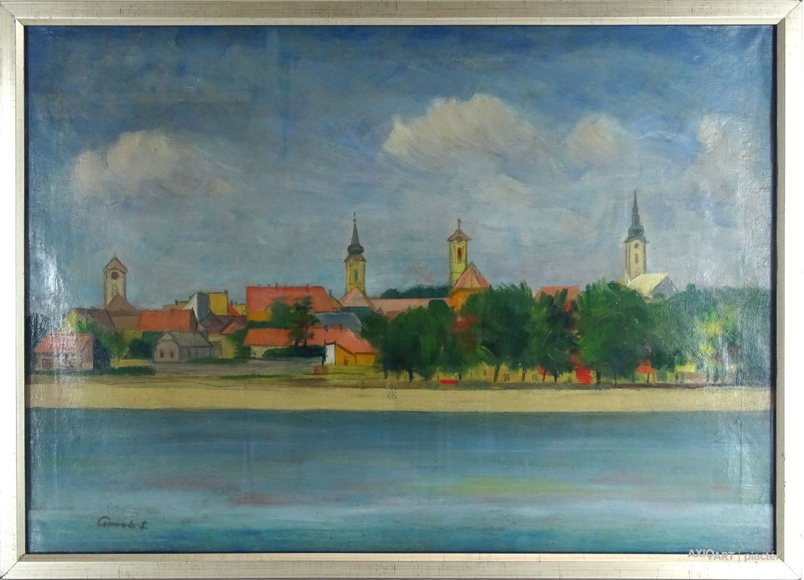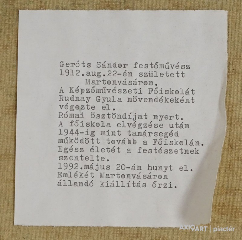 [0W686/W008] Olaj vászon festmény, üveglap mögött, ezüst keretben. Jelzés balra lent: GERÓTS S. Hátoldalon életrajzi címke, (1912-1992) lásd fotó. Magasság: 53 cm Szélesség: 73.5 cm Súly: 3.365 kg
